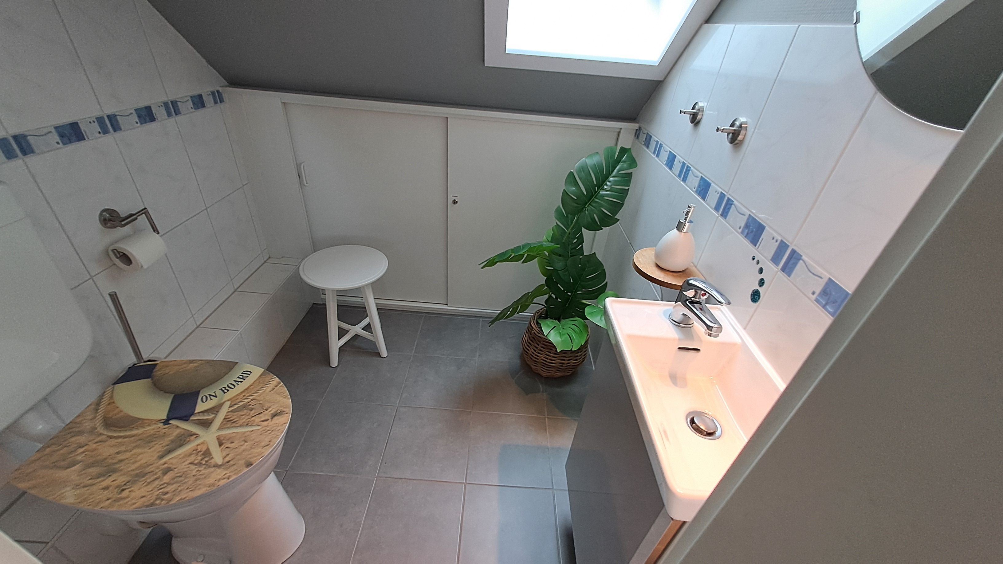 Das WC im Dachgeschoss ist mit Toilette und einem Waschbecken versehen.