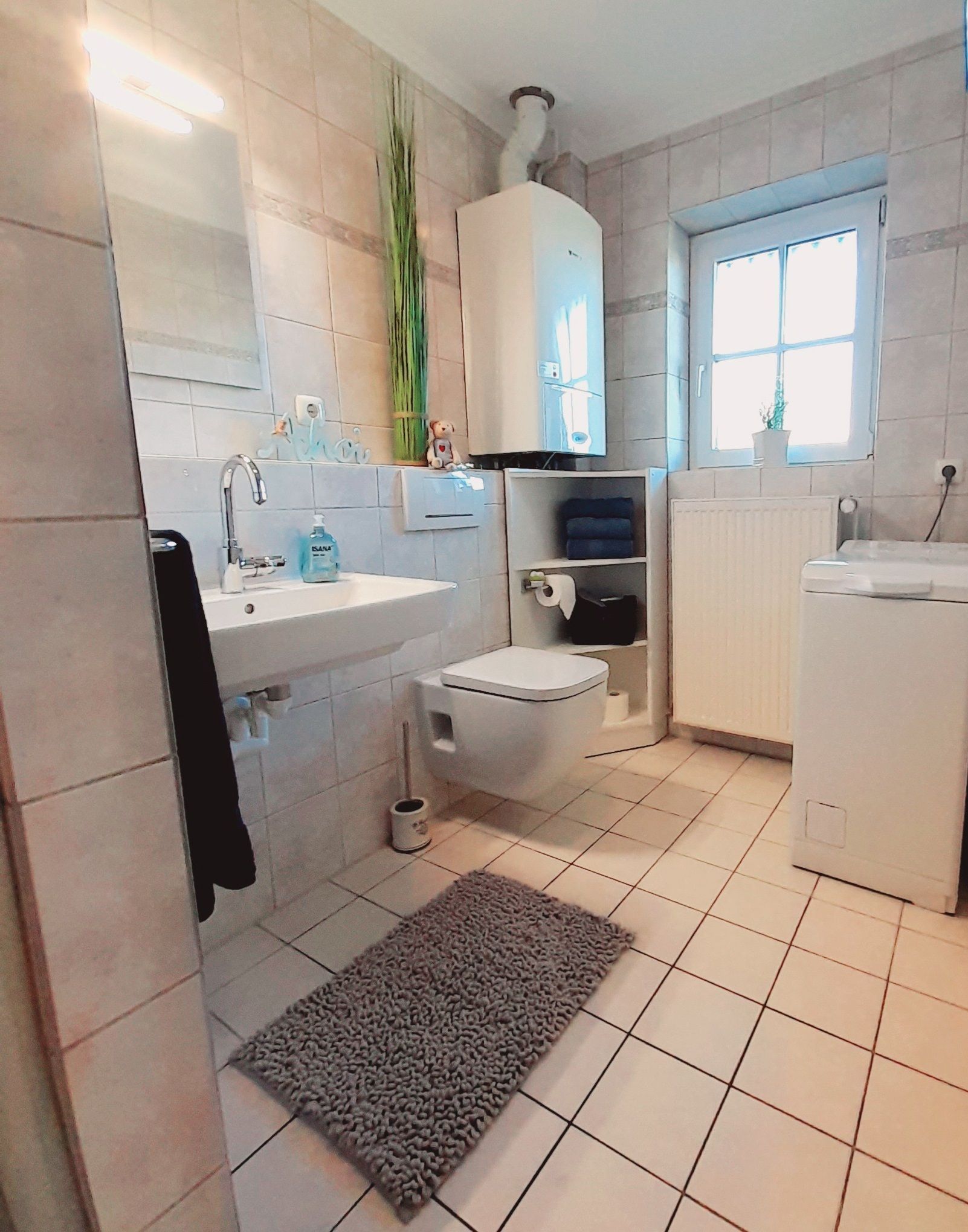 Für die morgendliche oder abendliche Körperpflege gibt es im Erdgeschoss ein klassisches Badezimmer mit Waschbecken, Dusche und WC. Hier befindet sich auch eine Waschmaschine zu eurer Verfügung. Waschmittel befindet sich in der Grundausstattung.