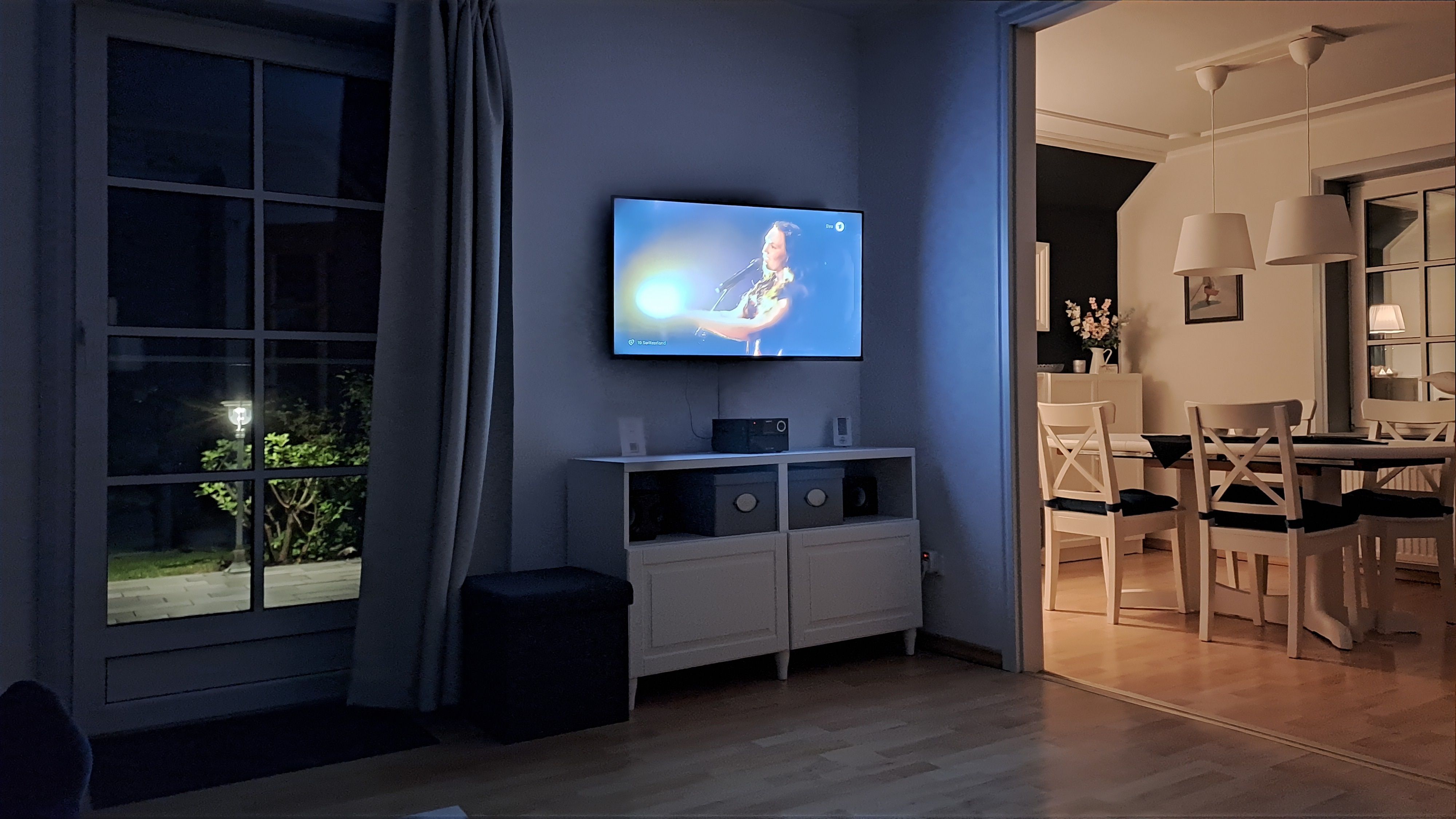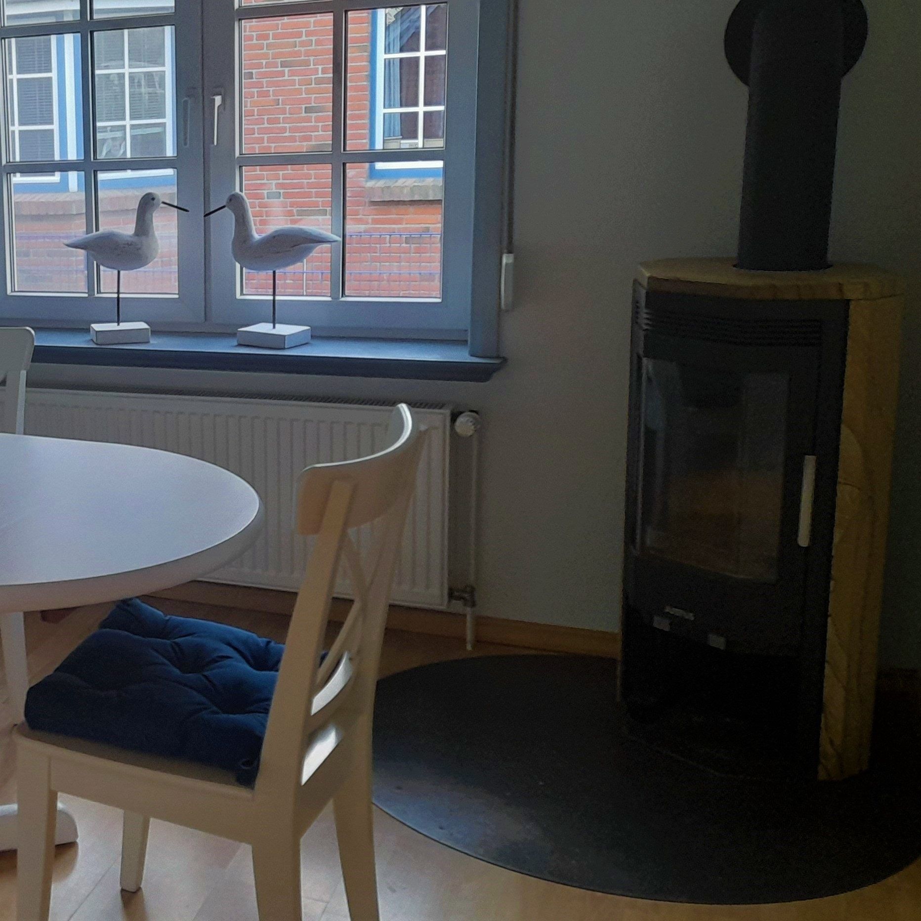 Das Wohnzimmer ist in zwei großzügige, miteinander verbundene Bereiche aufgeteilt. Zum einen mit einer Sofaecke, einem Fernsehbereich (Sat und Nutzung von Streamingdiensten) / eine Musikanlage (Bluetooth, CD, USB) und mit Blick in den Garten. Das ausziehbare Sofa ist ebenfalls für bis zu zwei Personen zum Übernachten oder Chillen vorgesehen. Im angrenzenden zweiten Teil gibt es einen Essbereich mit einem Esstisch, Stühlen und Sideboard mit Spielen und Gläsern für vier Personen sowie einen Kaminofen.
