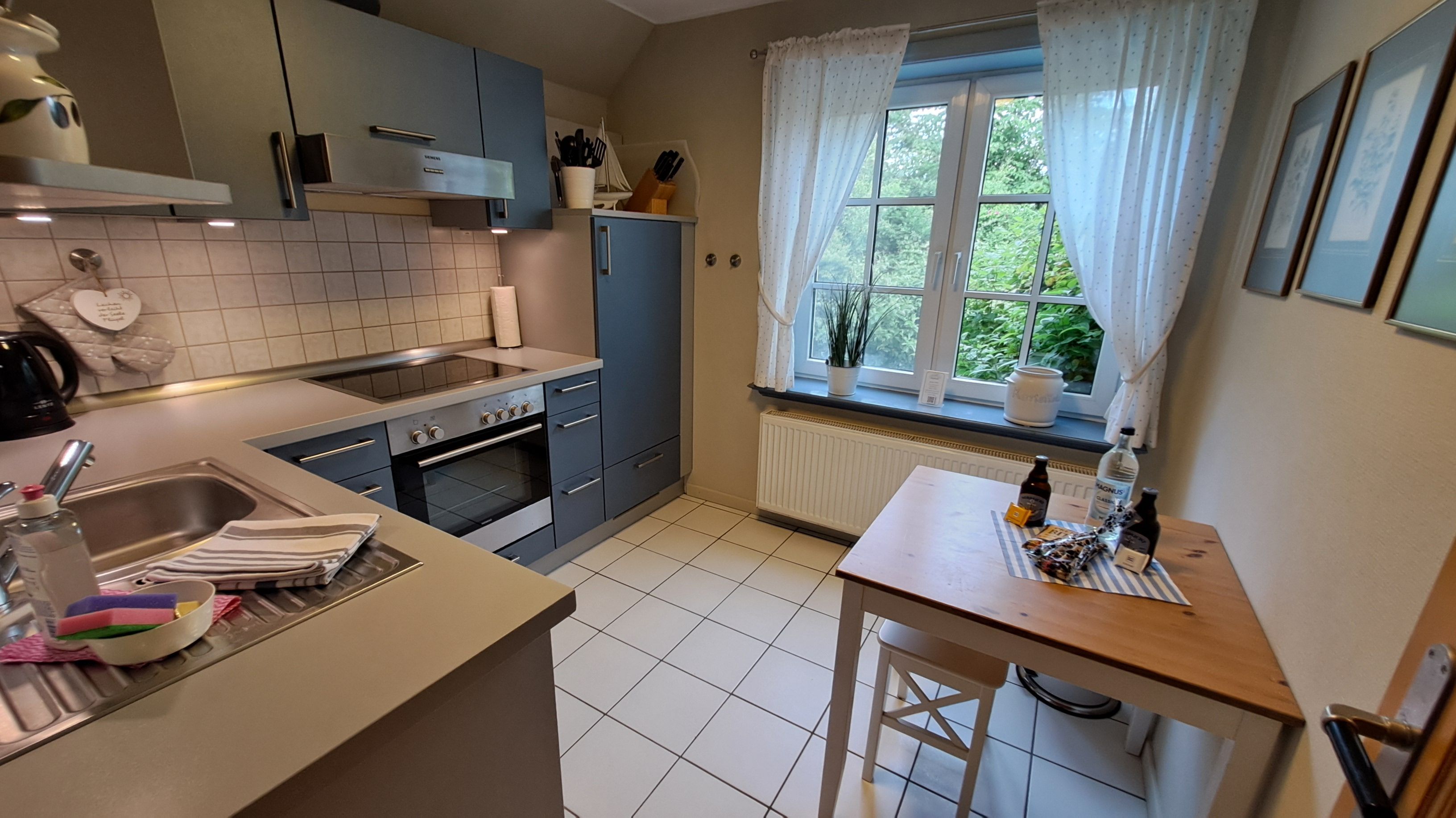 Die moderne Küche ist mit hochwertigem Equipment wie z.B. Geschirrspüler, Stabmixer, Toaster, Kaffeemaschine, Teebereiter, WMF-Kochtöpfen, Messerblock und vielem mehr ausgestattet, so dass es hier an nichts mangeln sollte. In der Grundausstattung sind z.B. Geschirrspültabs, Schwämme, Spülmittel und Gewürze vorhanden.