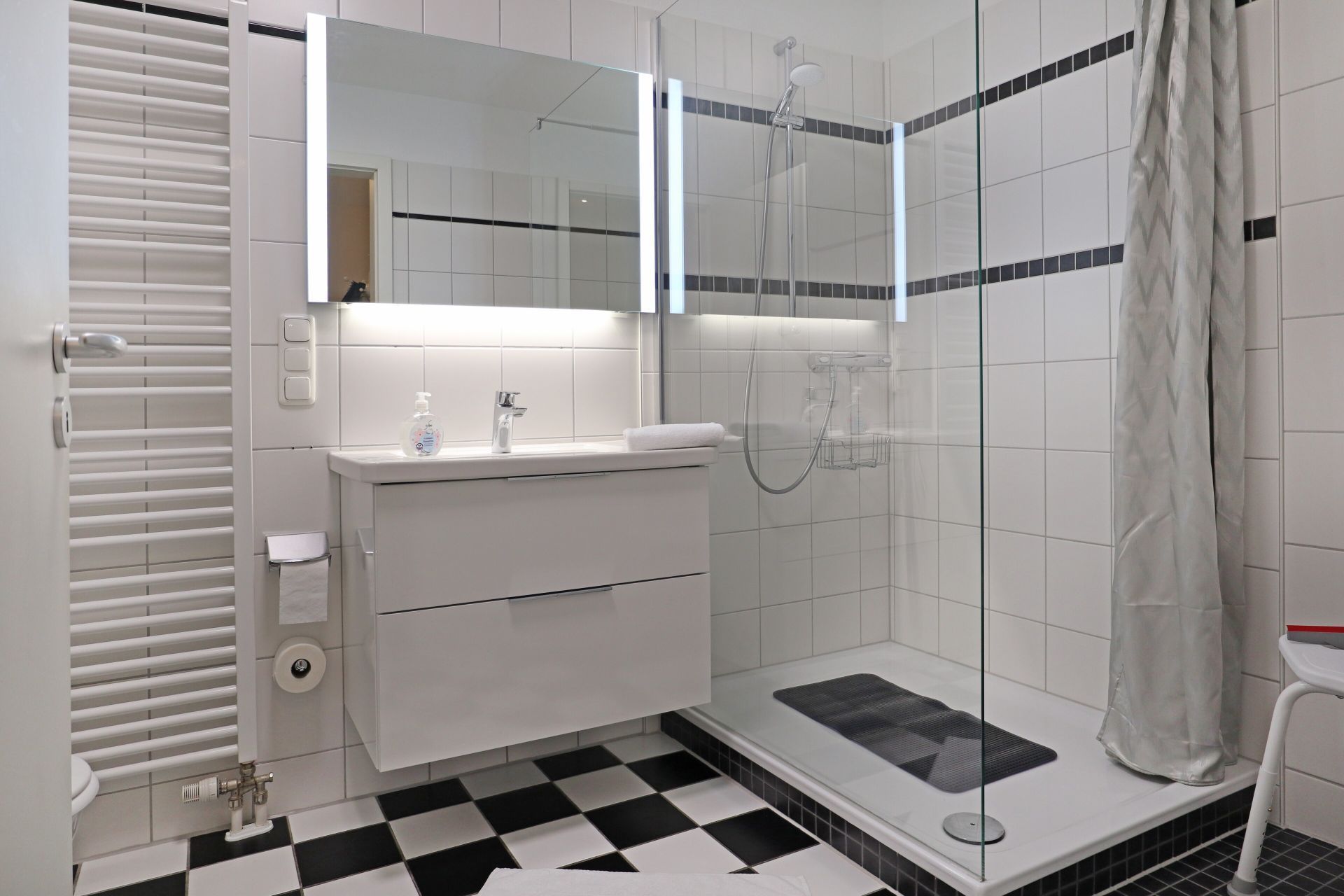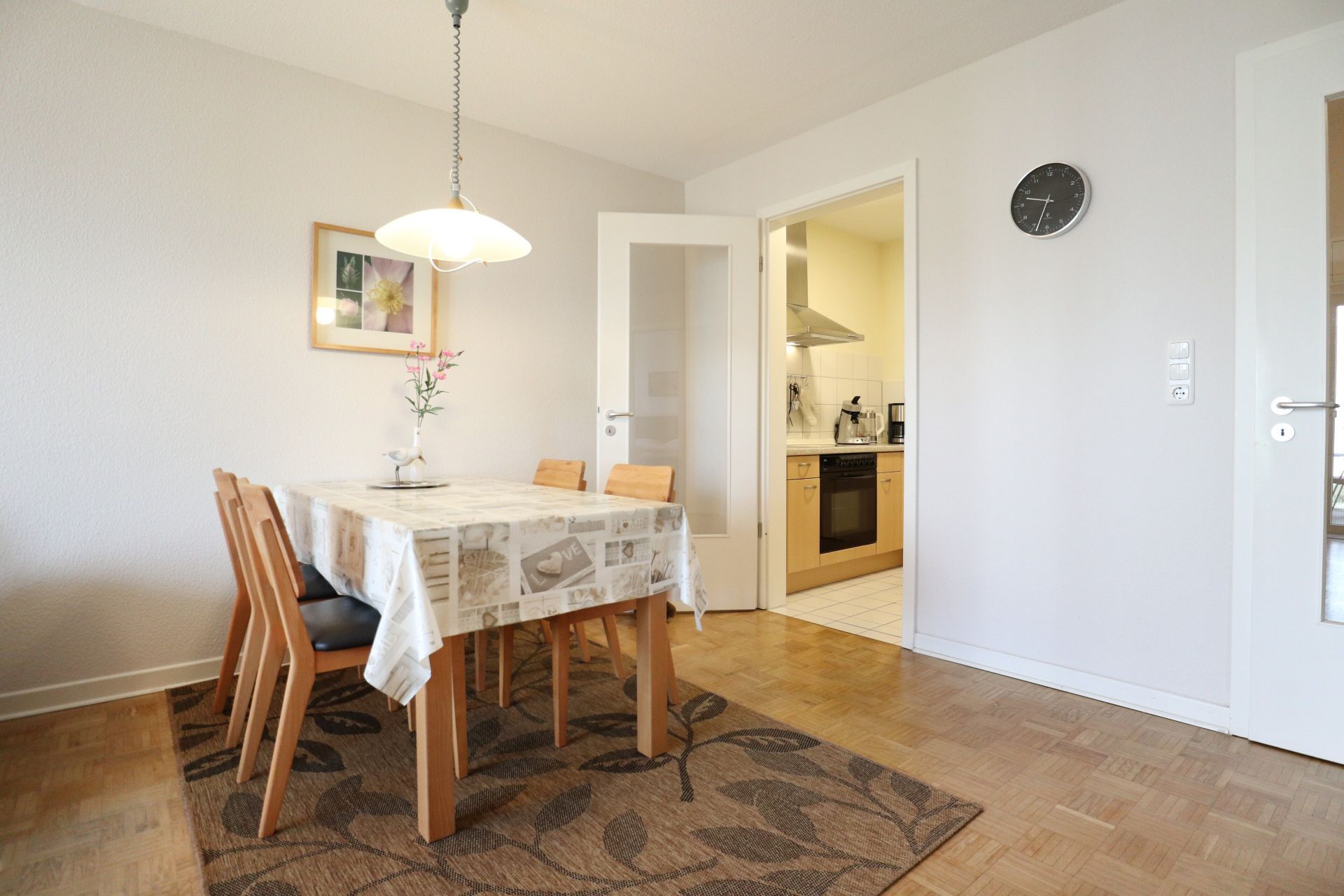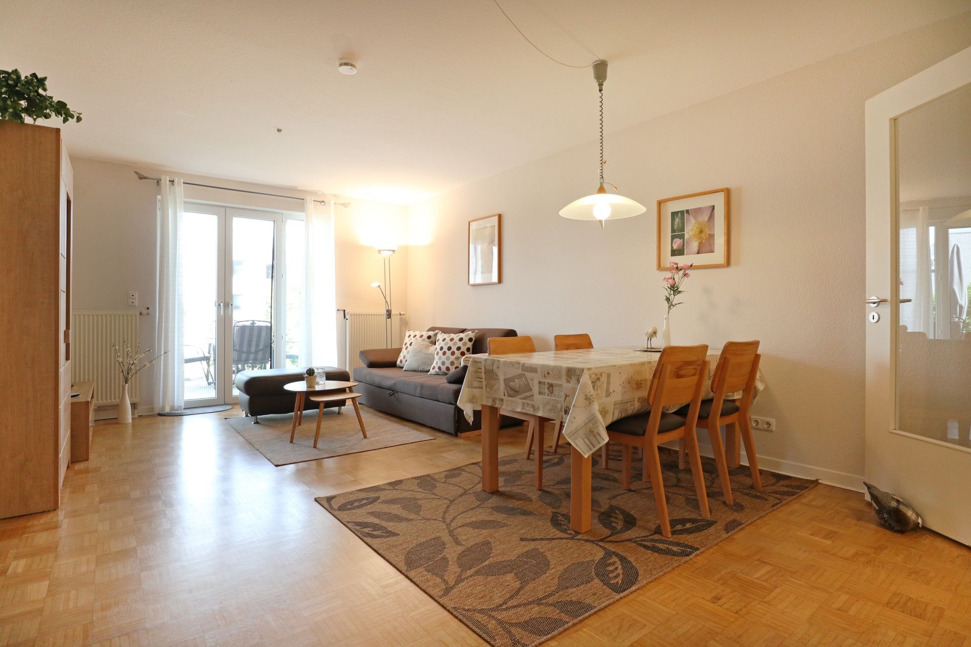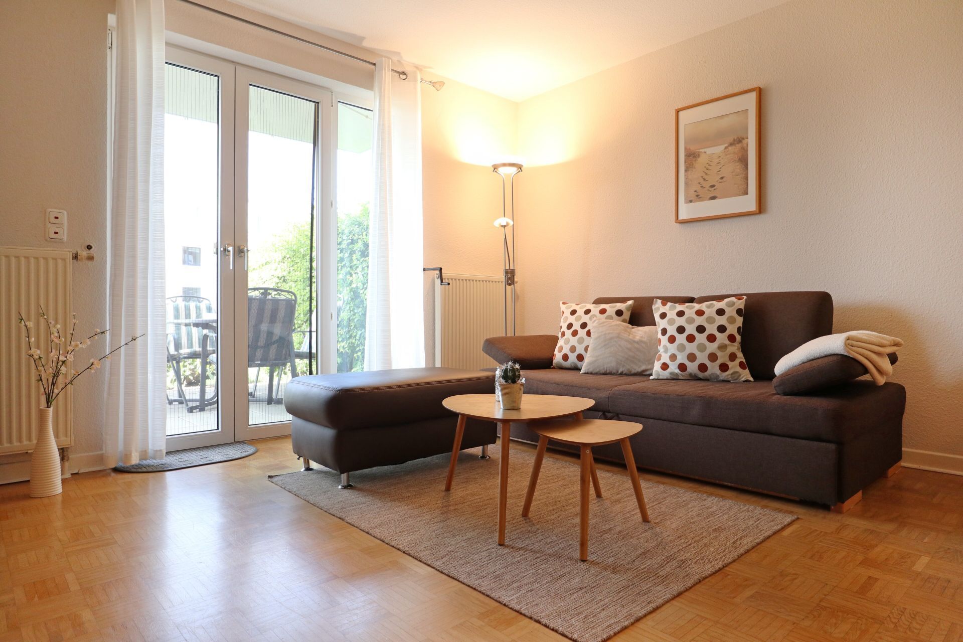 Das 2-Zimmer Appartement Seeschwalbe 4, bietet Ihnen eine Wohnfläche von ca.57qm und ist für eine Belegung mit bis zu 4 Personen geeignet. Mit dem Fahrstuhl gelangen Sie bequem von der Tiefgarage zum Erdgeschoss Appartement. Das komfortabel möblierte Wohn- und Esszimmer ist mit einem Sofa als ausziehbares Schlafsofa für zwei Personen sowie Beistelltisch, Esstisch mit vier Sitzplätzen, Fernseher und Musikanlage ausgestattet. WLAN kann gebührenfrei genutzt werden. Vom Wohnbereich aus gelangen Sie auf die saisonal möblierte Süd Terrasse. In der separaten, voll ausgestatteten Küche bereiten Sie Ihre Urlaubsmahlzeiten zu: Ceranfeldherd, Backofen, Mikrowelle, Kühlschrank mit integr. Gefrierfach, Kaffeemaschine, Wasserkocher, Toaster usw. Ihre Nächte verbringen Sie in einem Komfortschlafzimmer mit Boxspringbett und Kleiderschrank. Zugehörig ist ein modernisiertes Duschbad mit Waschtisch, Handtuchheizung, Föhn, WC und Waschmaschine. Ebenso befinden sich ein Bügeleisen und Bügelbrett in der Wohnung. Für Ihren PKW steht ein Stellplatz in der hauseigenen Tiefgarage zur Verfügung. In der Nichtraucherwohnung sind Haustiere nicht gestattet.