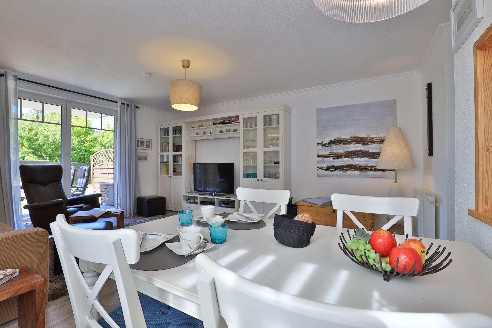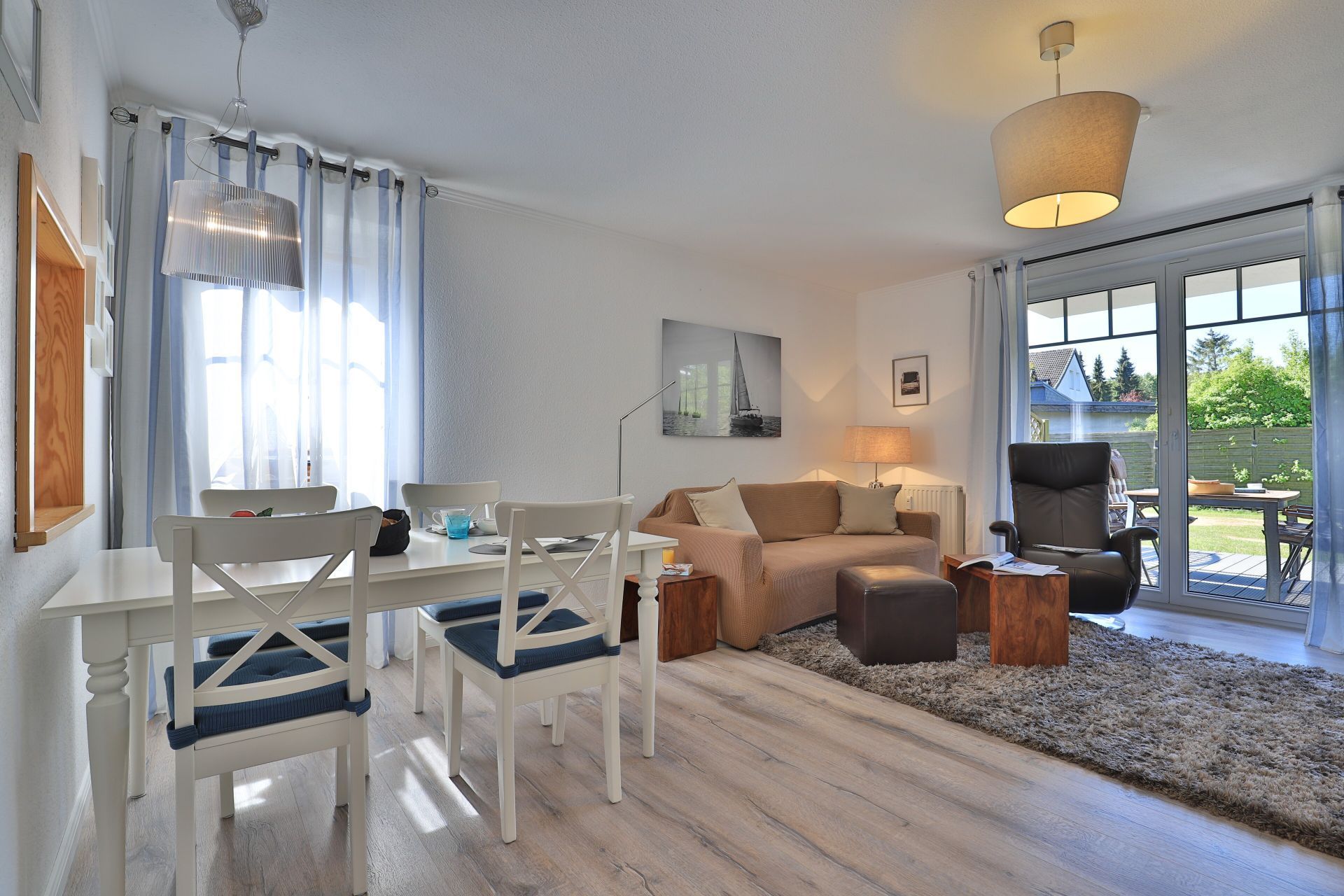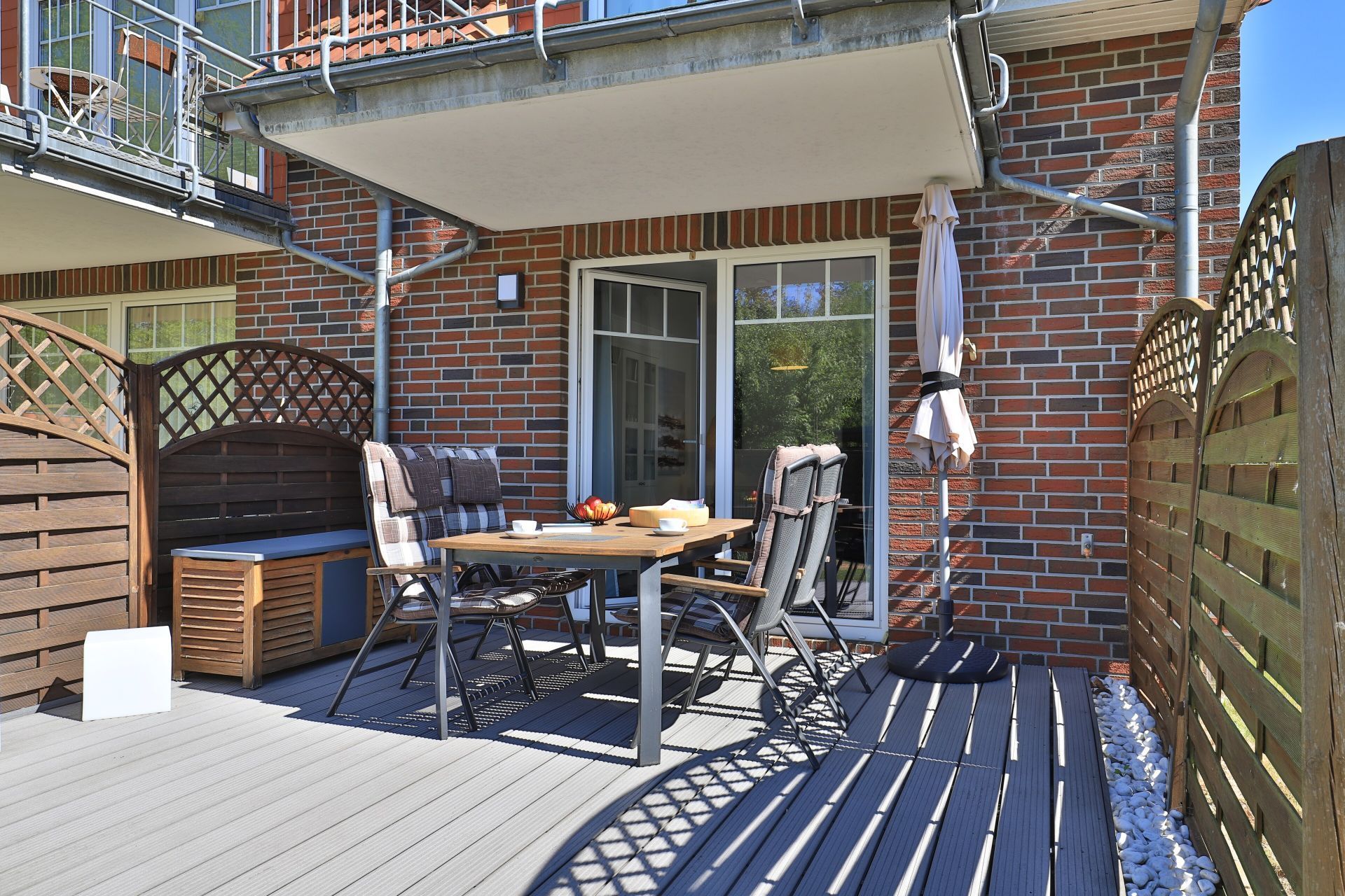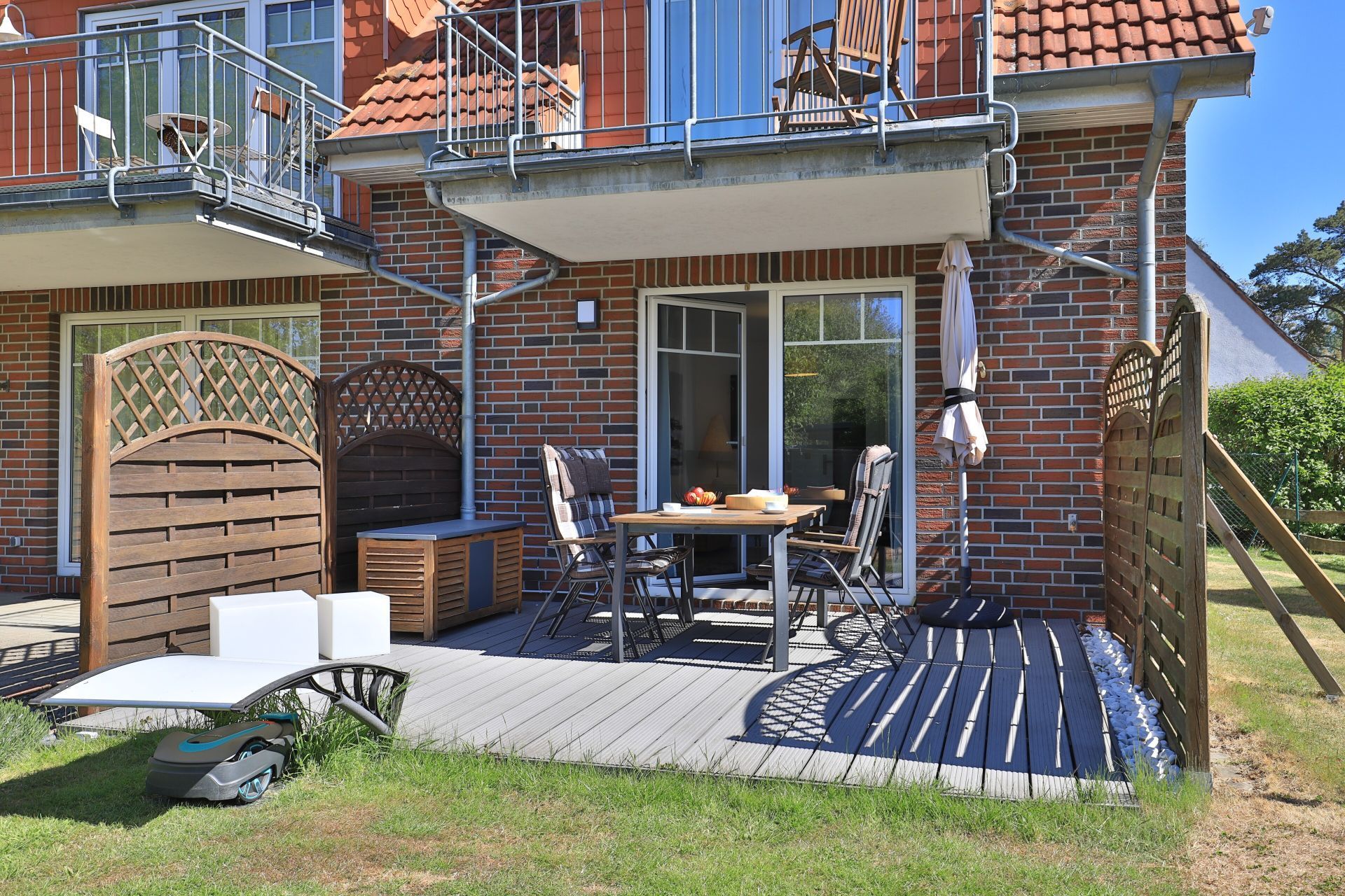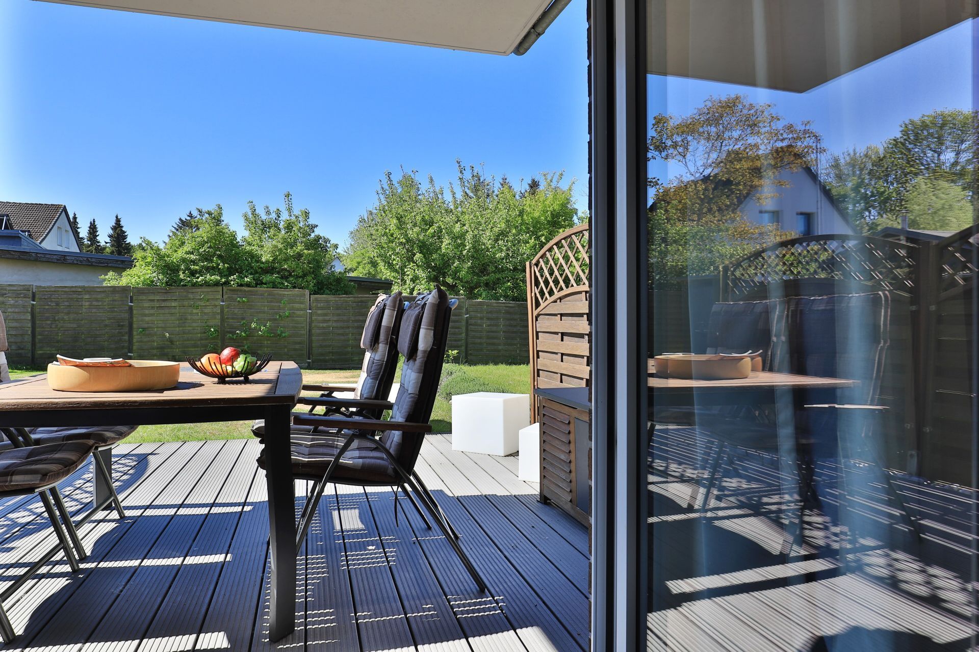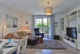 Die 2-Zimmerwohnung bietet eine großzügige Wohnfläche von 60qm und befindet sich im Erdgeschoss des Mehrparteienhauses. Eine Belegung ist mit 2 Personen möglich. Im sehr geschmackvoll möblierten Wohn-/Essbereich empfängt Sie ein Komfortsofa und ein Lesesessel mit Beinablage. Selbstverständlich ist das Appartement auch mit einem Fernseher, Musikanlage sowie WLAN ohne Mehrkosten ausgestattet. In der separaten Küche, die über eine Durchreiche zum Esstisch im Wohnbereich verfügt, können Sie Ihre Urlaubsmahlzeiten zubereiten. Ceranherd, Backofen, Dunstabzug, Kühlschrank mit sep. Gefrierfach, Kaffeemaschine, Wasserkocher, Toaster, Geschirrspüler u.v.m. sind vorhanden. Im Sommer können Sie sich auf der saisonal möblierten Terrasse wunderbar erholen und gerne das angrenzende Rasengrundstück nutzen. Geruhsame Nächte verbringen Sie in einem separaten Schlafzimmer mit Doppelbett ? 180cm mal 200cm-, Kleiderschrank und Kommode. Zugehörig ist ein modernes Duschbad mit Fenster, Waschtisch, Föhn, WC. Auch eine Waschmaschine, Bügeleisen und Bügelbett stehen zu Ihrer Verfügung. Im Safe sichern Sie persönliche Wertsachen.