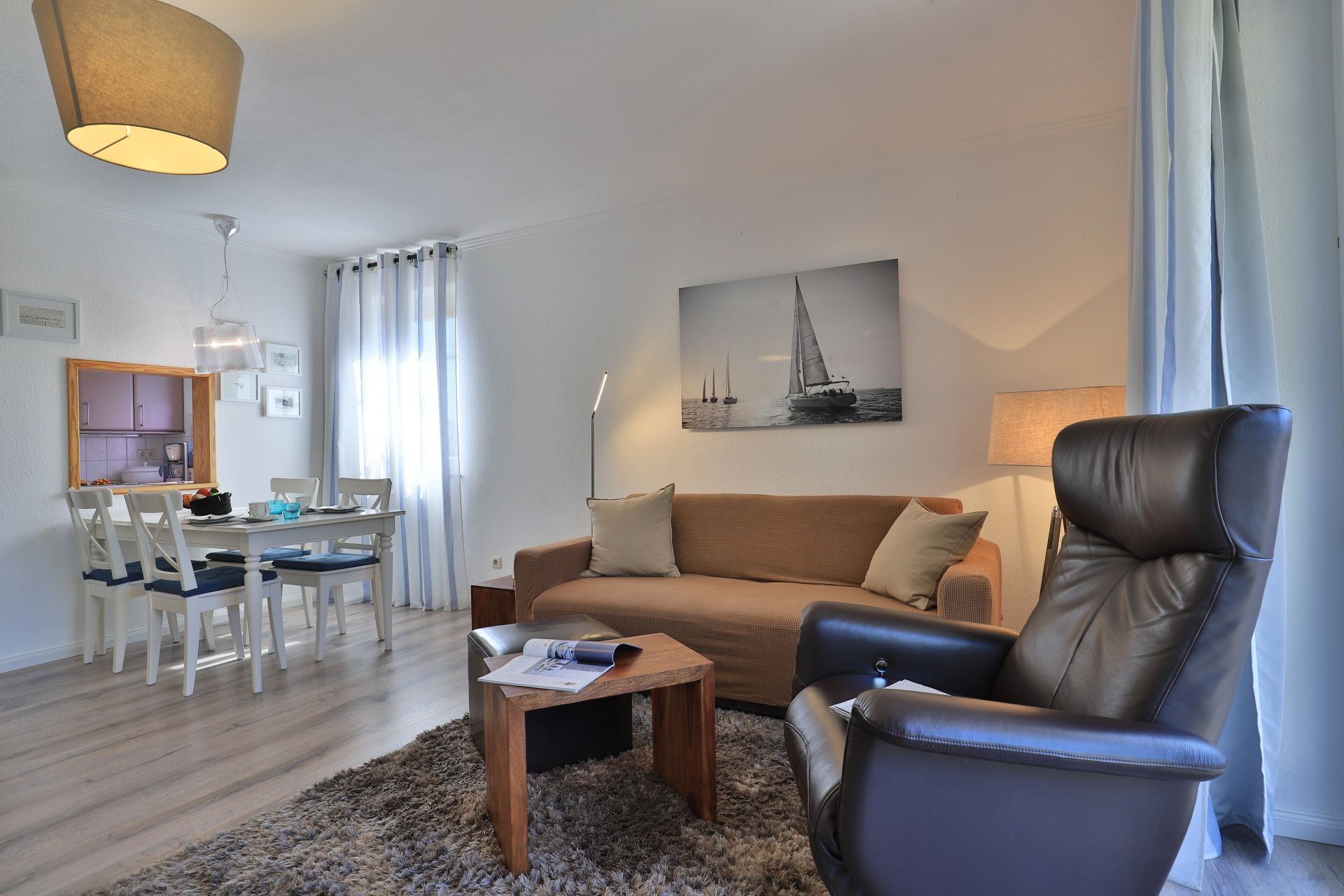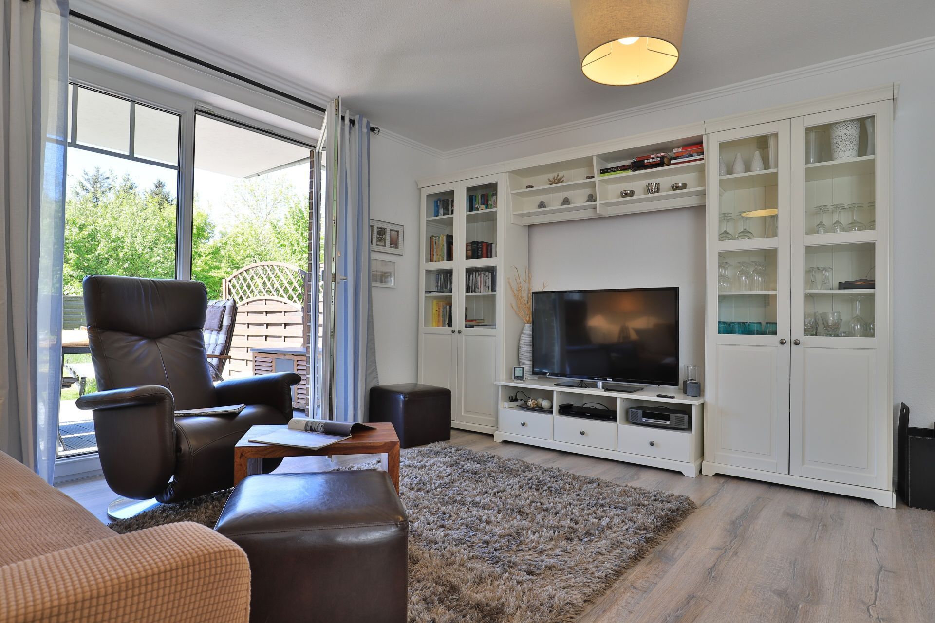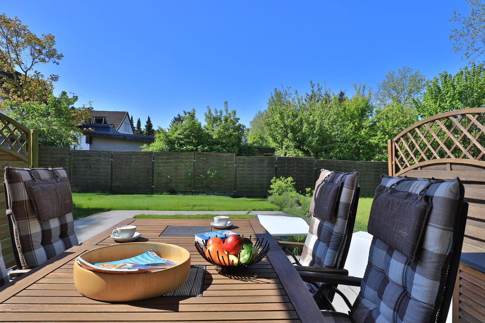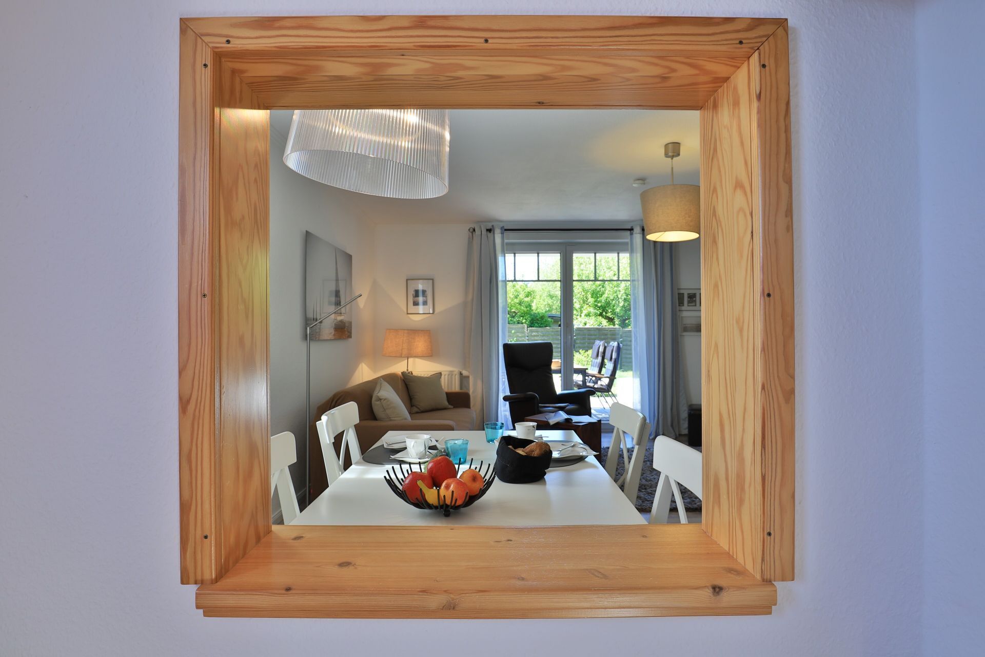 Die 2-Zimmerwohnung bietet eine großzügige Wohnfläche von 60qm und befindet sich im Erdgeschoss des Mehrparteienhauses. Eine Belegung ist mit 2 Personen möglich. Im sehr geschmackvoll möblierten Wohn-/Essbereich empfängt Sie ein Komfortsofa und ein Lesesessel mit Beinablage. Selbstverständlich ist das Appartement auch mit einem Fernseher, Musikanlage sowie WLAN ohne Mehrkosten ausgestattet. In der separaten Küche, die über eine Durchreiche zum Esstisch im Wohnbereich verfügt, können Sie Ihre Urlaubsmahlzeiten zubereiten. Ceranherd, Backofen, Dunstabzug, Kühlschrank mit sep. Gefrierfach, Kaffeemaschine, Wasserkocher, Toaster, Geschirrspüler u.v.m. sind vorhanden. Im Sommer können Sie sich auf der saisonal möblierten Terrasse wunderbar erholen und gerne das angrenzende Rasengrundstück nutzen. Geruhsame Nächte verbringen Sie in einem separaten Schlafzimmer mit Doppelbett ? 180cm mal 200cm-, Kleiderschrank und Kommode. Zugehörig ist ein modernes Duschbad mit Fenster, Waschtisch, Föhn, WC. Auch eine Waschmaschine, Bügeleisen und Bügelbett stehen zu Ihrer Verfügung. Im Safe sichern Sie persönliche Wertsachen.