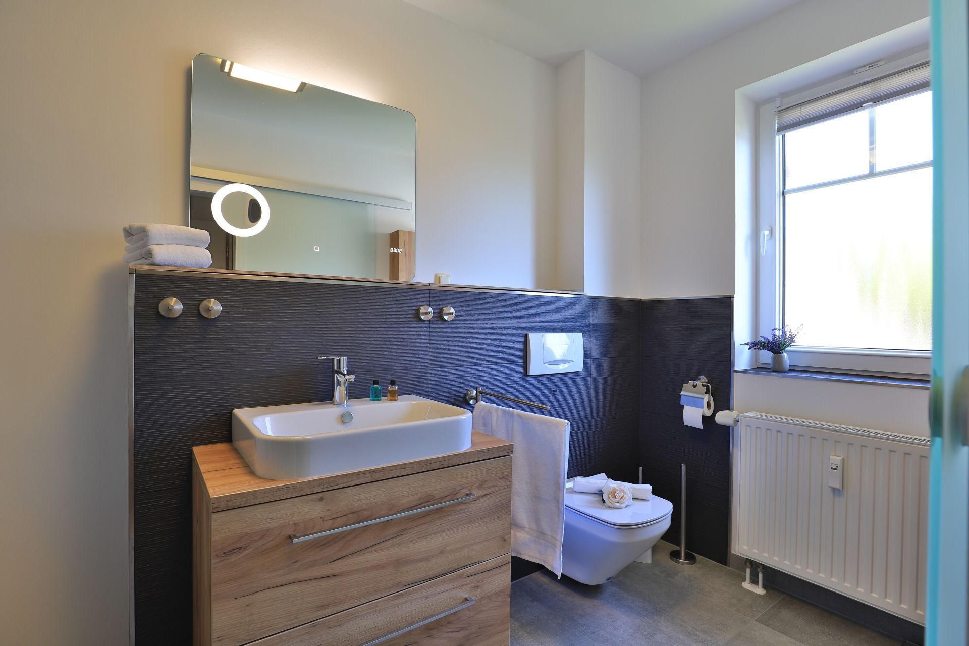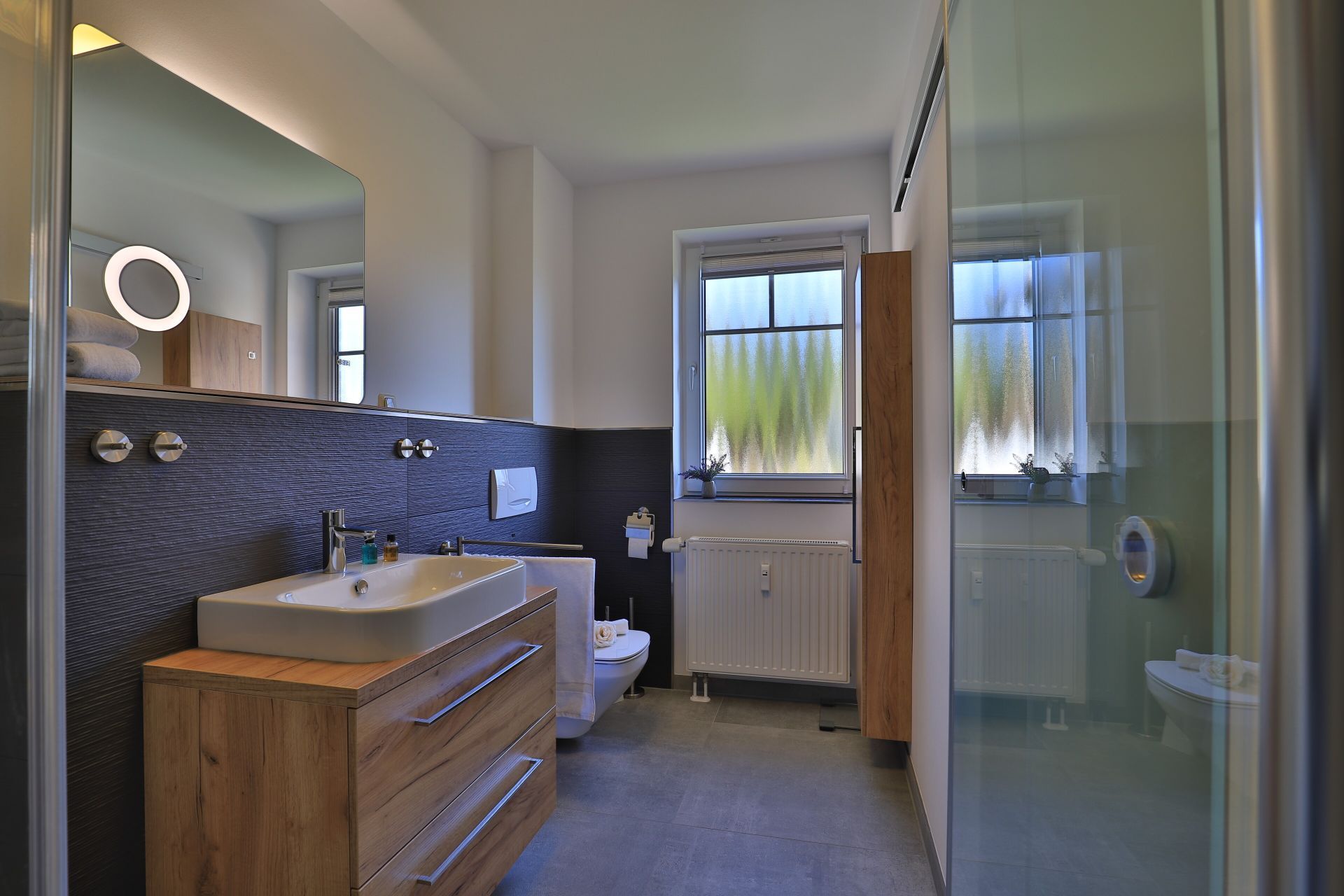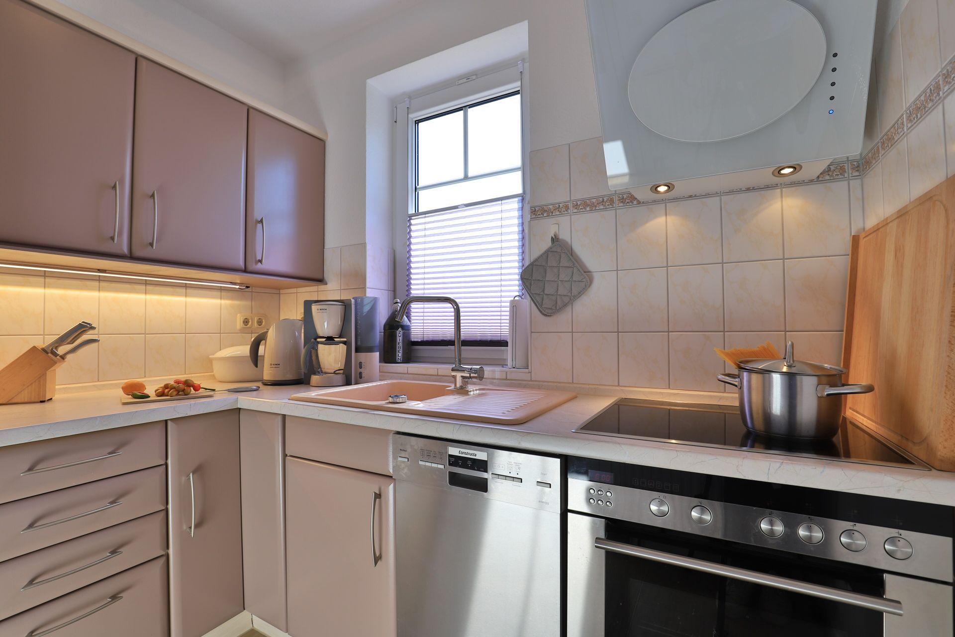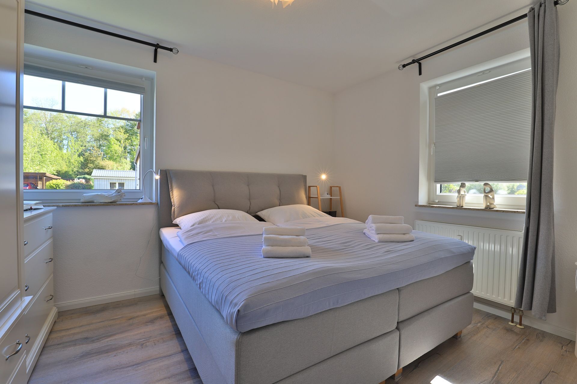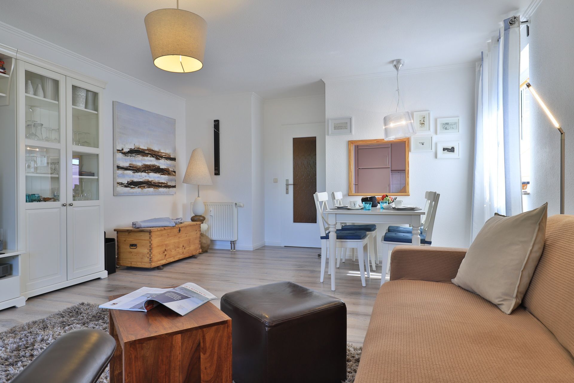 Die 2-Zimmerwohnung bietet eine großzügige Wohnfläche von 60qm und befindet sich im Erdgeschoss des Mehrparteienhauses. Eine Belegung ist mit 2 Personen möglich. Im sehr geschmackvoll möblierten Wohn-/Essbereich empfängt Sie ein Komfortsofa und ein Lesesessel mit Beinablage. Selbstverständlich ist das Appartement auch mit einem Fernseher, Musikanlage sowie WLAN ohne Mehrkosten ausgestattet. In der separaten Küche, die über eine Durchreiche zum Esstisch im Wohnbereich verfügt, können Sie Ihre Urlaubsmahlzeiten zubereiten. Ceranherd, Backofen, Dunstabzug, Kühlschrank mit sep. Gefrierfach, Kaffeemaschine, Wasserkocher, Toaster, Geschirrspüler u.v.m. sind vorhanden. Im Sommer können Sie sich auf der saisonal möblierten Terrasse wunderbar erholen und gerne das angrenzende Rasengrundstück nutzen. Geruhsame Nächte verbringen Sie in einem separaten Schlafzimmer mit Doppelbett ? 180cm mal 200cm-, Kleiderschrank und Kommode. Zugehörig ist ein modernes Duschbad mit Fenster, Waschtisch, Föhn, WC. Auch eine Waschmaschine, Bügeleisen und Bügelbett stehen zu Ihrer Verfügung. Im Safe sichern Sie persönliche Wertsachen.