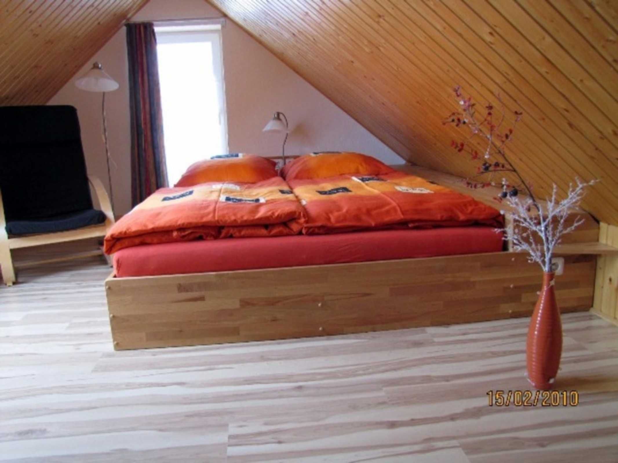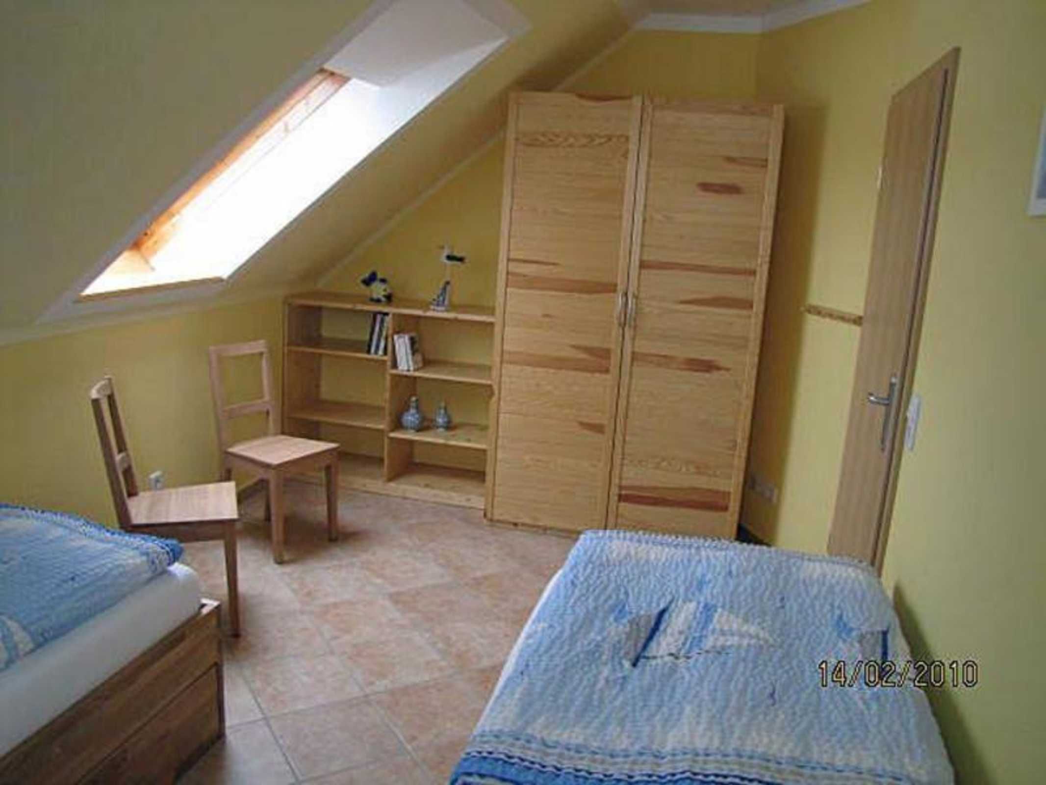Spitzboden mit französischem Bett (1,60m x 2,00m), Einbauschrank, Lesesessel mit Leseleuchte und Buchablage.