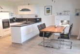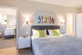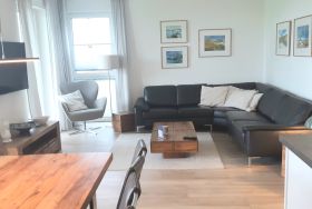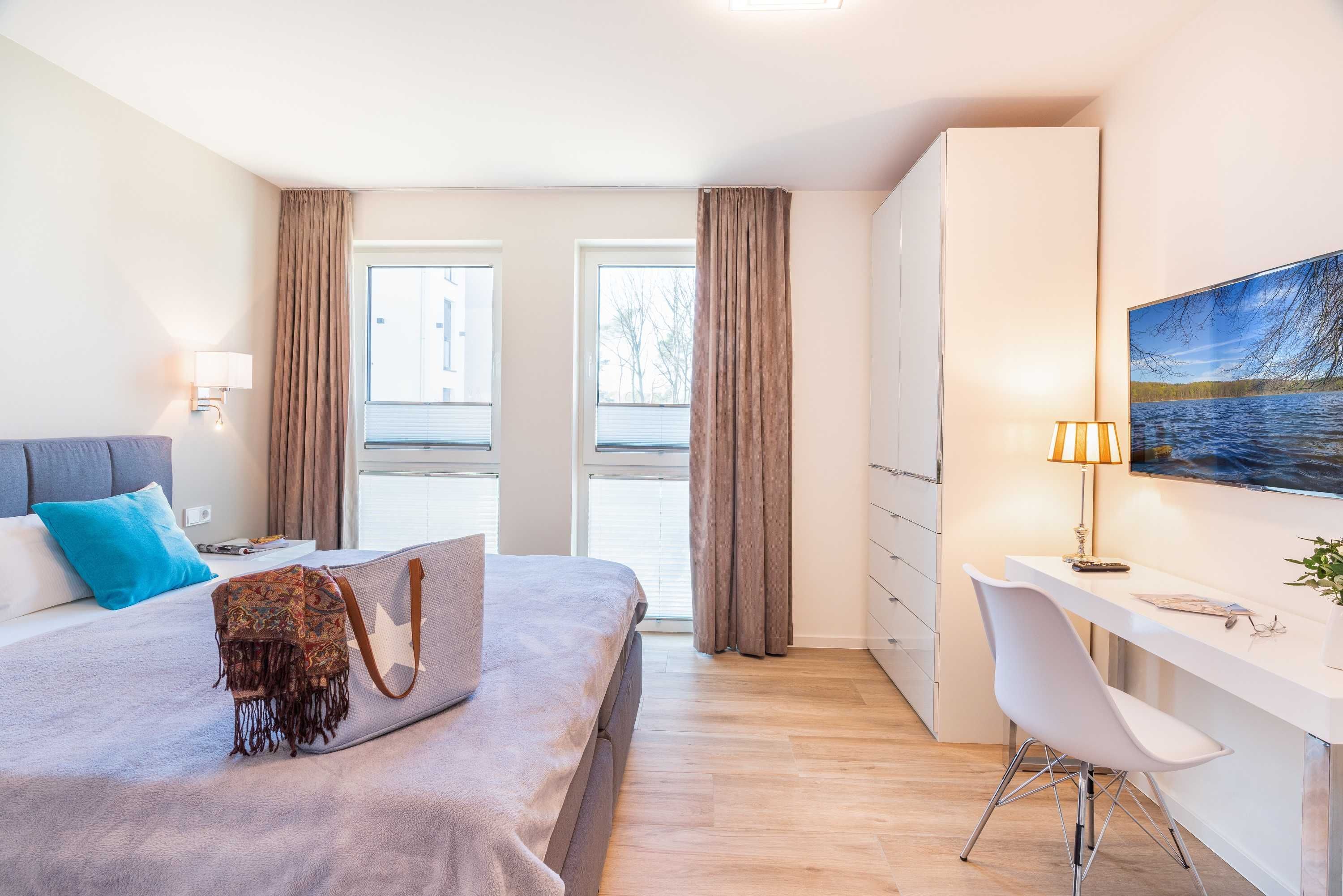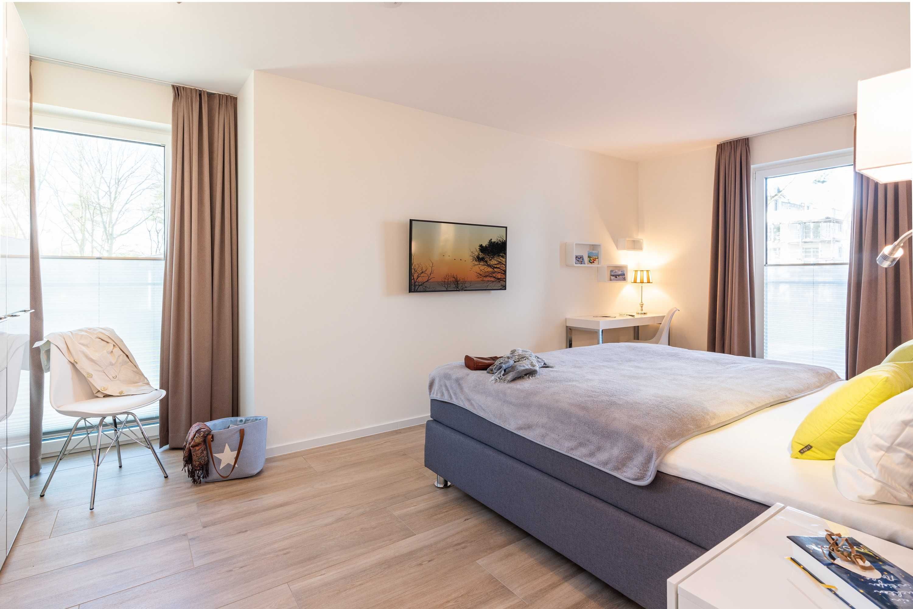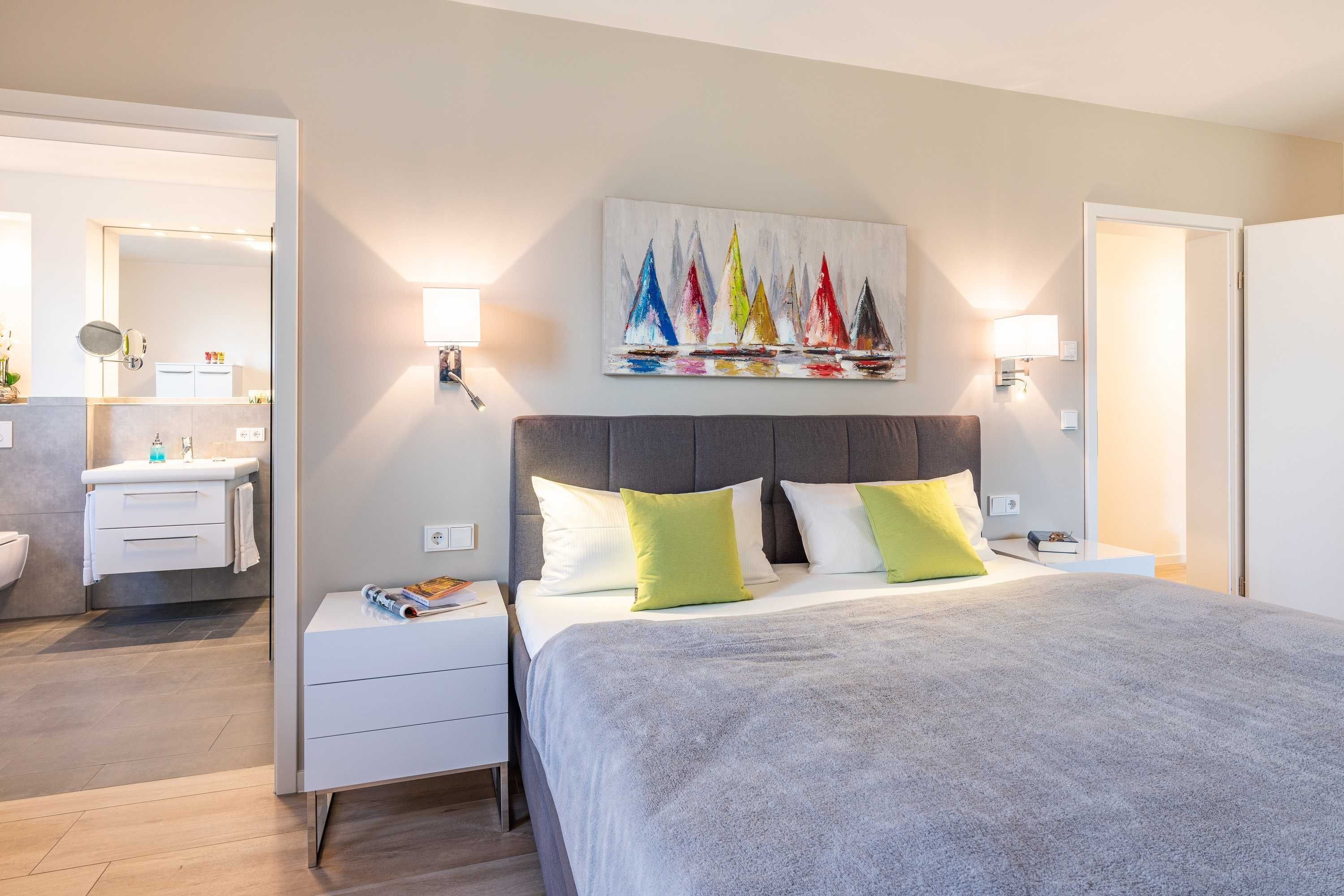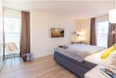 Diese luxuriöse 3-Zimmer-Wohnung im Erdgeschoss von Haus 6 mit Platz für maximal 4 Personen sowie einem Kleinkind bis 2 Jahre im Babybett verfügt über eine Wohnfläche von 101 m² und hat 2 Schlafzimmer sowie 2 voll ausgestattete Duschbäder. Die große Sonnenterrasse mit 21 m² liegt in idealer Süd-Ausrichtung. Die Wohnung ist modern eingerichtet mit offenem Wohn-Essbereich, großem Esstisch, Ledersofa sowie Smart-TV (inkl. Sky-Abo). Die hochwertig ausgestattete Küche, offen zum Wohnbereich, lässt keine Wünsche offen. Erholsamer Schlaf in den beiden Schlafzimmern mit Boxspringbetten und Smart-TV ist garantiert. Das Badezimmer en Suite ist mit einer begehbaren Dusche ausgestattet. Auf der großen, überdachten Sonnenterrasse mit Essgruppe und jeweils zwei Relax-Sesseln, Fußhockern, Sonnenschirm und Sonnenliegen können Sie die Seele baumeln lassen.