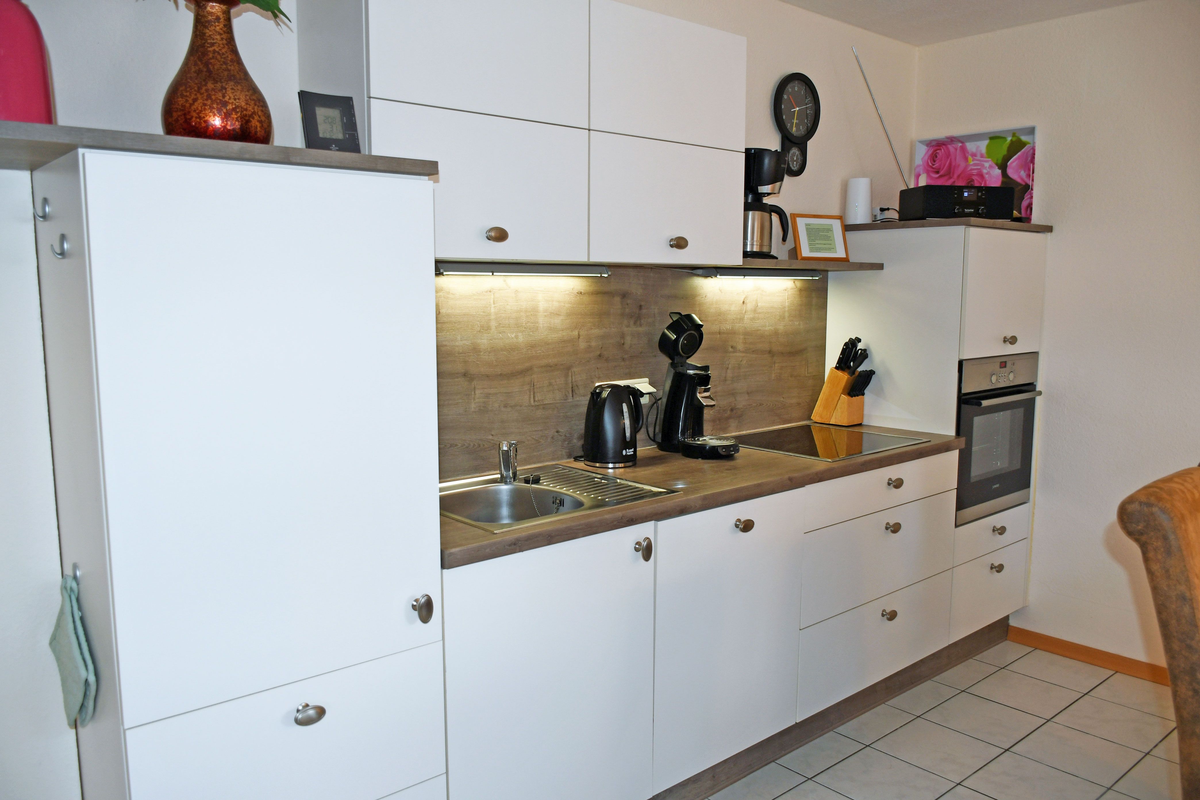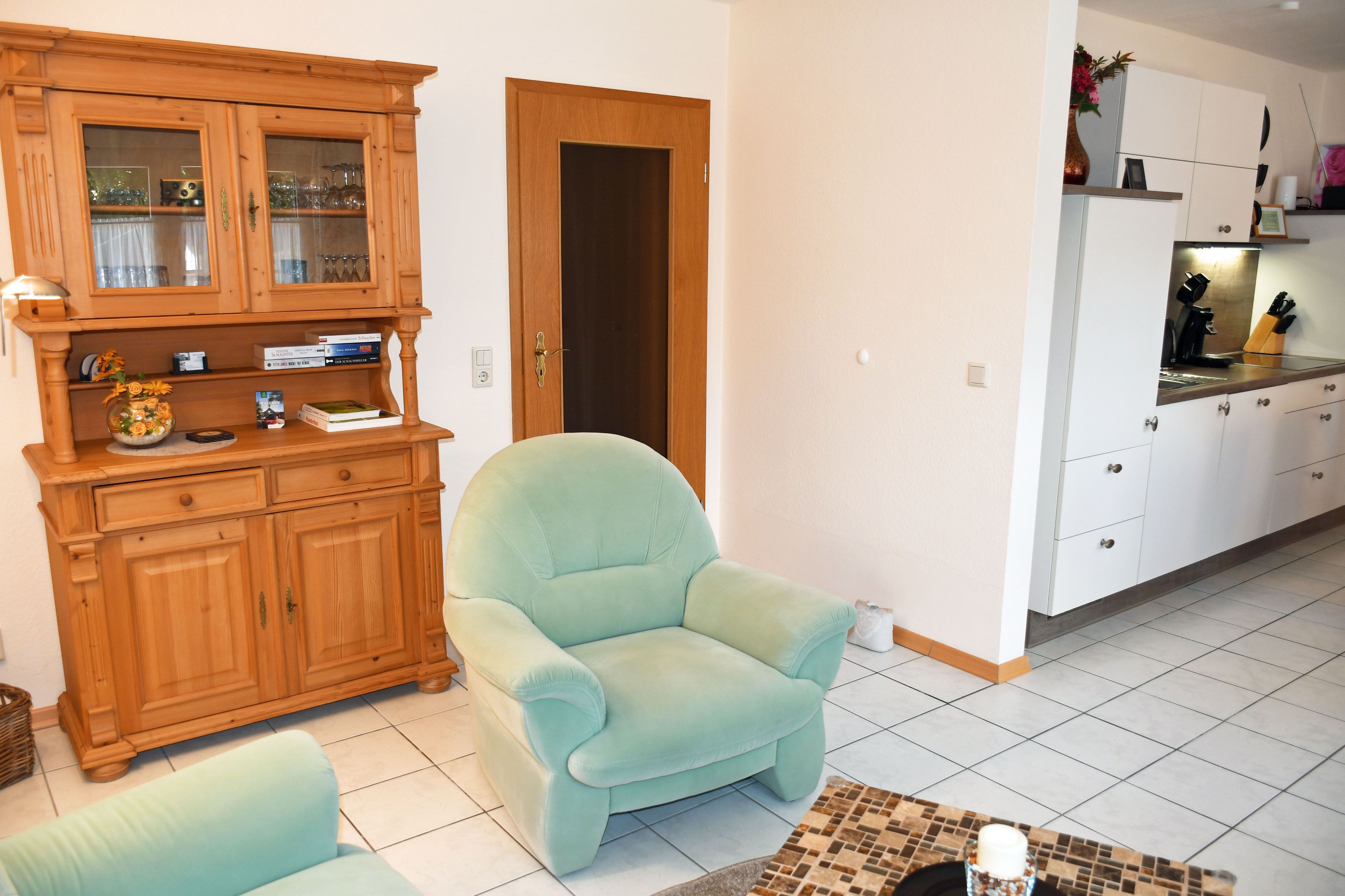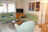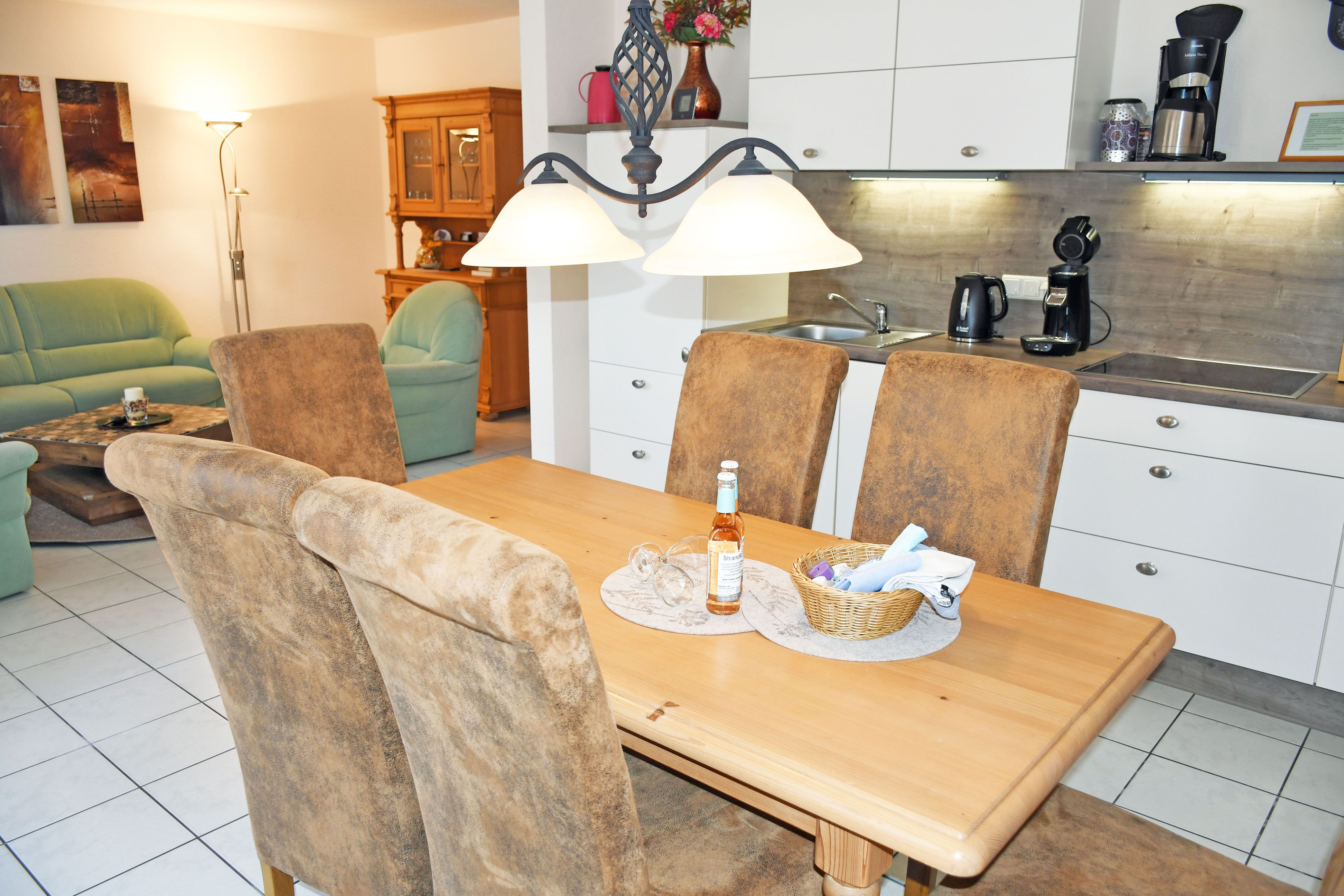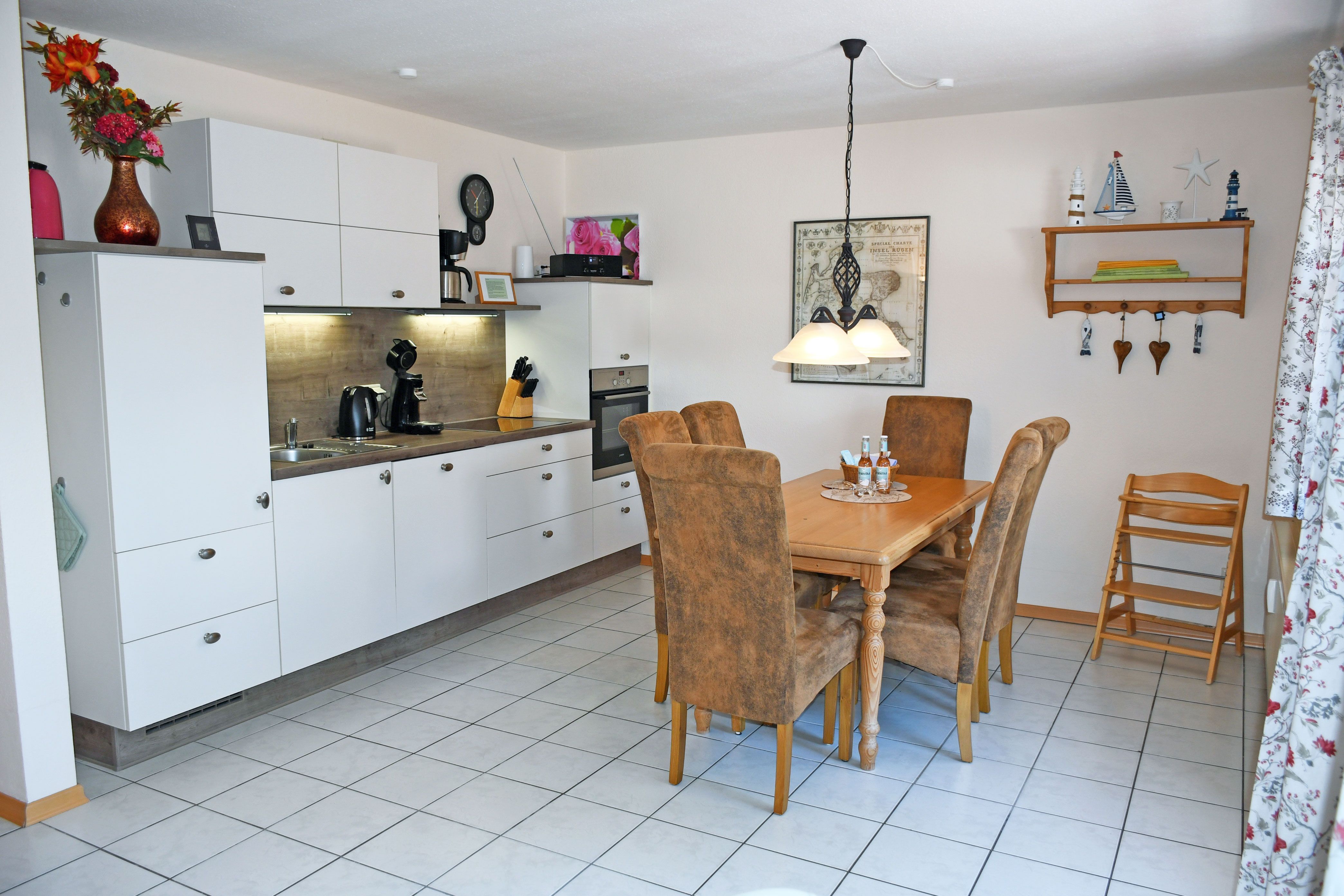 In dem großzügigen Wohnraum befinden sich eine Sitzcouch mit Tisch und Sessel, Leselampe und Flachbild-TV. Hier steht auch ein großer Esstisch mit Stühlen. Die Küchenzeile im Wohnbereich ist mit einem Herd, Spülmaschine, Wasserkocher, Kaffeemaschine, Toaster und Kühlschrank mit Gefrierfach komplett ausgestattet.