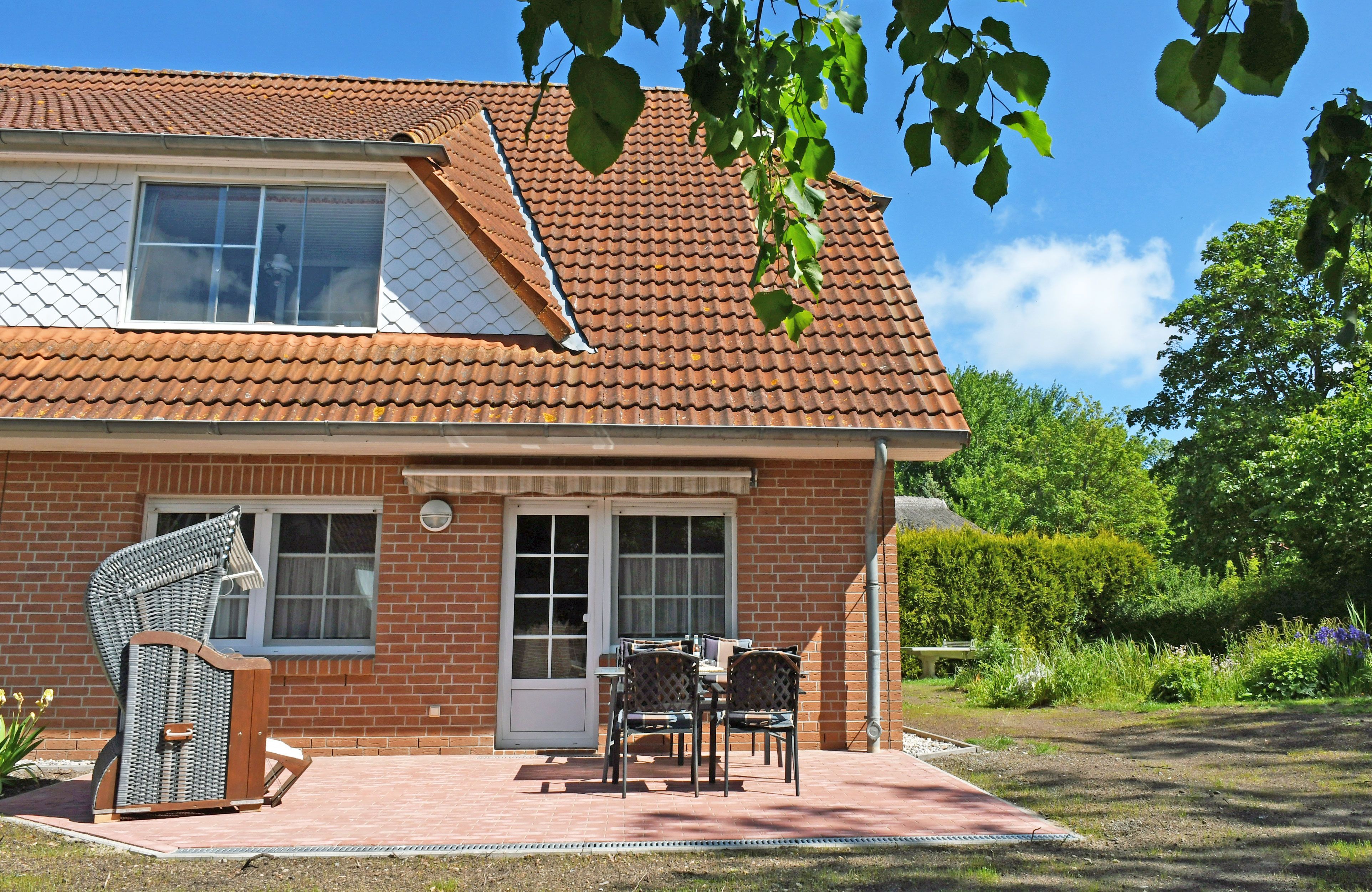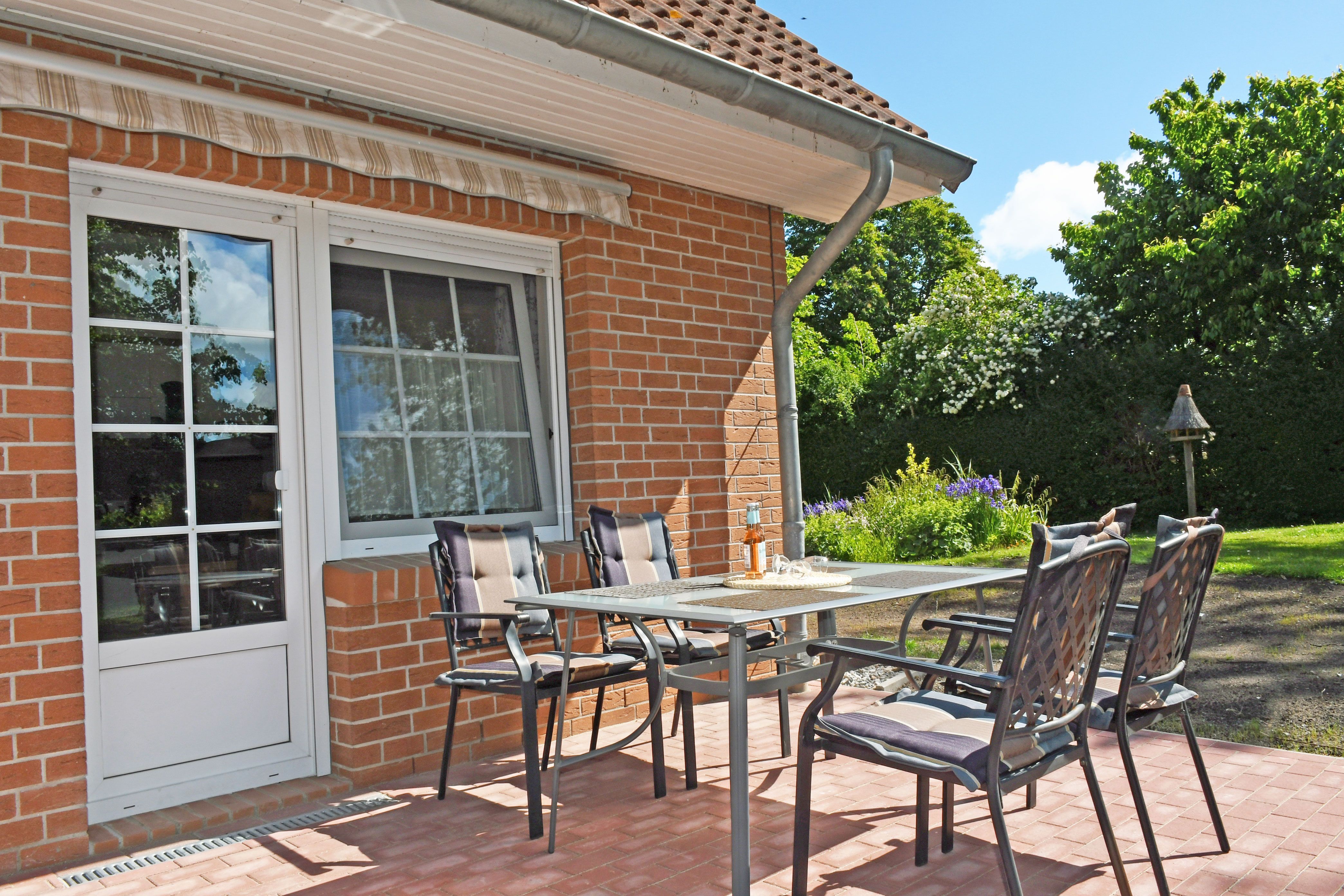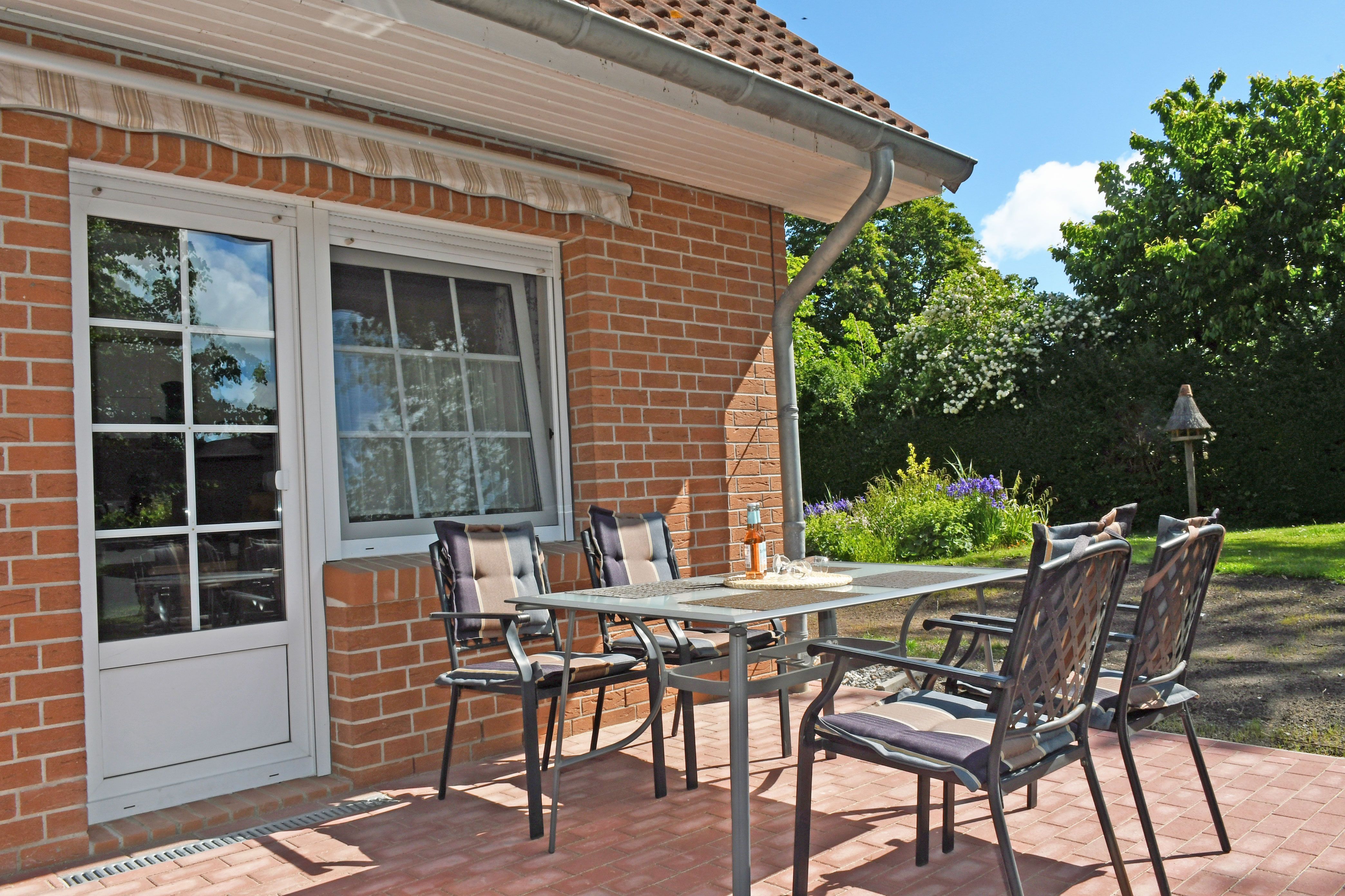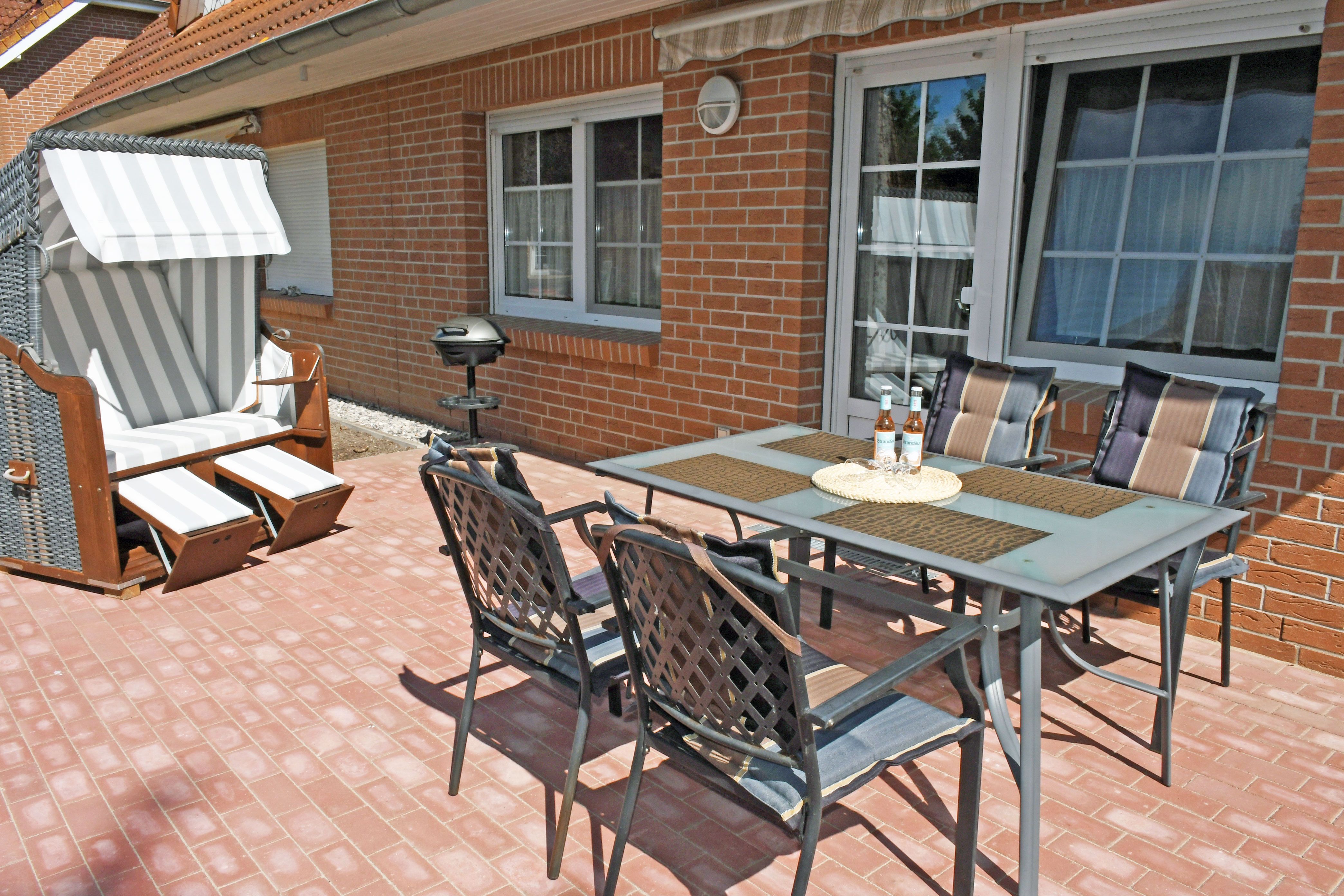 Zur unserer Ferienwohnung gehört auch eine große Terrasse mit Gartenmöbeln und einem Strandkorb.