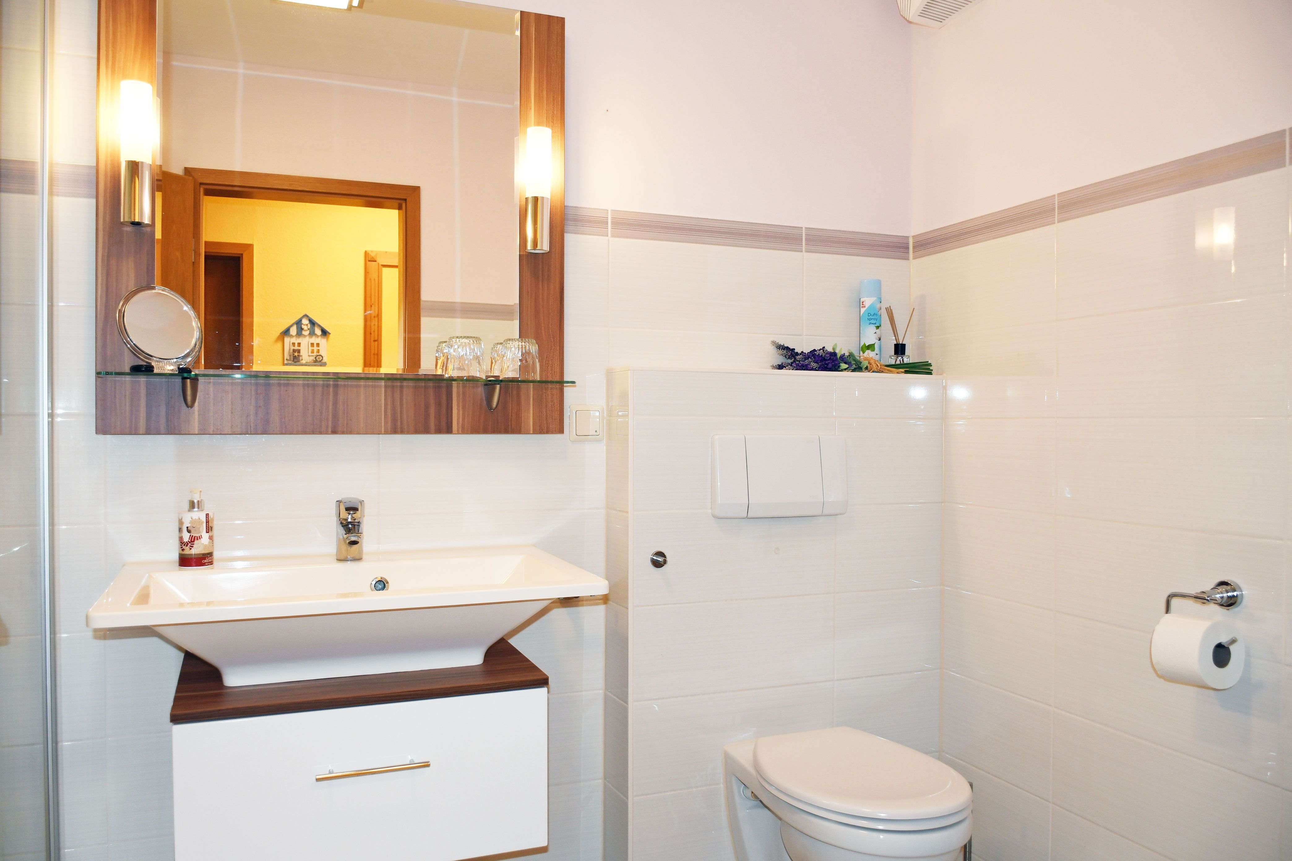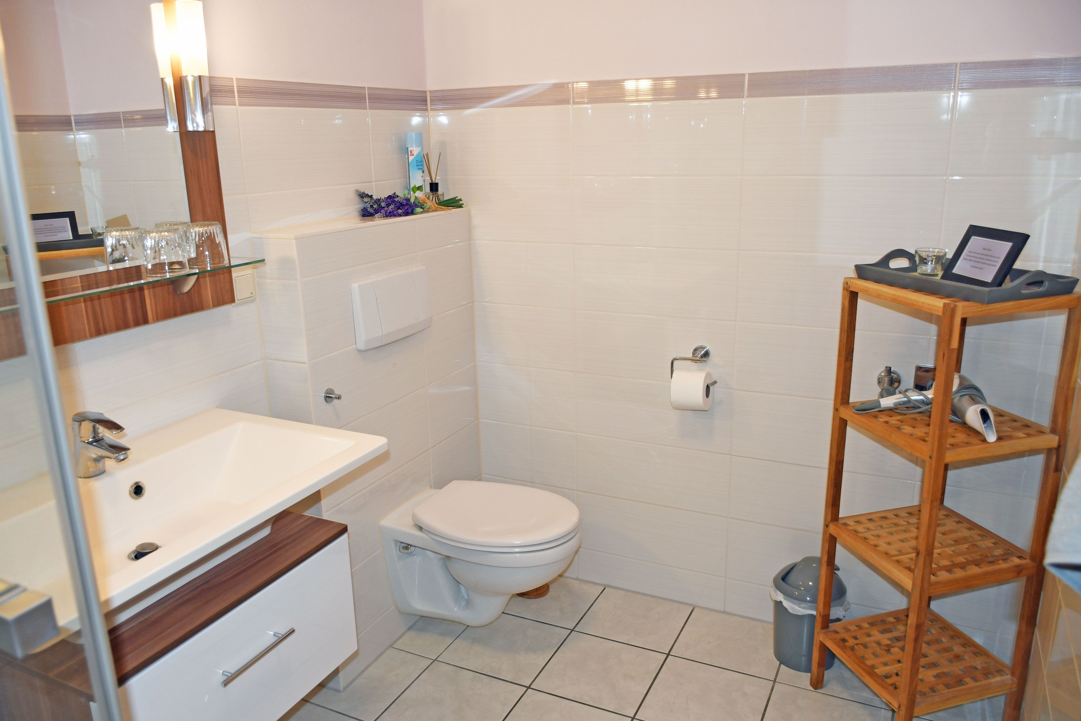 Das große Bad ist mit Dusche, WC und Waschtisch sowie Handtuchtrockner ausgestattet.