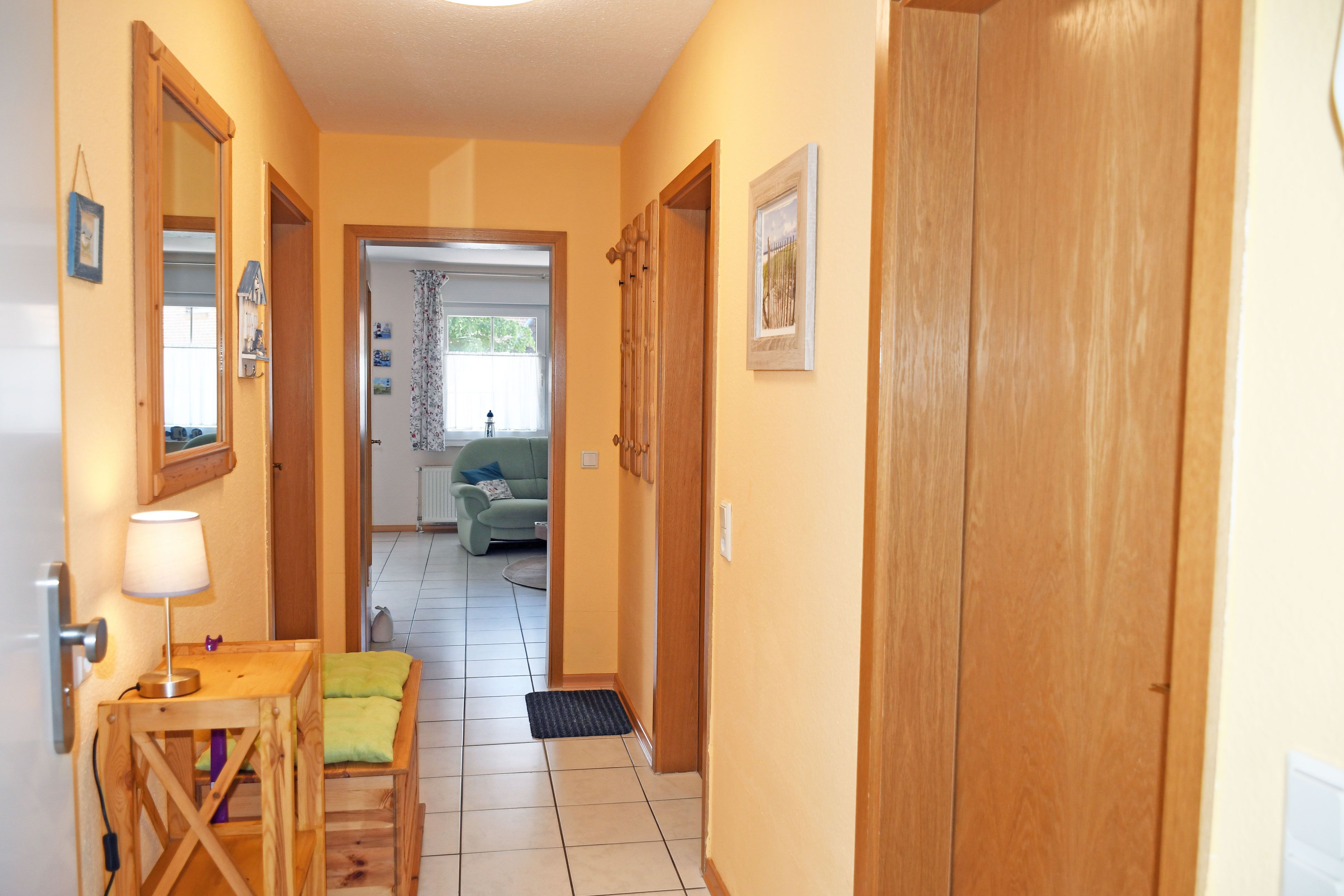 Unsere Ferienwohnung mit Terrasse und Strandkorb ist ca. 70 qm groß, hat Platz für maximal 4 Erwachsene sowie ein Kind bis 3 Jahre im Kinderreisebett und wurde sehr liebevoll und modern eingerichtet. Über einen Flur im Erdgeschoss gelangt man in die Wohnung.