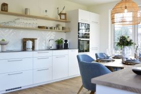Voll ausgestattete Küche mit Backofen, Geschirrspüler, Mikrowelle, Kühl-Gefrierkombination, Filterkaffee- und Senseo-Padmaschine, Wasserkocher und Toaster.