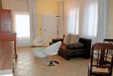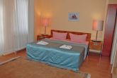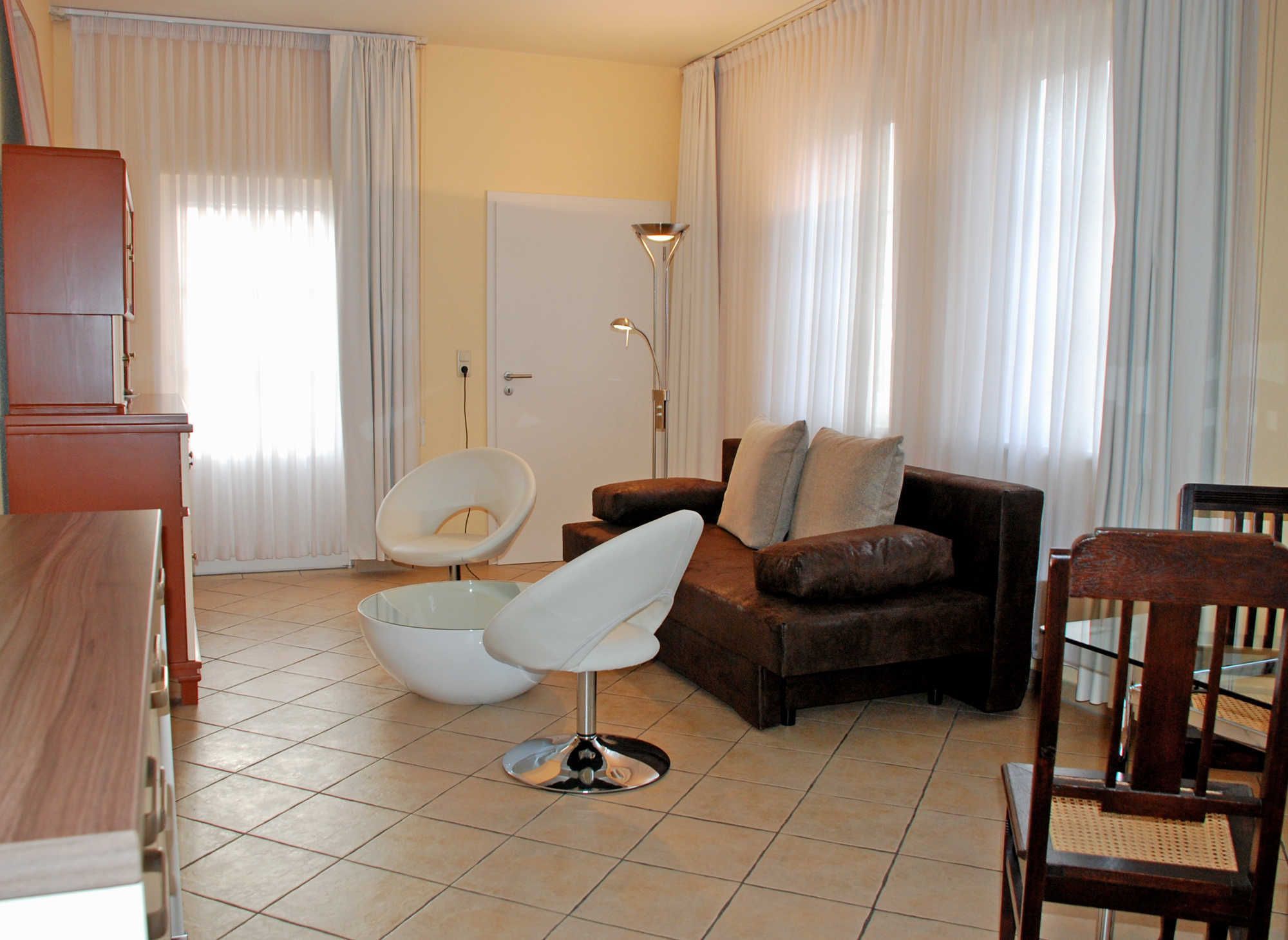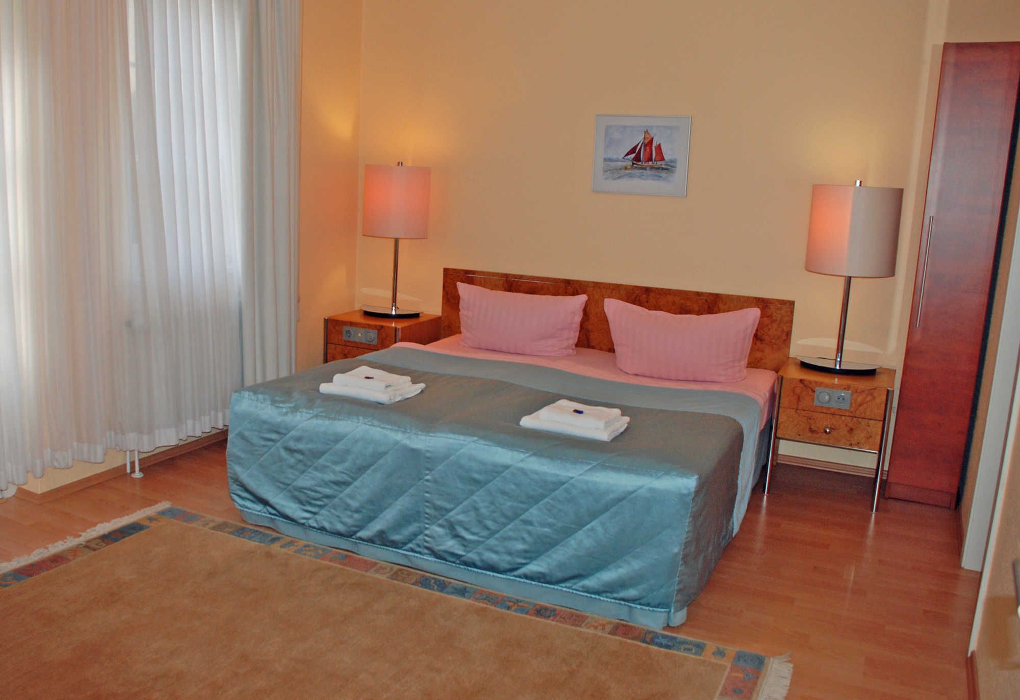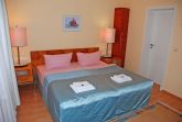 Die Ferienwohnung liegt im Hotelgebäude und verfügt über einen separaten Eingang. Sie ist ca. 36 qm groß, hat Platz für maximal 3 Erwachsene und wurde modern und hochwertig eingerichtet. Im Wohnraum befinden sich eine bequeme Sitzcouch mit Tisch und ein modernes Flachbild-TV-Gerät. Hier steht auch ein Esstisch mit Stühlen. Die moderne Küchenzeile ist mit einem Herd, Mikrowelle, Wasserkocher, Kaffeemaschine, Toaster und Kühlschrank komplett ausgestattet. Das großzügige Schlafzimmer ist mit einem bequemen Doppelbett mit Nachttischen und Leselampen sowie einem Kleiderschrank ausgestattet.
