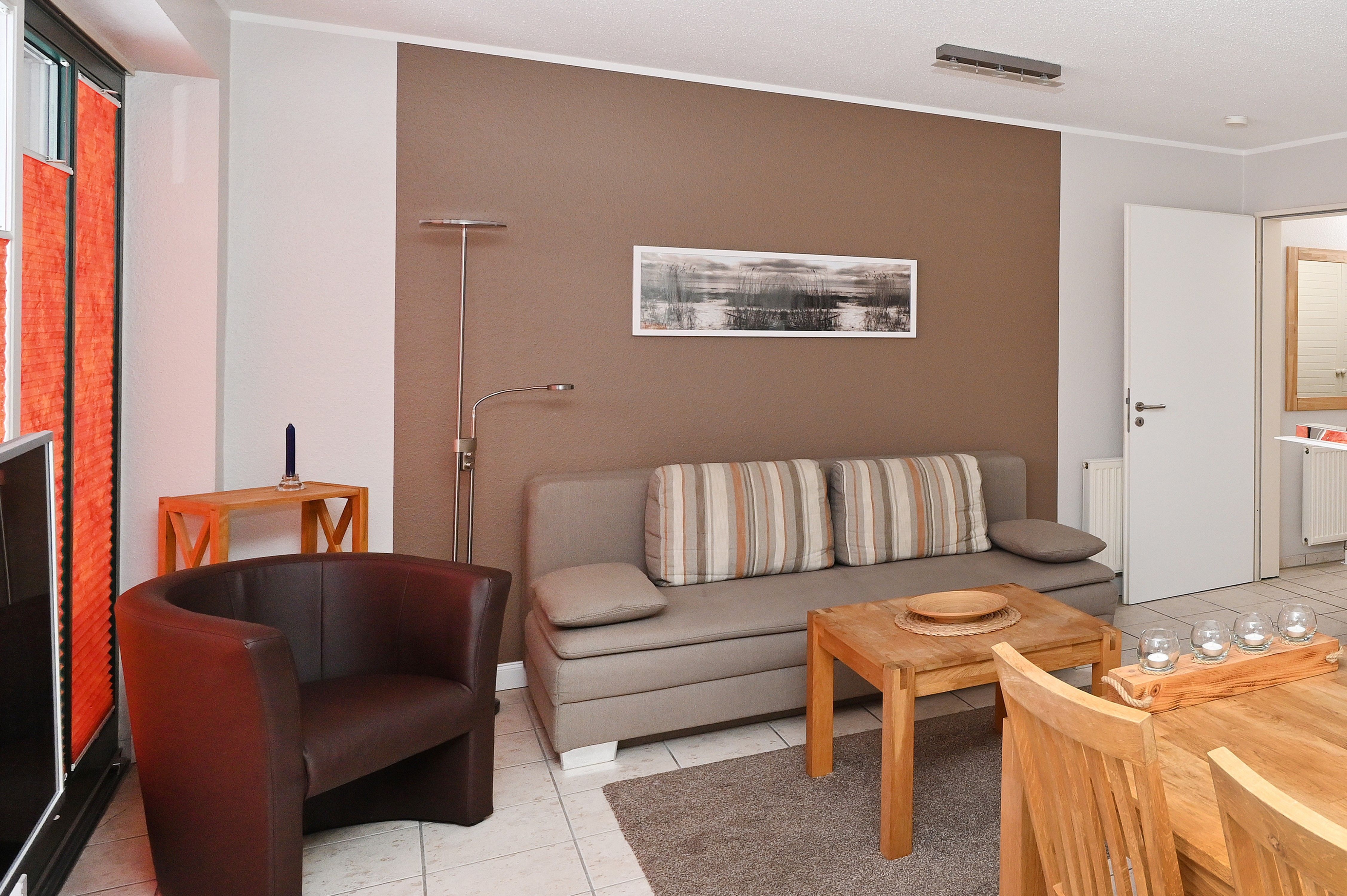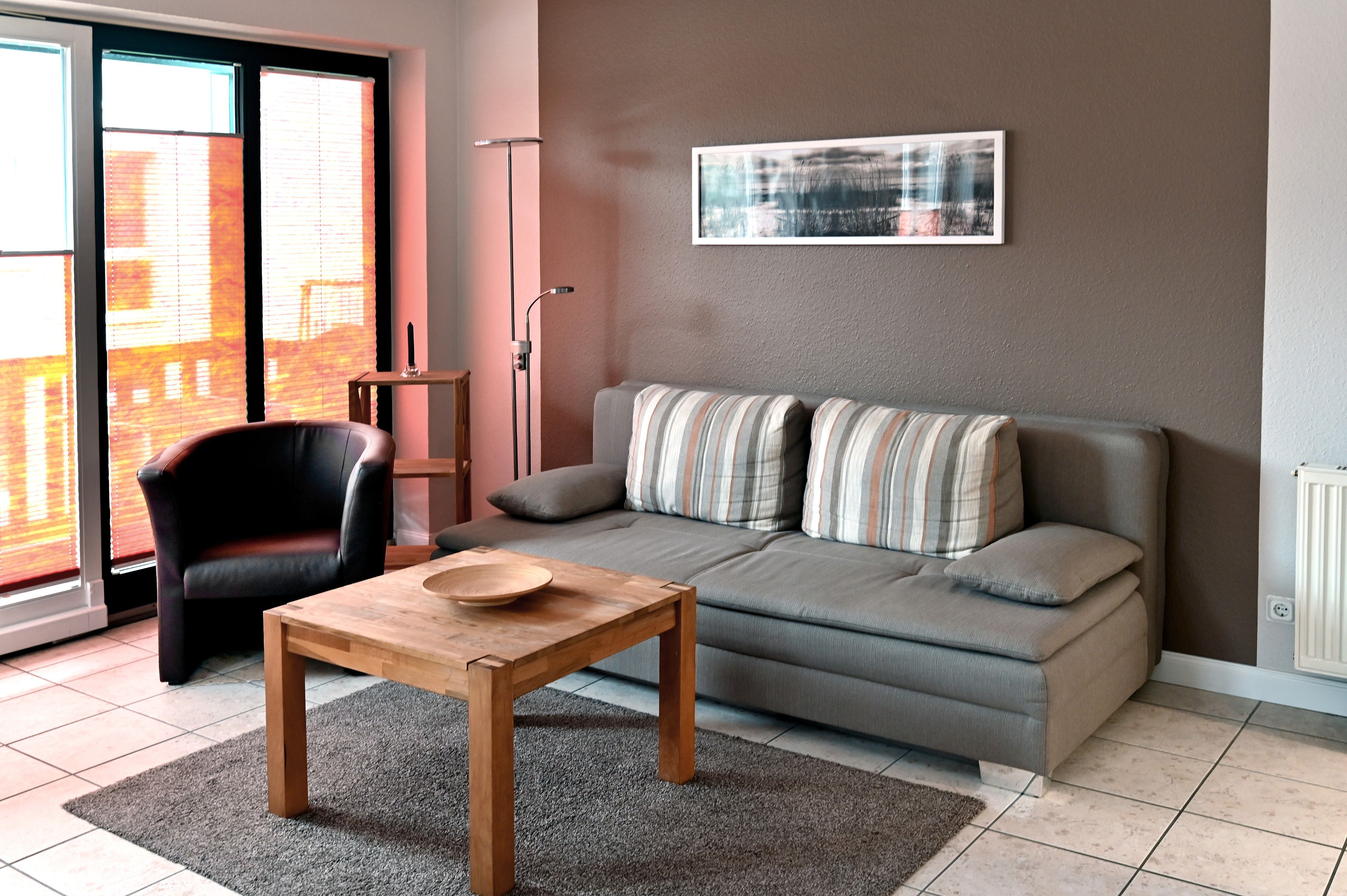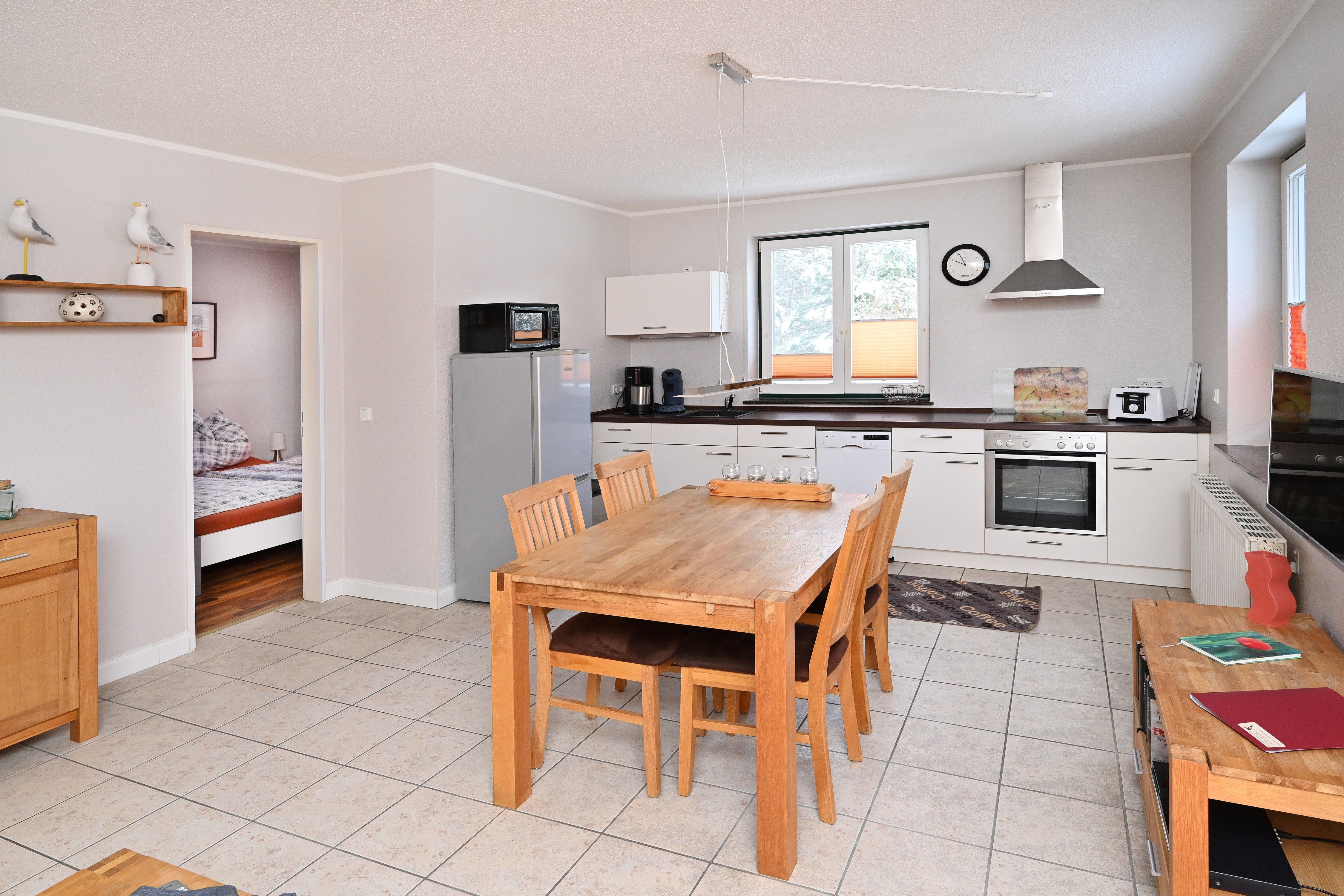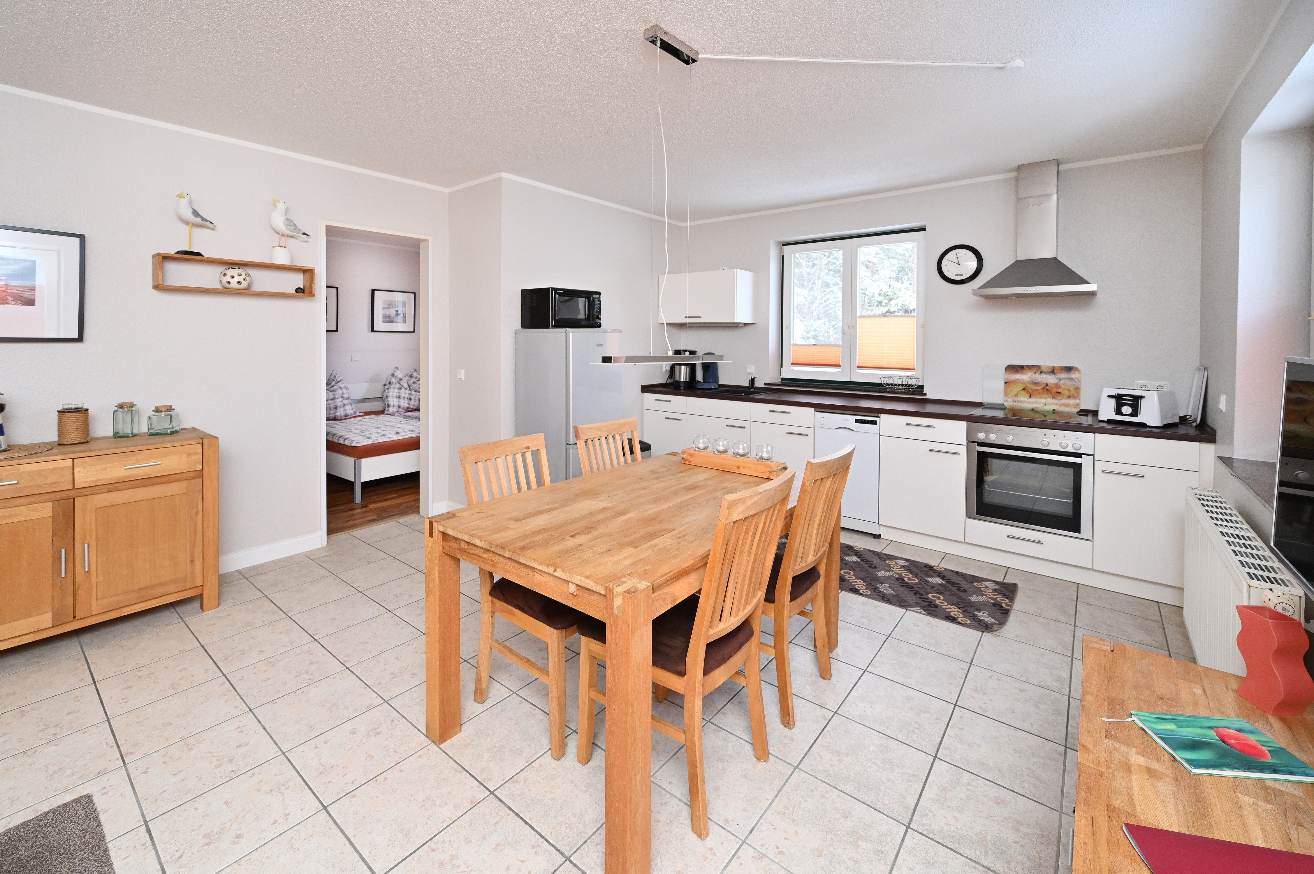 Die Wohnung ist optimal für 2 Personen geeignet, bietet aber auch Platz für 2 zusätzliche Gäste auf der komfortablen Schlafcouch im Wohnzimmer. Die moderne Küchenzeile ist mit allem ausgestattet, was Sie für die Selbstversorgung benötigen, inklusive Induktionskochfeld, Geschirrspüler, Mikrowelle und Kaffeemaschine. Der möblierte Balkon lädt zum Verweilen ein und bietet einen schönen Blick ins Grüne.
