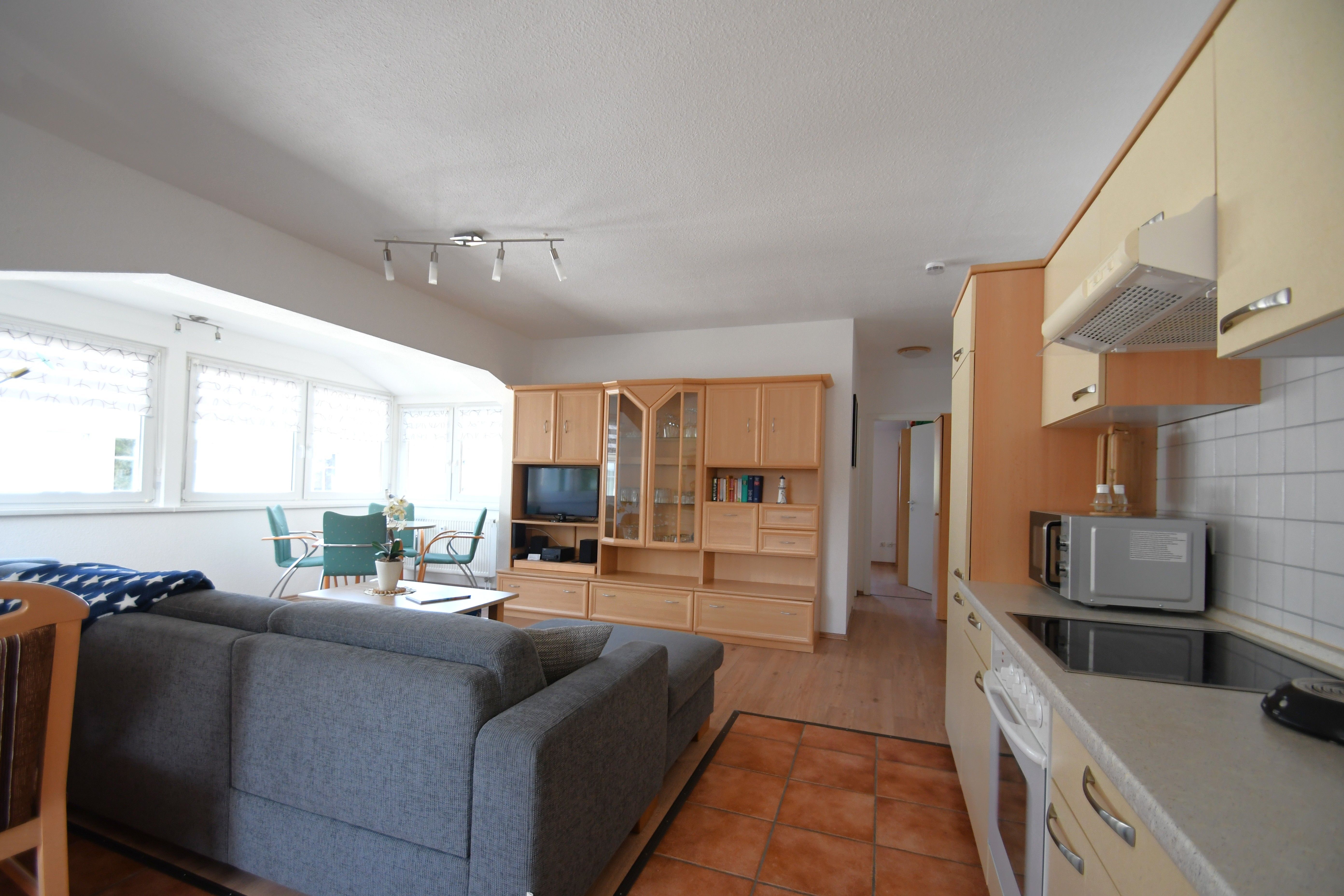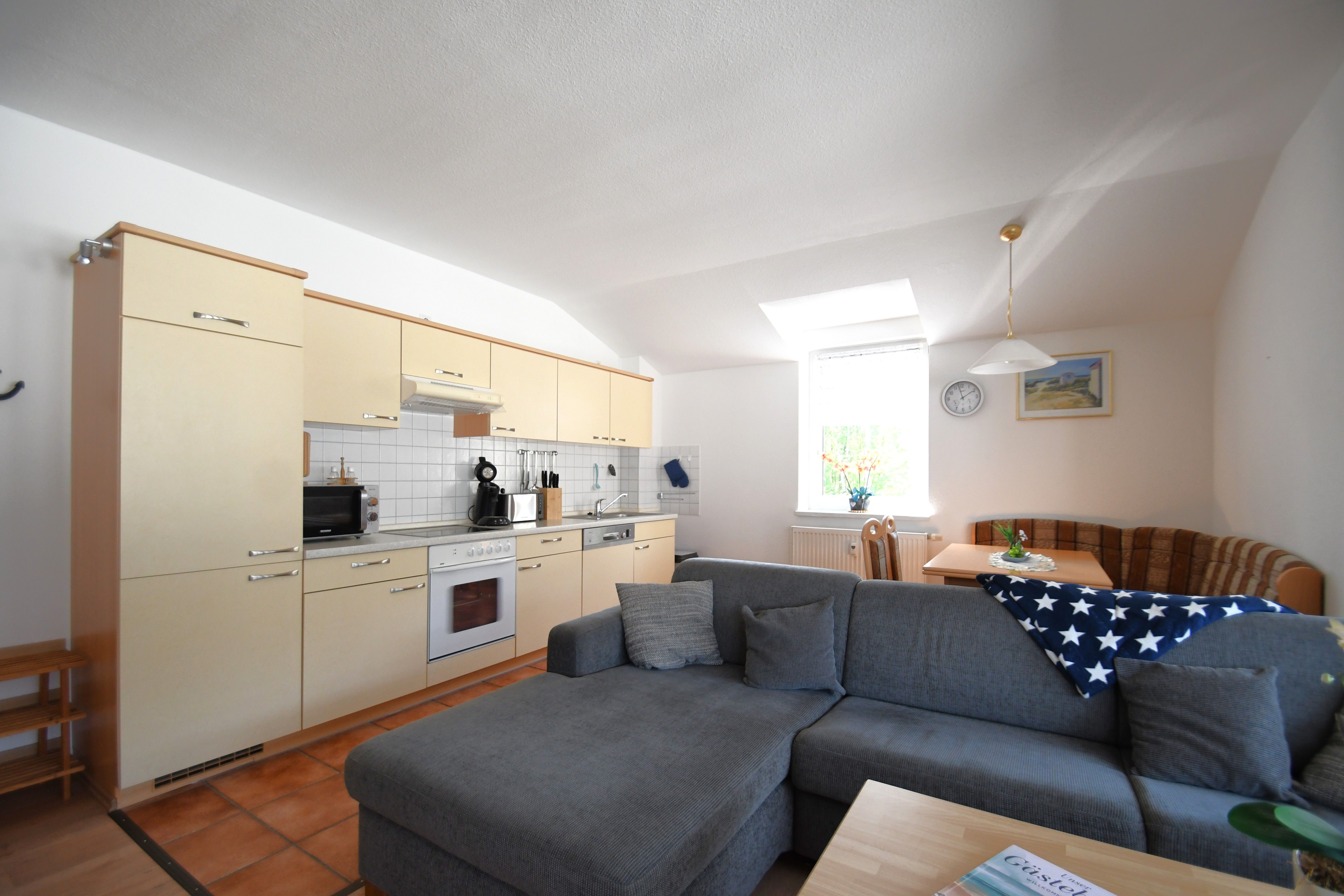 • integrierte Küchenzeile mit Cerankochfeld, Backofen, Geschirrspüler, Mikrowelle, Kühlschrank, Gefrierfach, Kaffeemaschine, Wasserkocher, Toaster und diversen Küchenutensilien