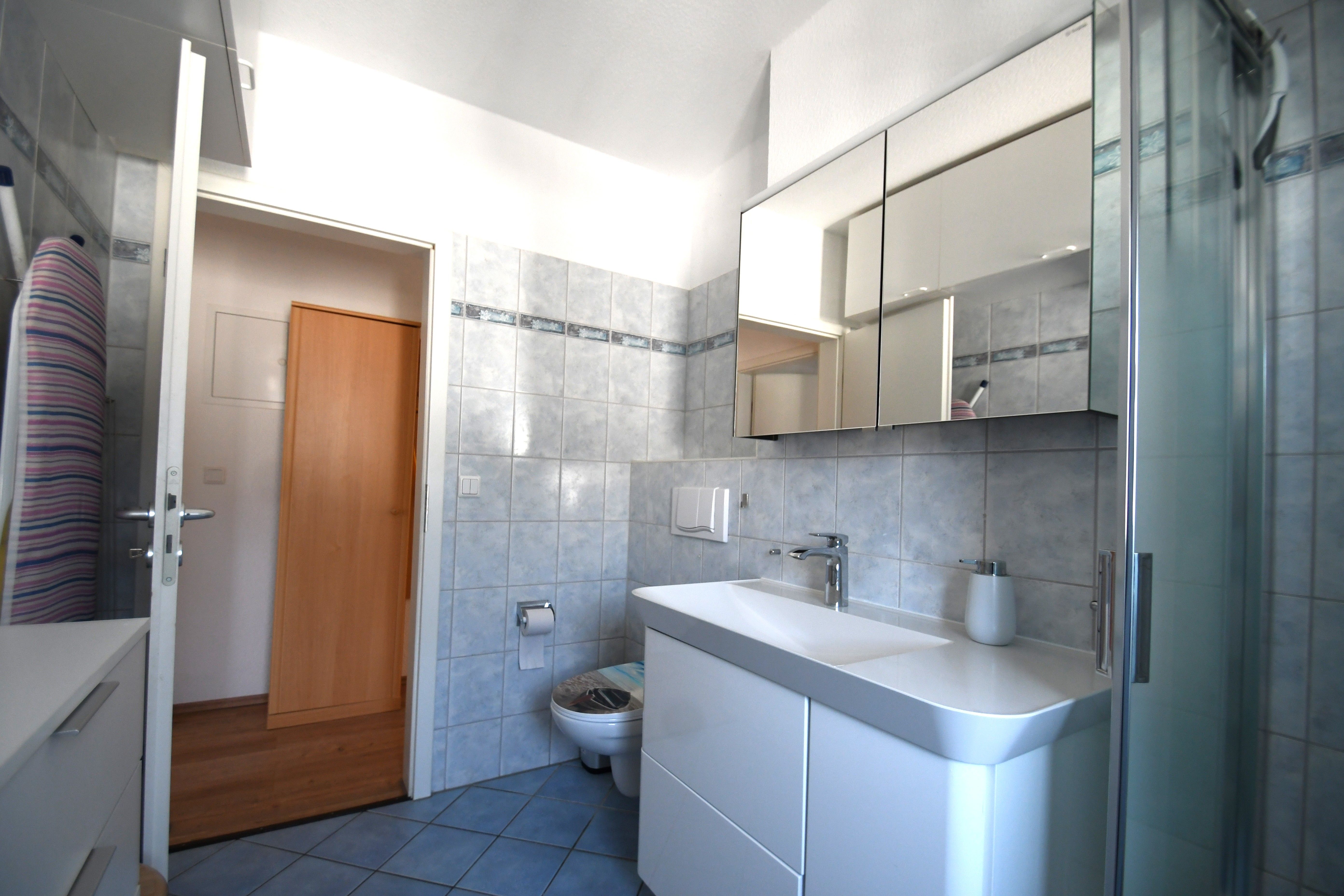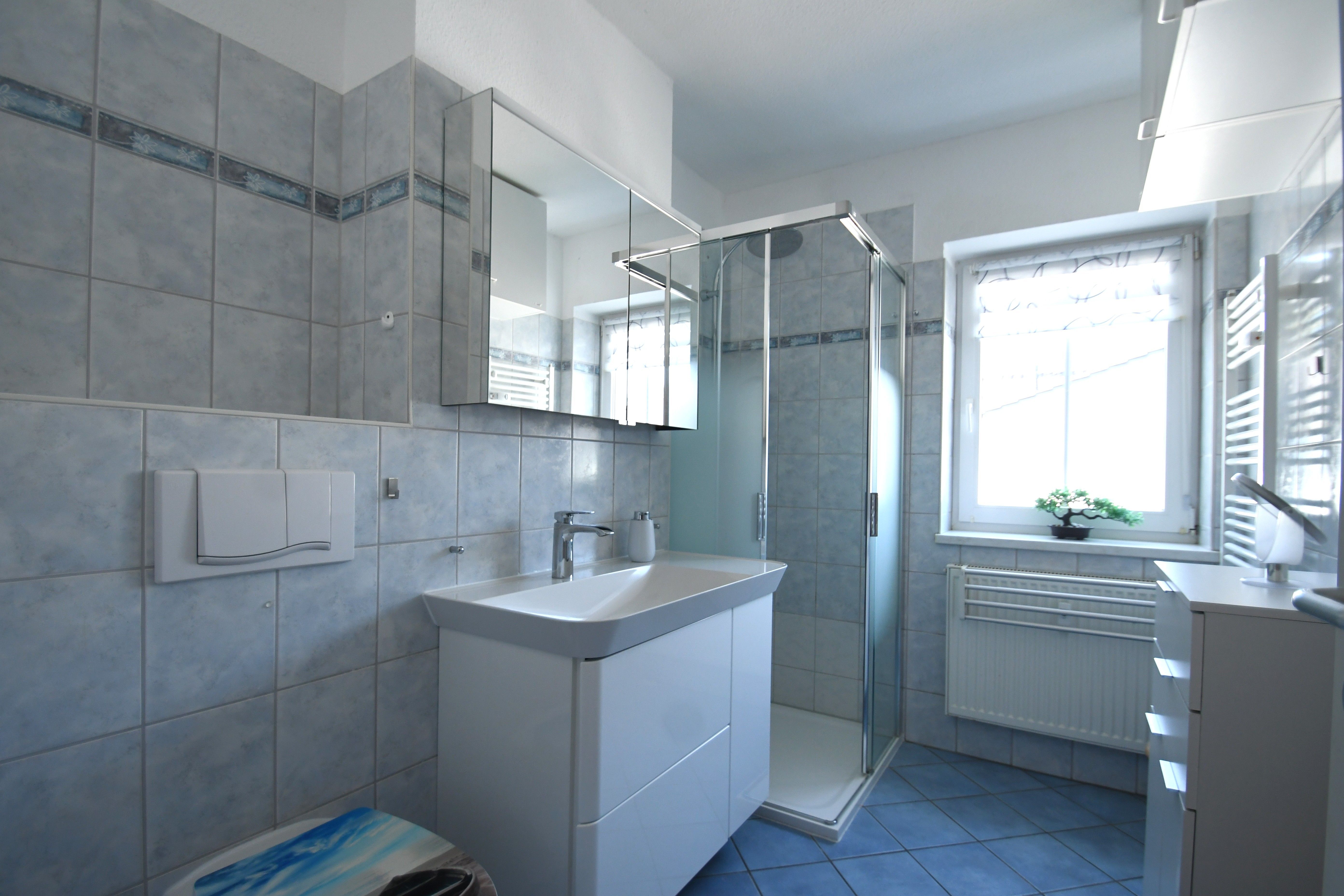 • Tageslichtbad mit Dusche, Waschplatz, Handtuchtrockner, WC und Fön