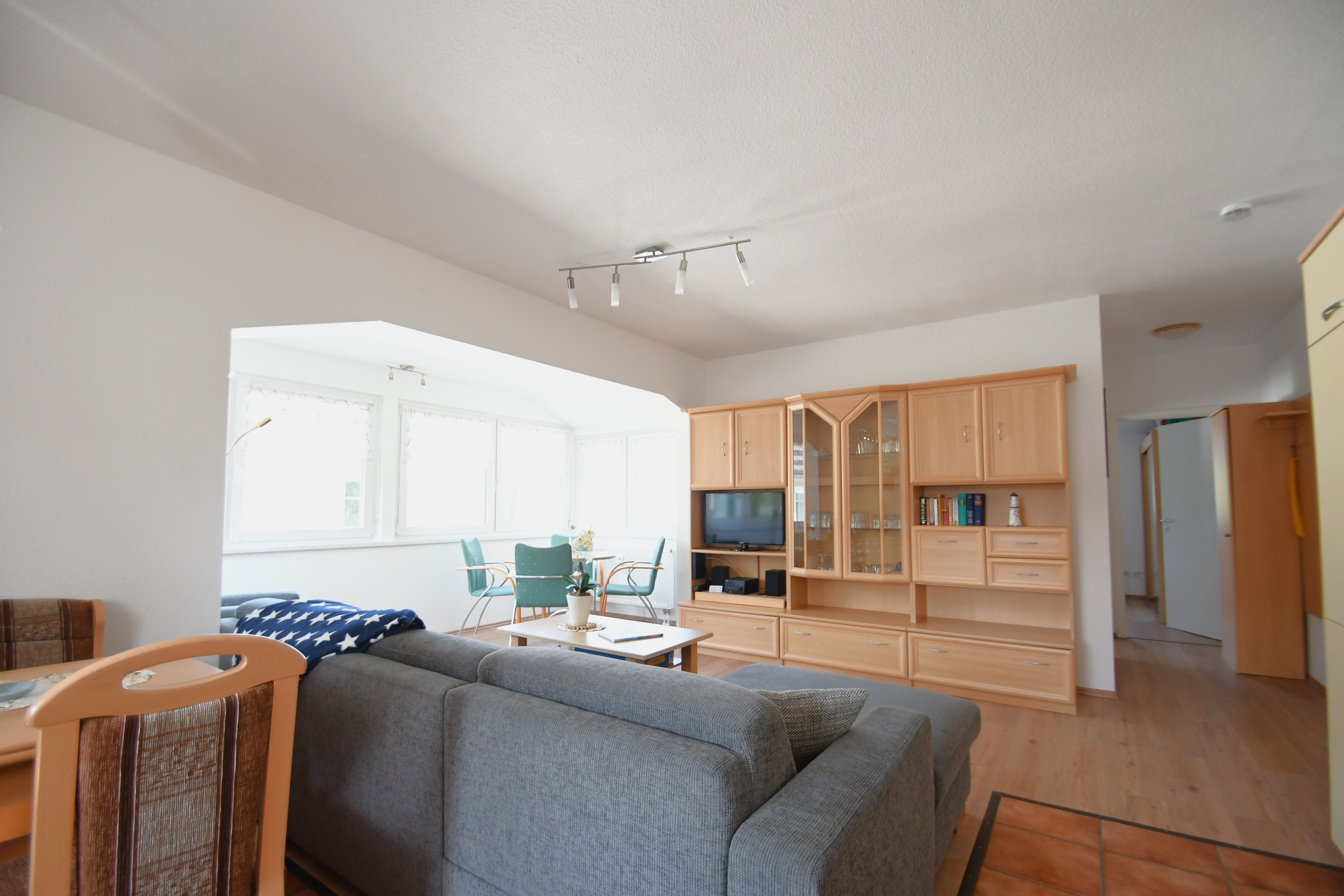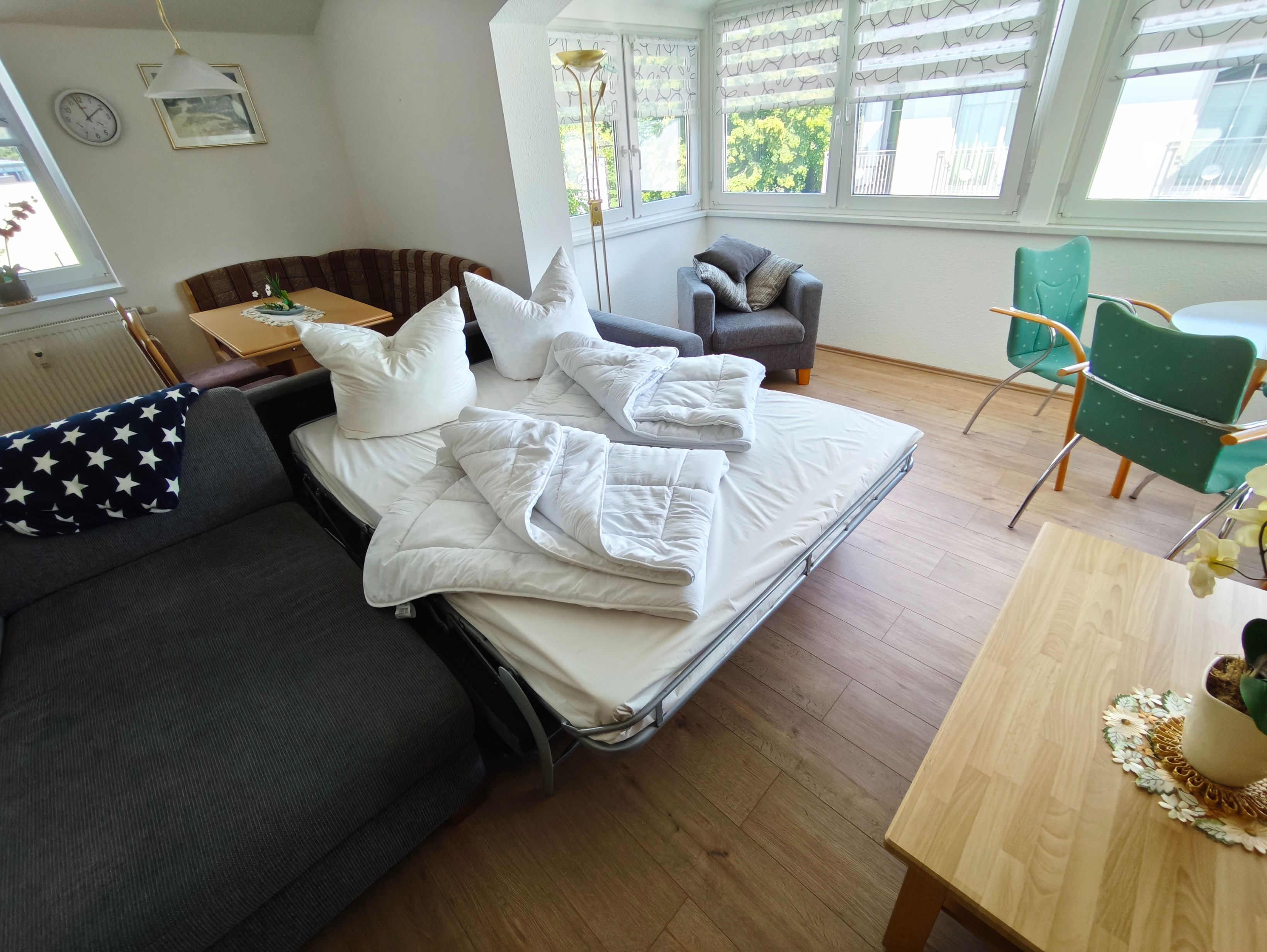 • offener Wohnbereich mit Couch (Ausziehfunktion zum Doppelbett (1,60 m x 2,00 m), Kleiderschrank, Sessel, Couchtisch, kleinem Beistelltisch, Flachbild-TV