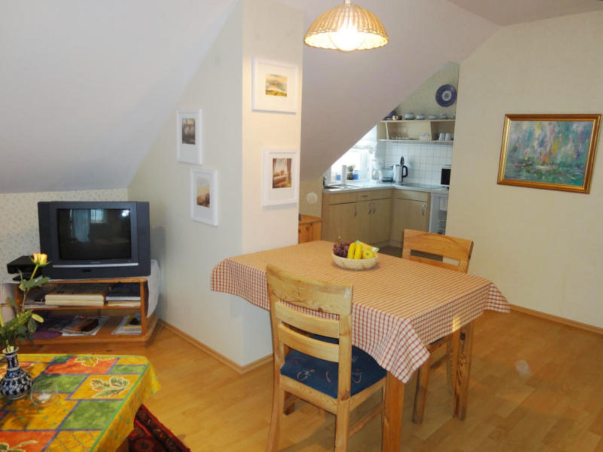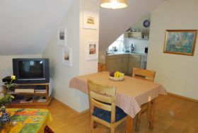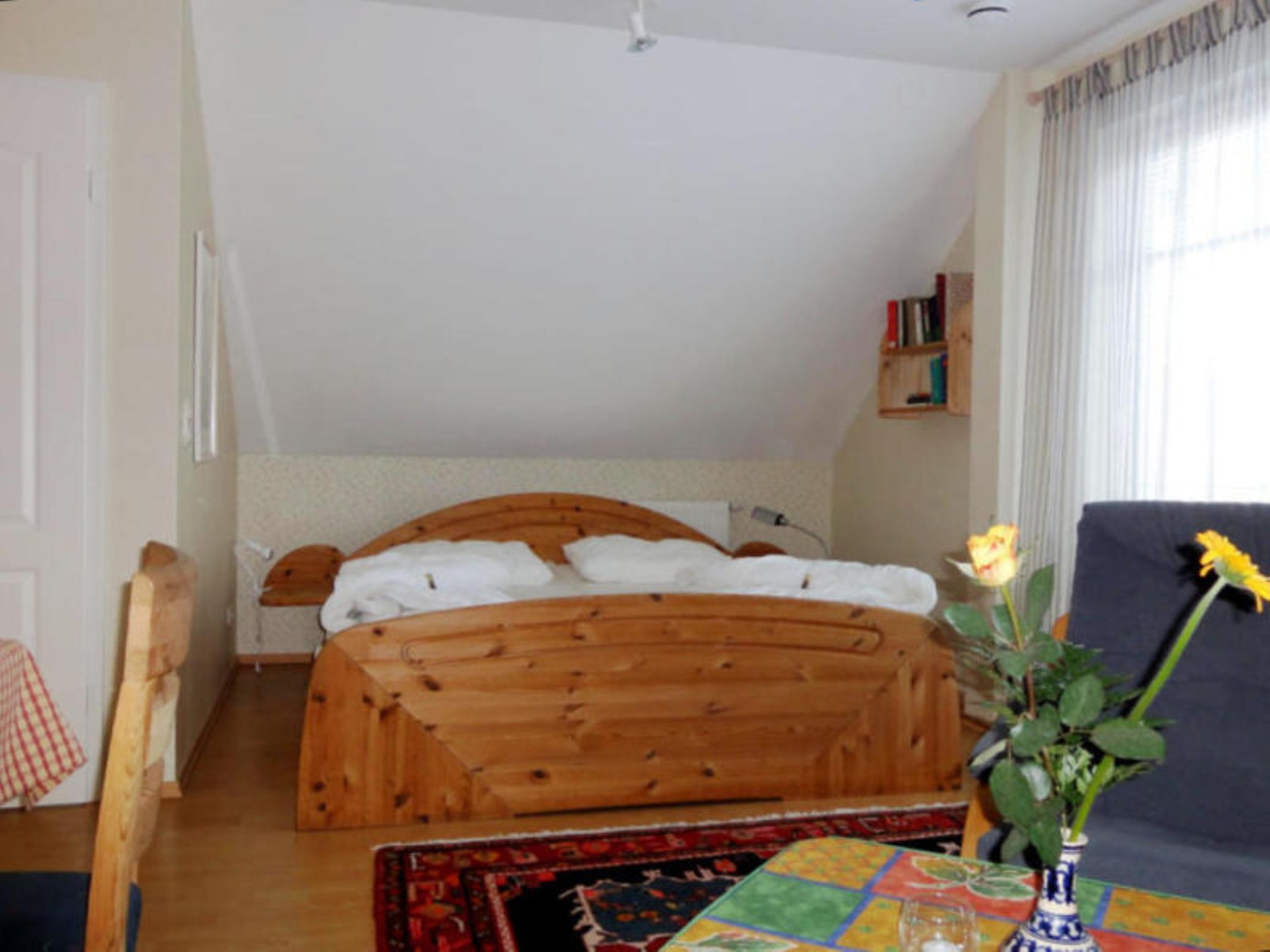 Im Wohn-/Schlafbereich finden Sie ein breites Doppelbett sowie eine Sitzecke mit Radio/TV. Die integrierte Küche ist unter anderem mit einer Mikrowelle, einer Kaffeemaschine, Ceranfeld-Kochplatten und einem Kühlschrank mit Gefrierfach ausgestattet.
