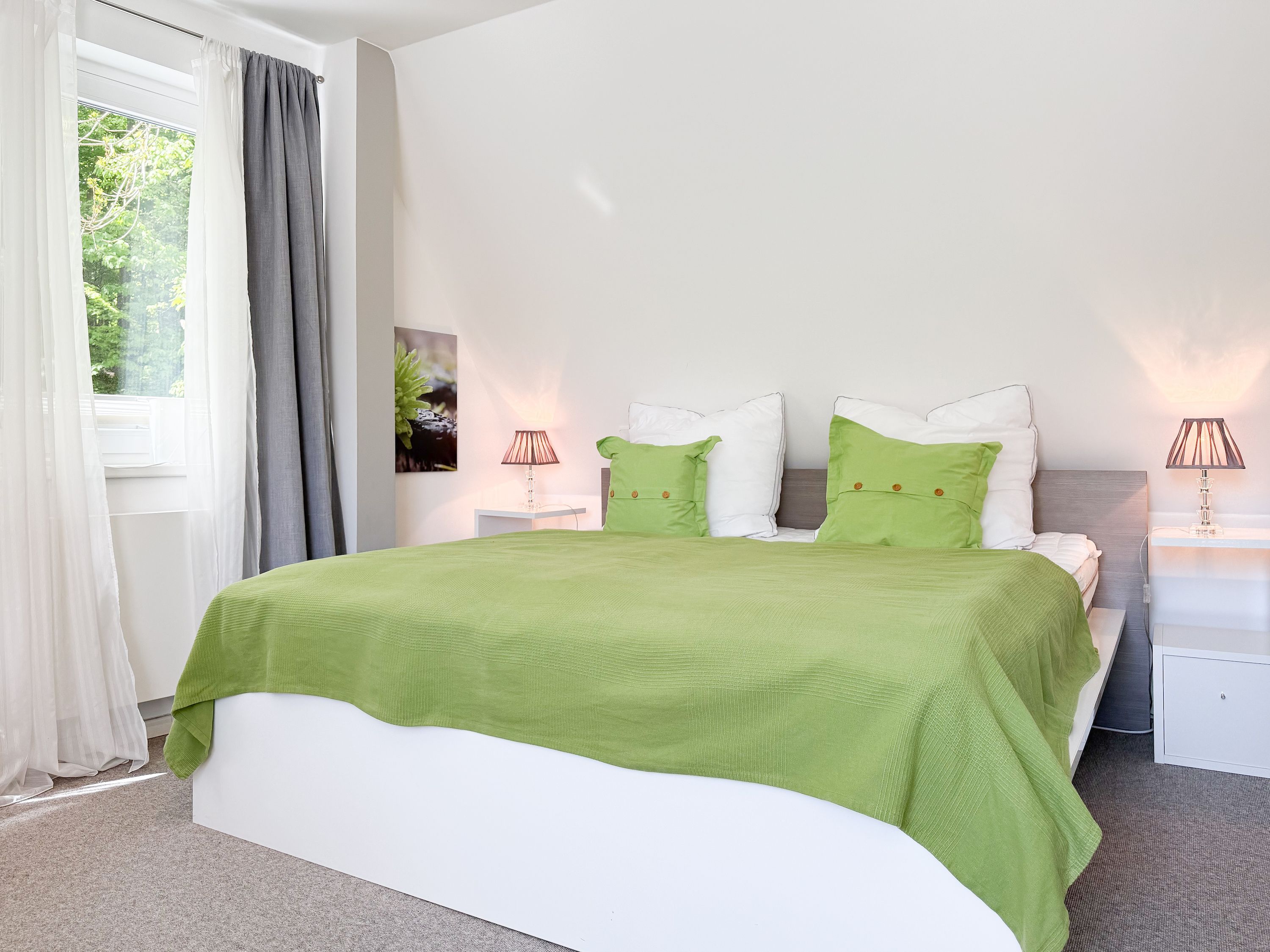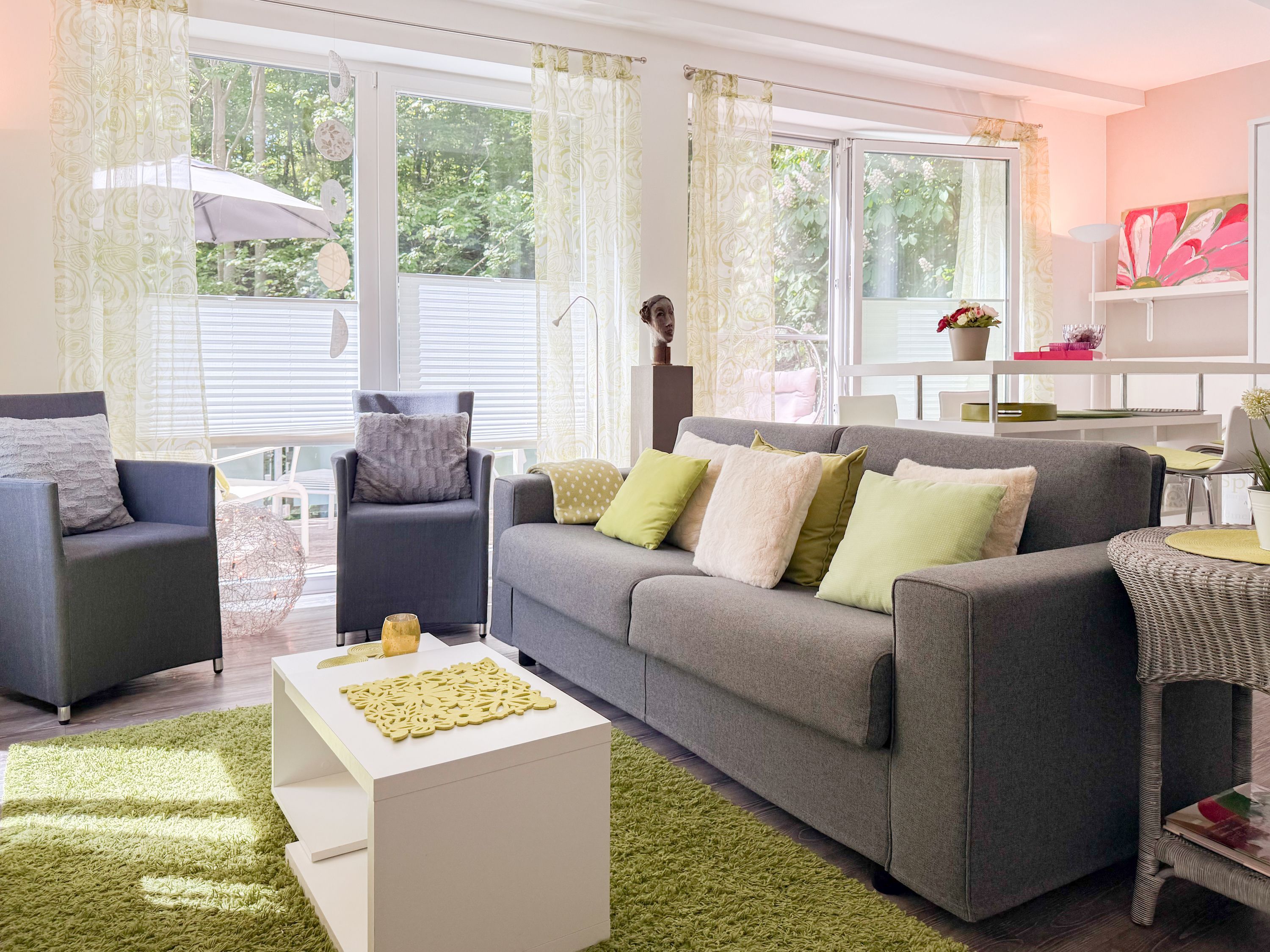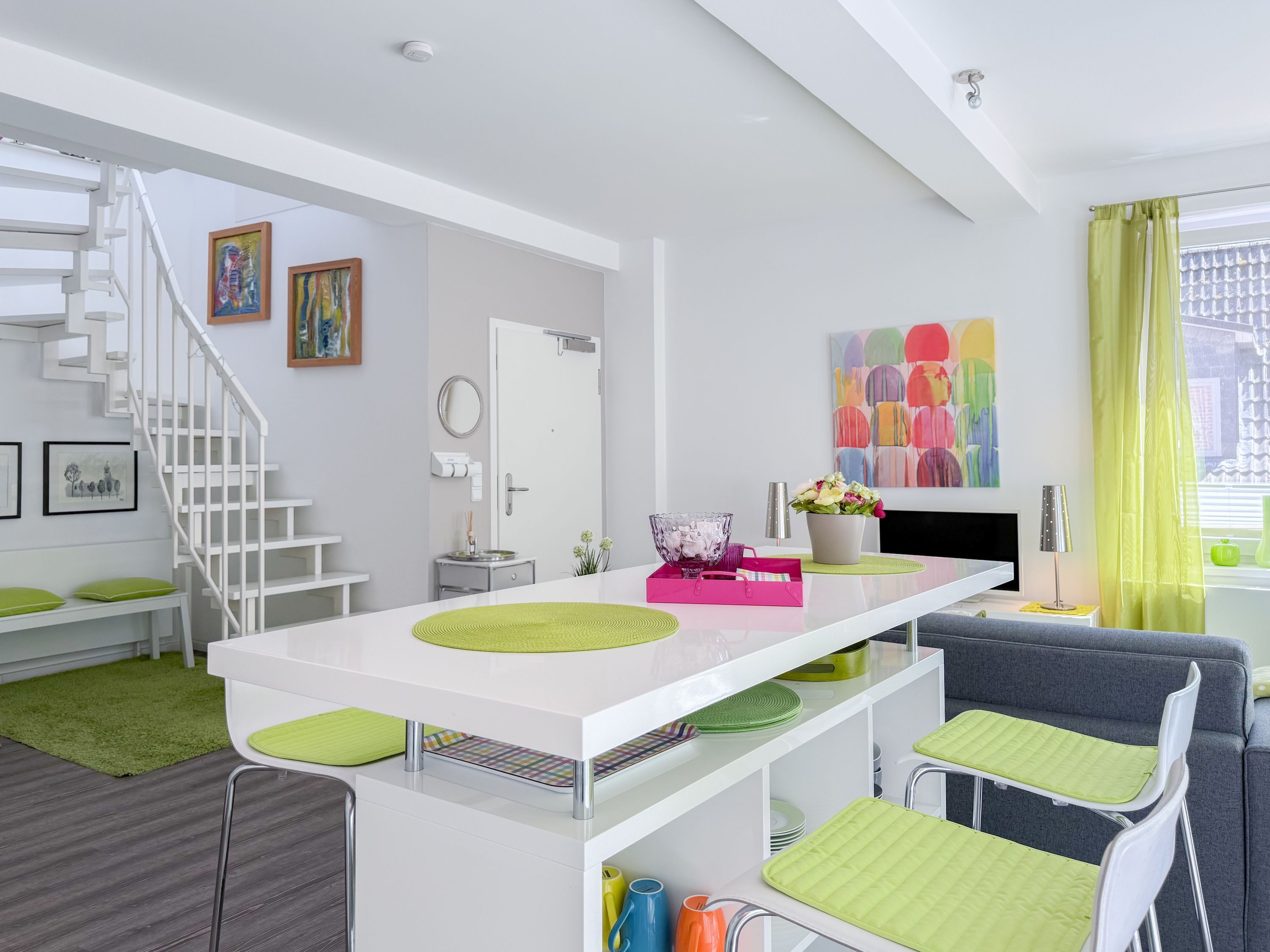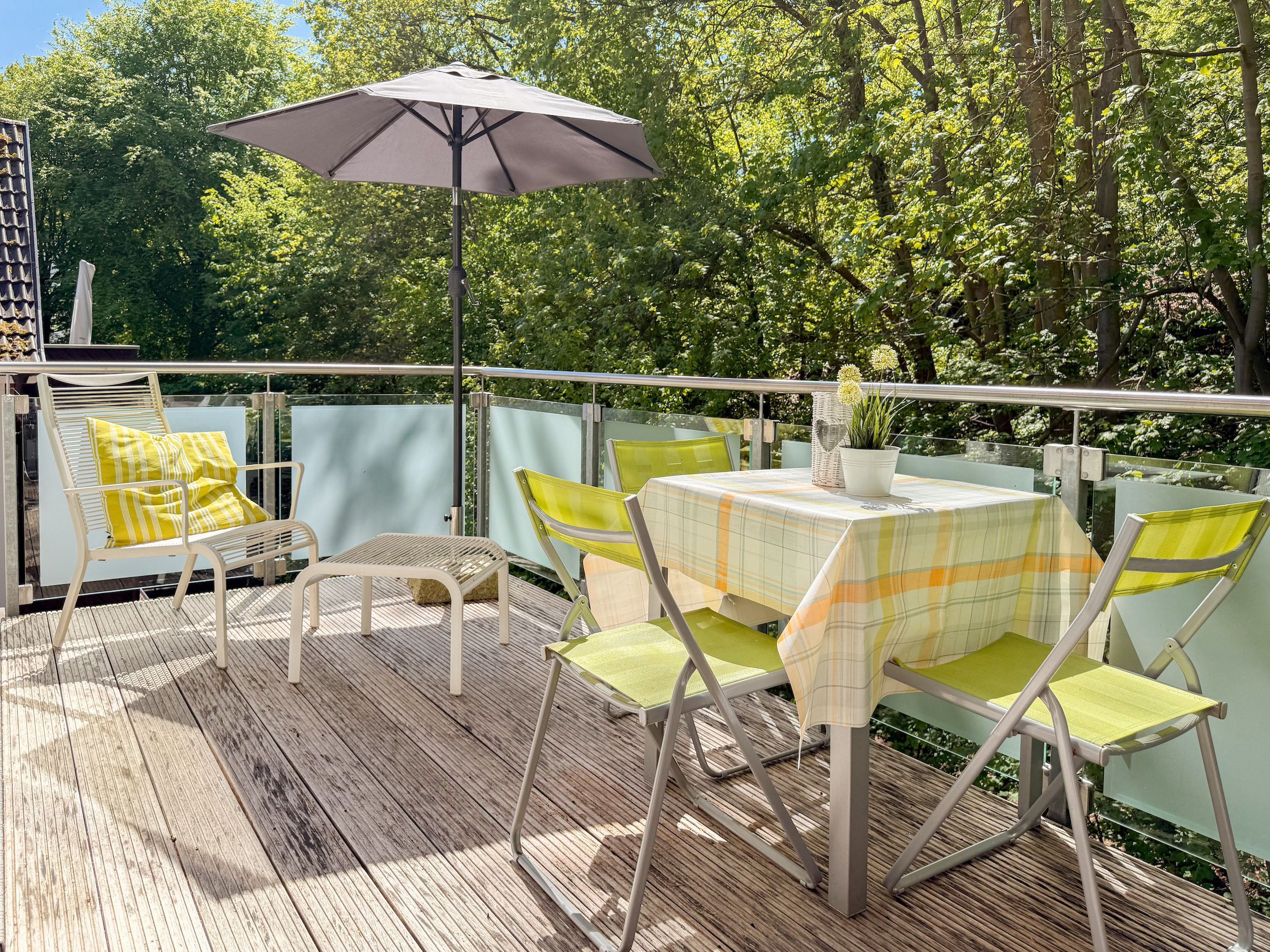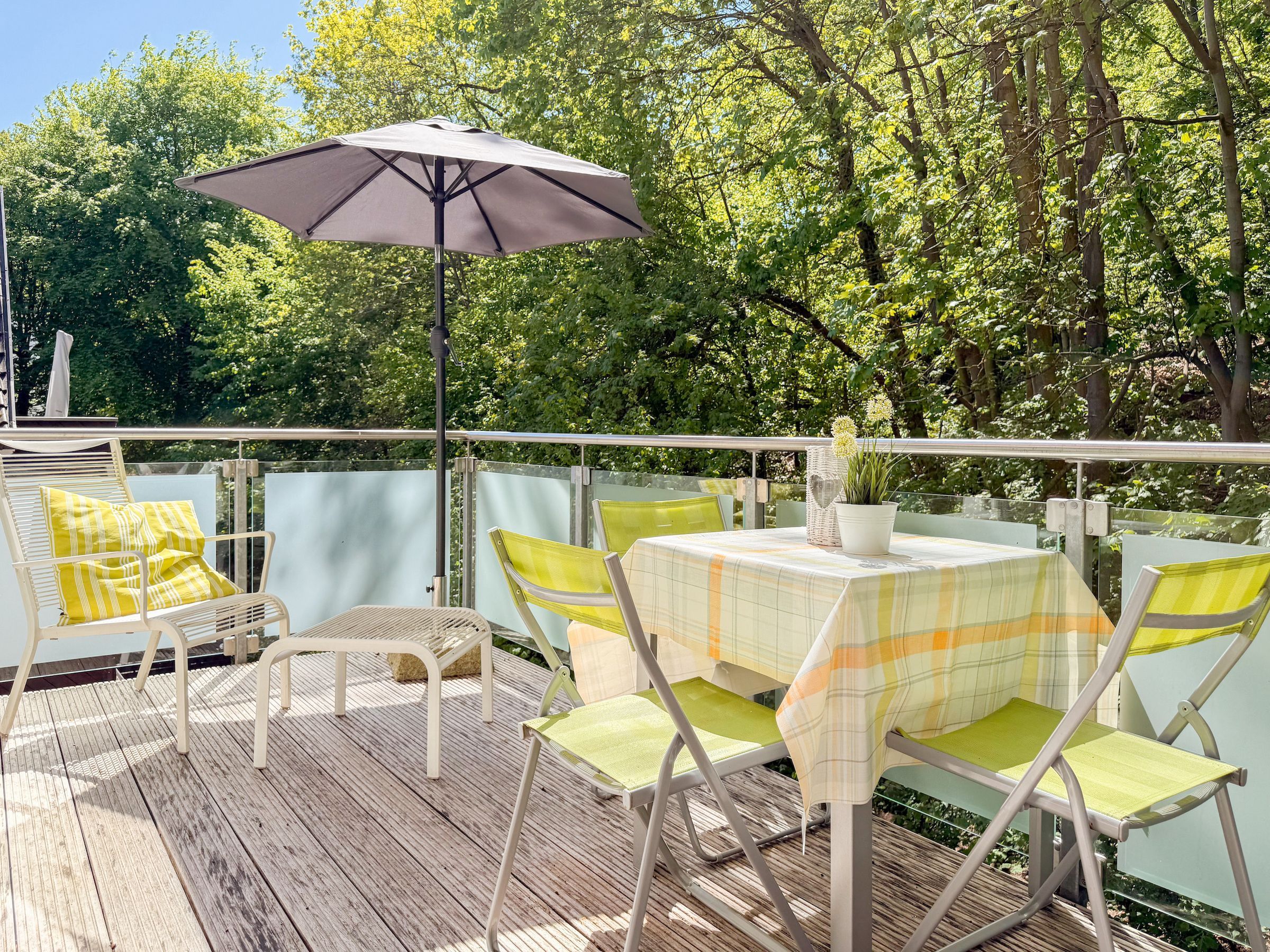 Diese Wohnung erstreckt sich über zwei Ebenen. Im unteren Bereich finden Sie einen gemütlichen Wohnbereich mit einem hochwertigen Schlafsofa, einen Essbereich sowie eine gut ausgestattete Küche. Durch eine praktische Schiebetür lässt sich der Bereich bei Bedarf verstecken. Der großzügige Balkon bietet absolute Privatsphäre und besticht durch einen herrlichen Blick ins Grüne perfekt für entspannte Stunden im Freien. Eine Garderobe und ein separates Gäste WC sind ebenfalls auf der unteren Wohnebene unterbracht. Das Dachgeschoss ist über eine Wendeltreppe zu erreichen. Dort gibt es eine kleine Galerie mit einem Schreibtisch perfekt für Workation oder kreative Pausen. Das großzügige Schlafzimmer ist mit einer Klimaanlage, einem zusätzlichen TV und Verdunkelungsvorhängen ausgestattet. Das exklusive Duschbad mit Tageslichtfenster sorgt für ein angenehmes und helles Ambiente.