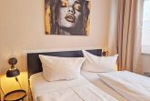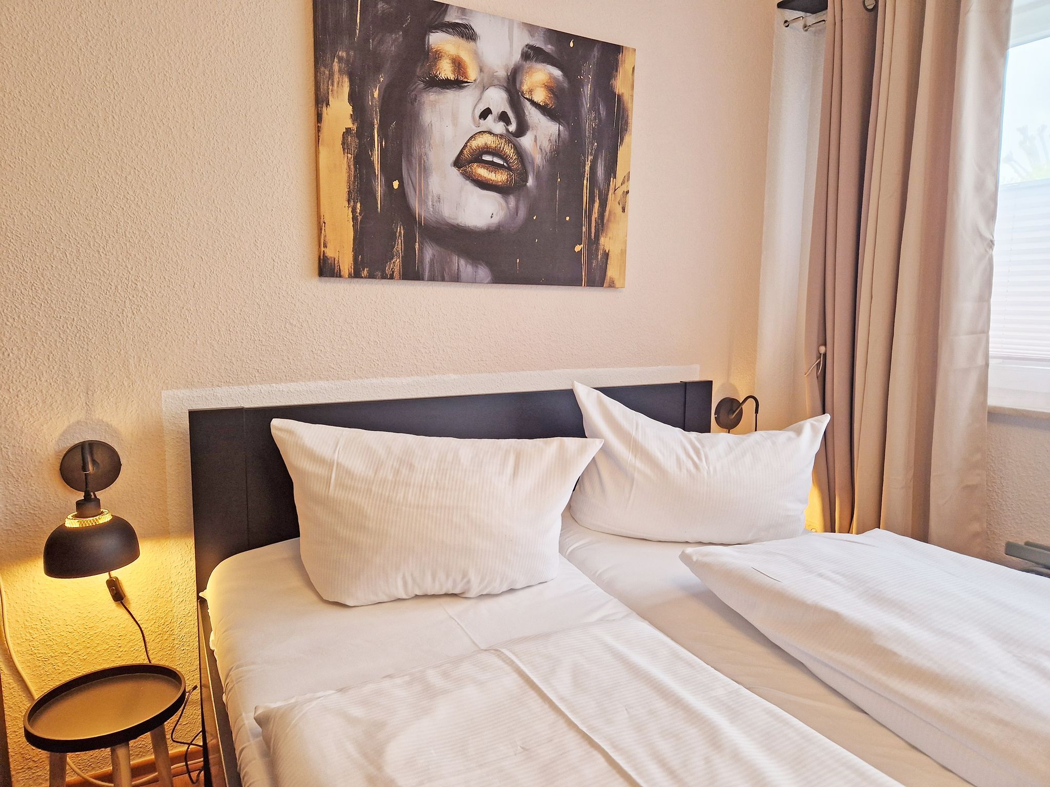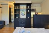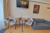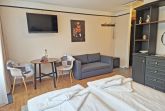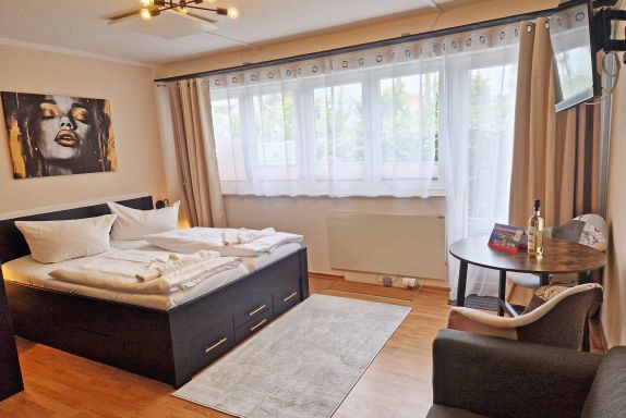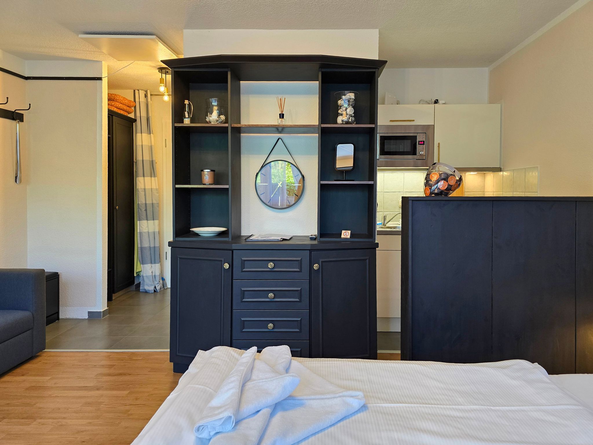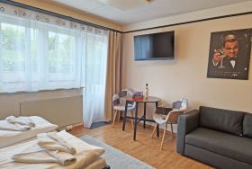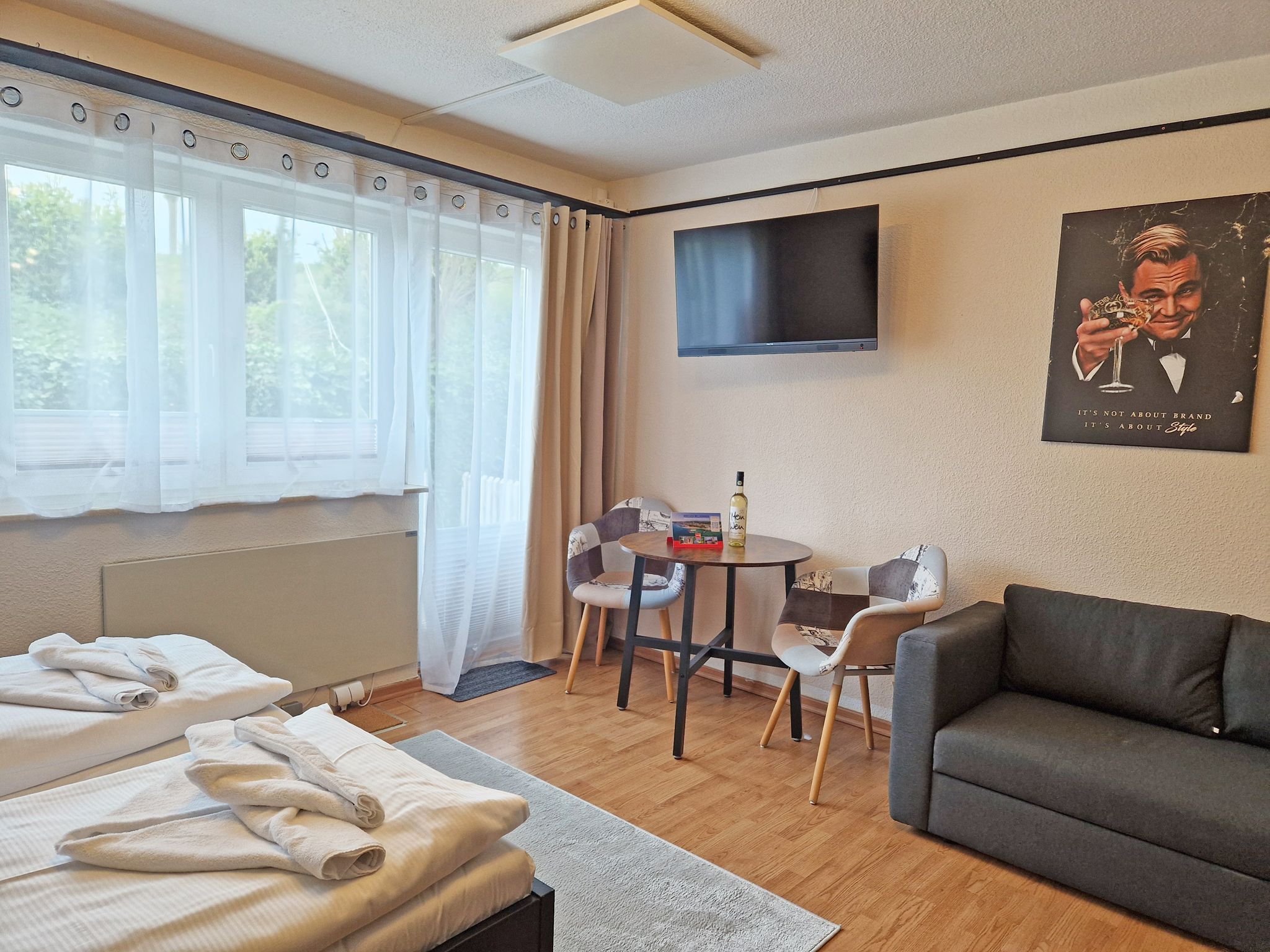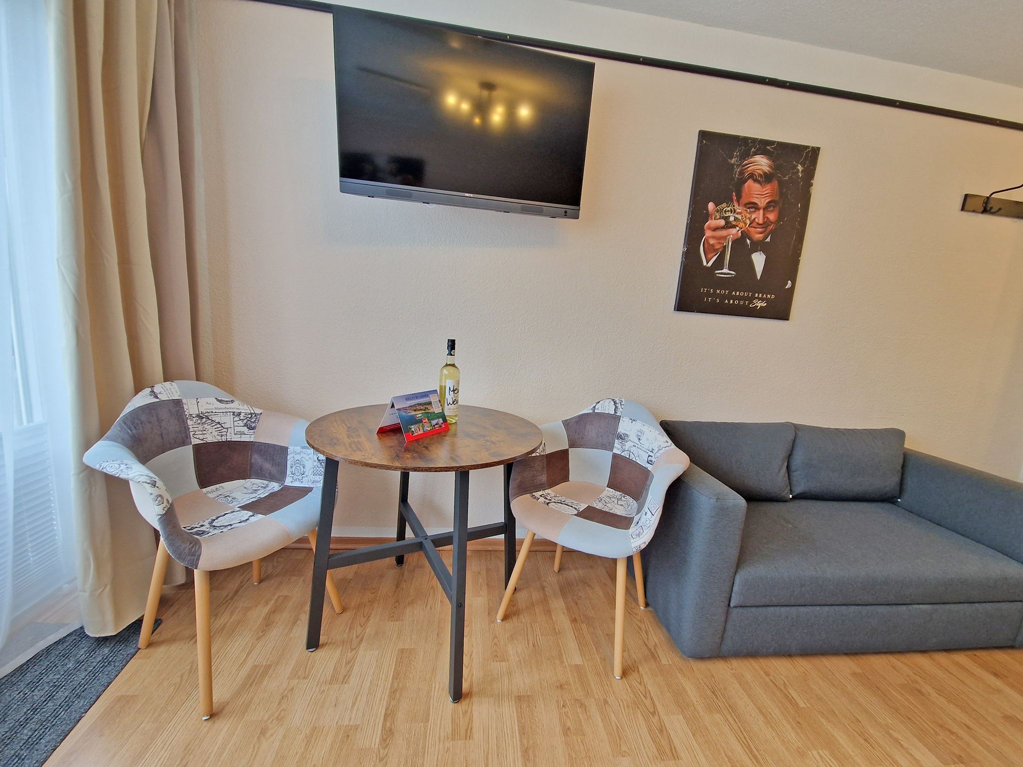 • kombiniertes Wohn-/Schlafzimmer mit Doppelbett (1,60 m x 2 m), ausziehbare Schlafcouch (1,90 m x 0,71 m) , Kleiderschrank, Essecke, Fernseher (Smart-TV) und kostenloses WLAN