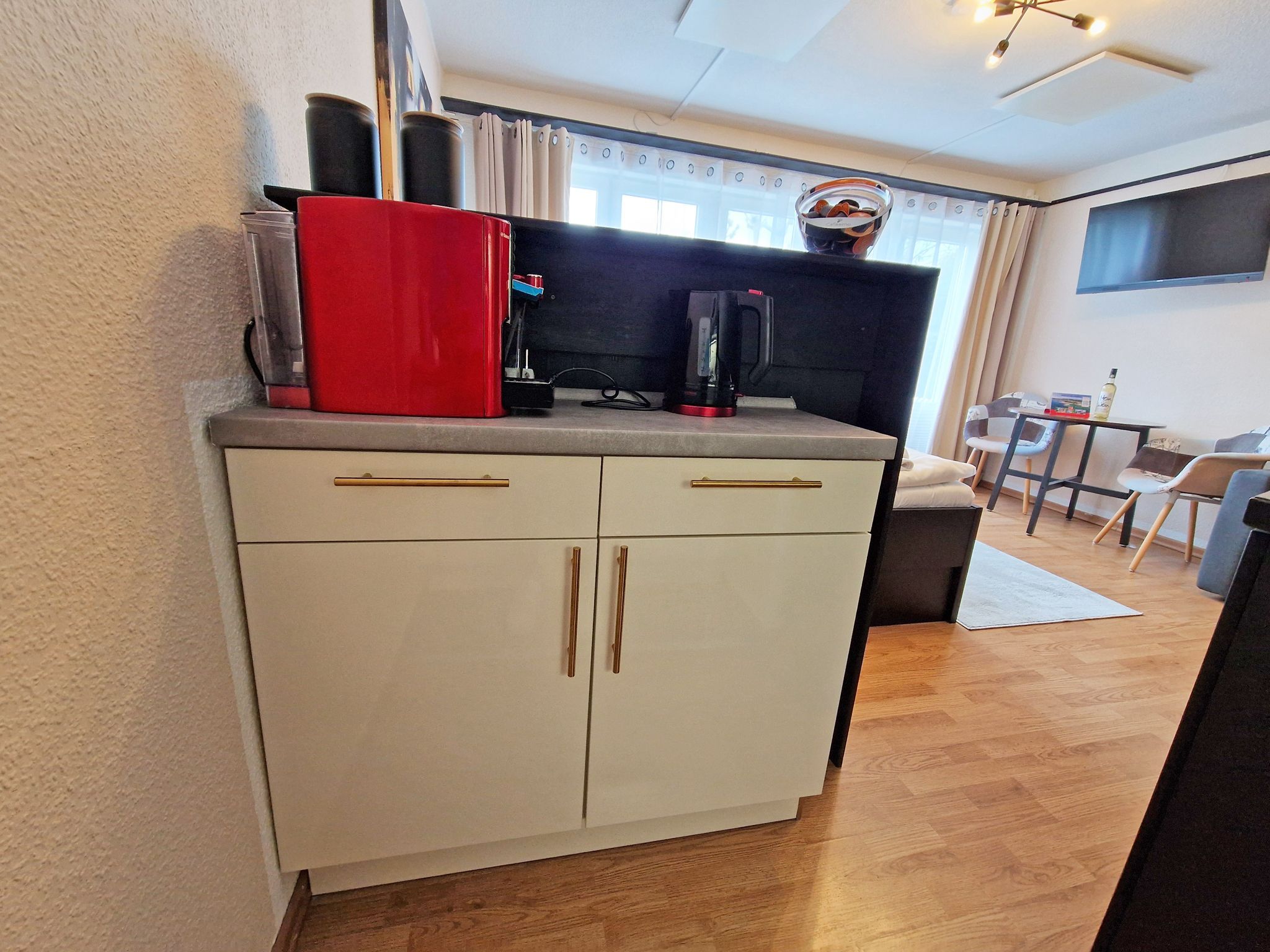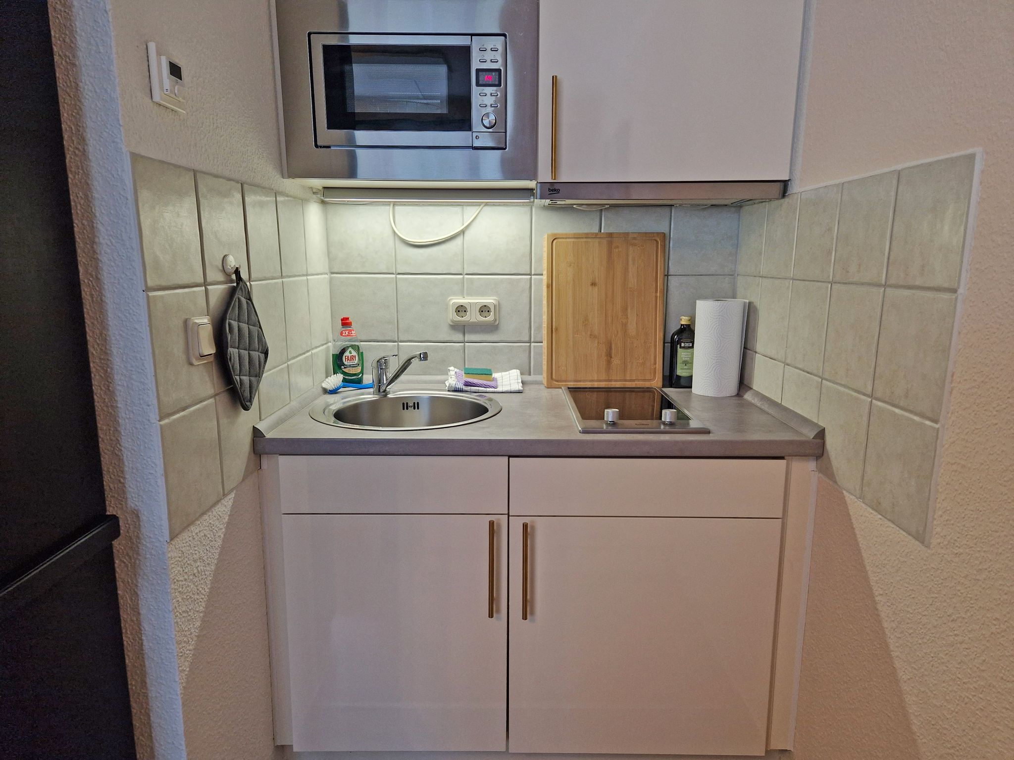 • komplett ausgestattete Küchenzeile mit 2-Plattenceranfeld, Mikrowelle, Kühlschrank mit Eisfach, Tchibo Cafissimo, Wasserkocher, Toaster, Filter-Kaffeemaschine