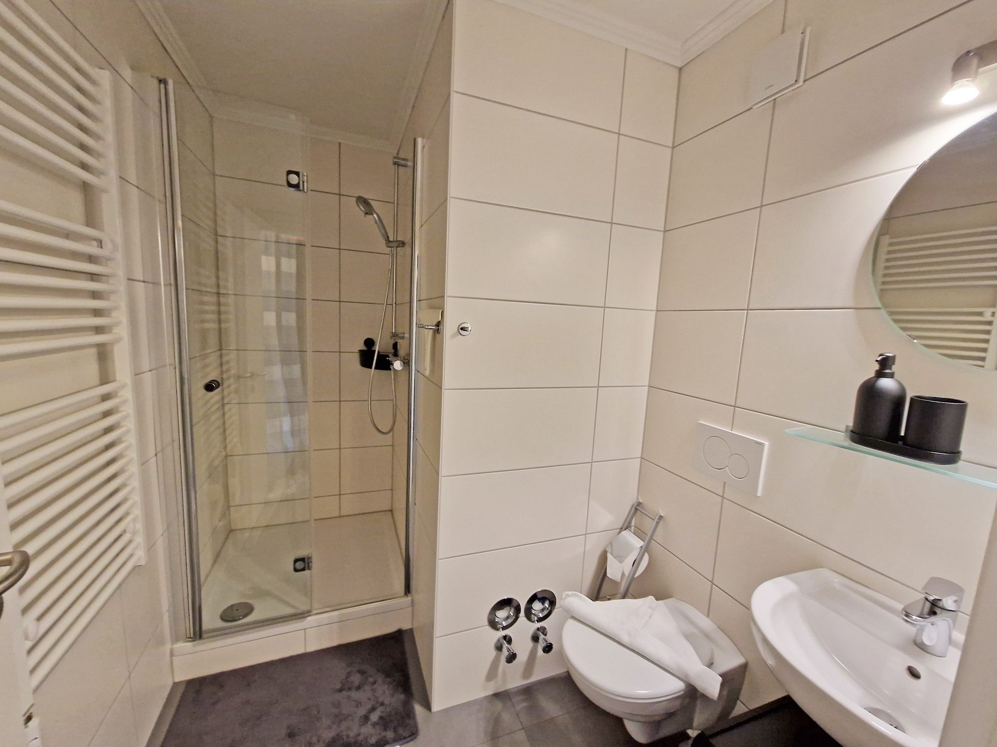 • Badezimmer mit Dusche, WC, Handtuchheizung und Haartrockner