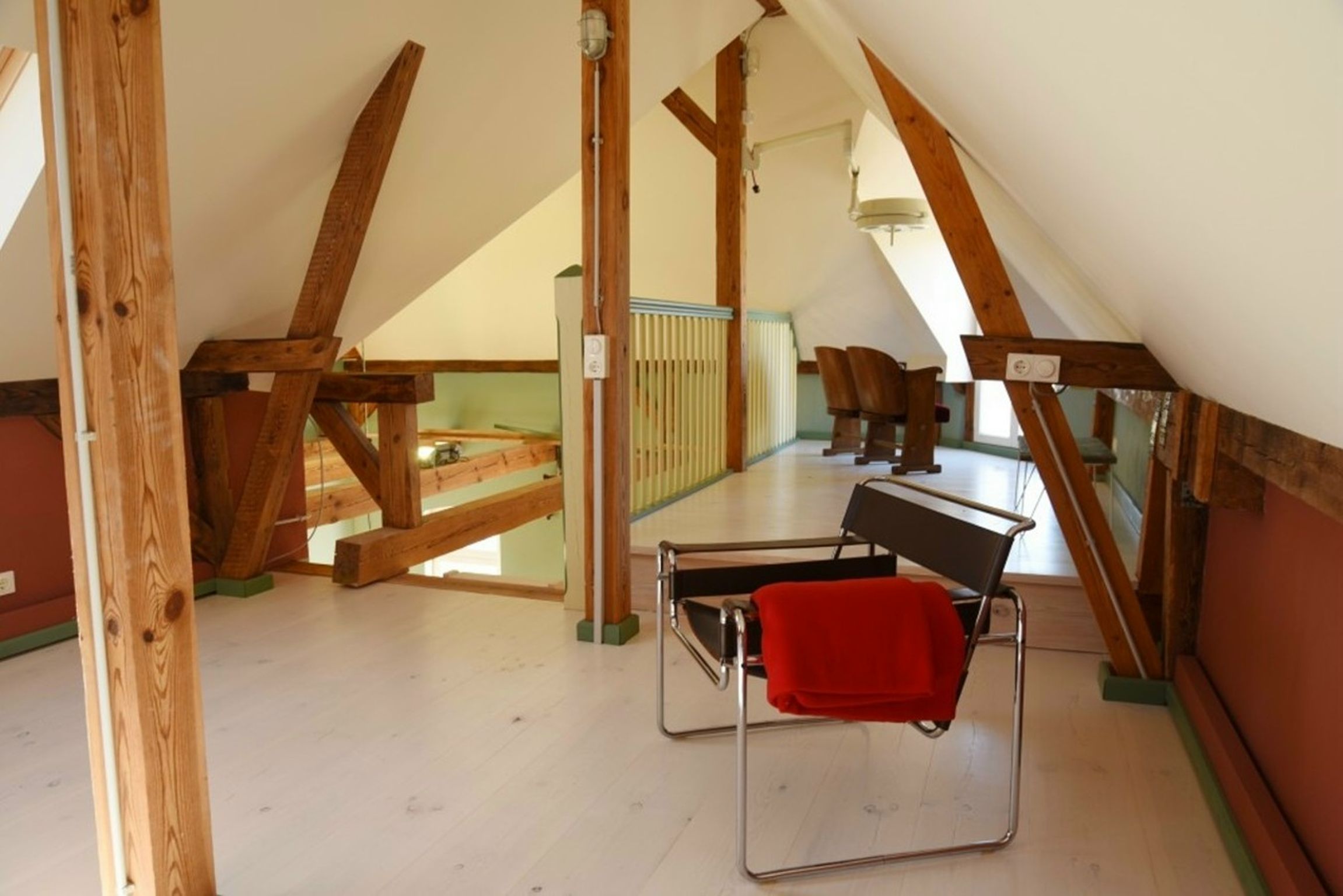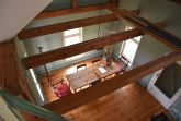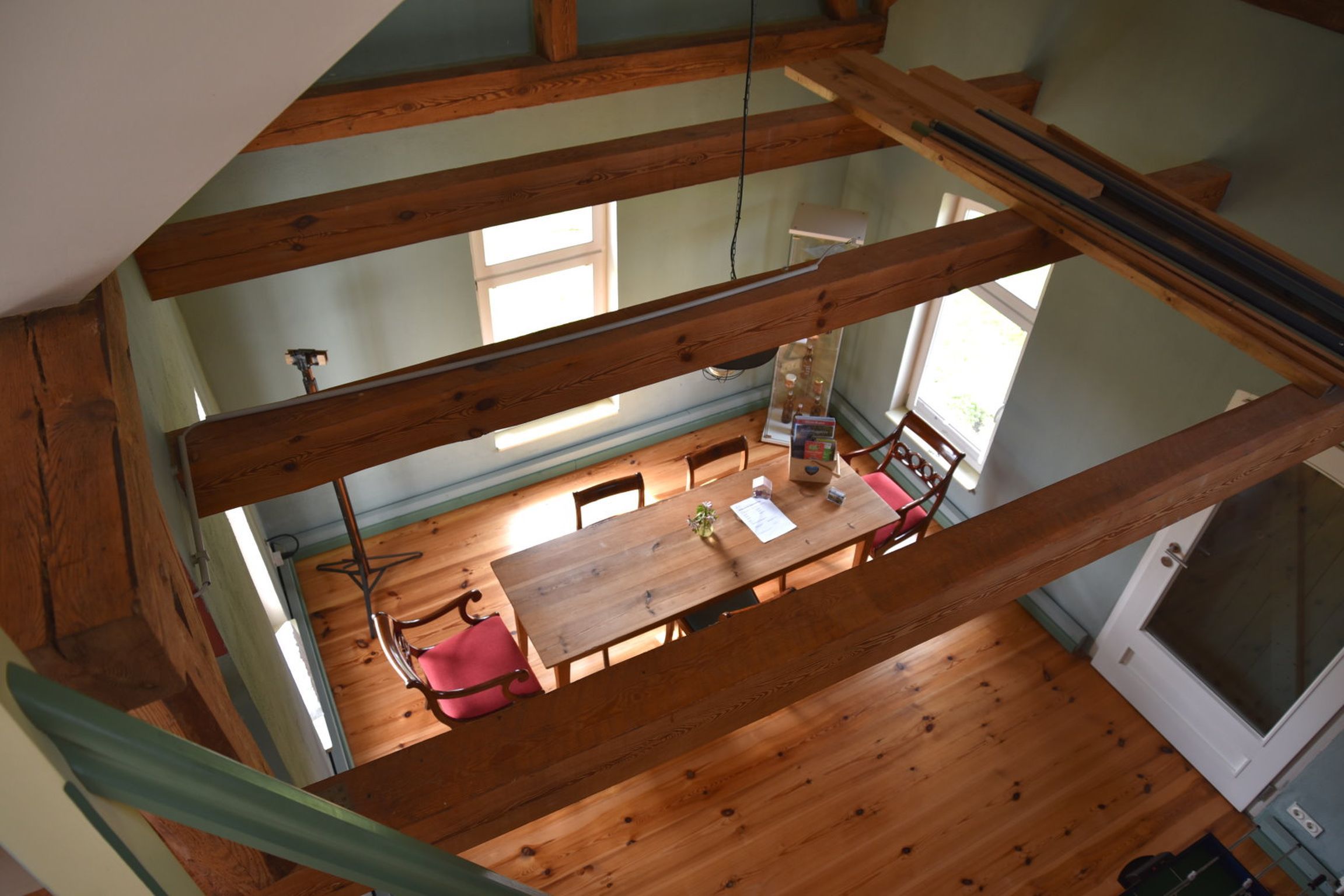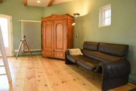 Das angrenzende Wirtschaftsgebäude, ebenfalls unter Denkmalschutz stehend, wurde von 2015-2018 zu einer einzigartigen Ferienwohnung ausgebaut. Der Innenraum wurde in Anlehnung an das Farbkonzept des Haupthauses gestaltet. Die Raumaufteilung entspricht dem historischen Grundriss als Stall und Heulager. Das aktuelle Mini-Bad beispielsweise war ursprünglich eine Dämpfküche für Tierfutter. Der Sitzplatz mit Blick über die Streuobstwiese im OG war die Luke für das Heu.