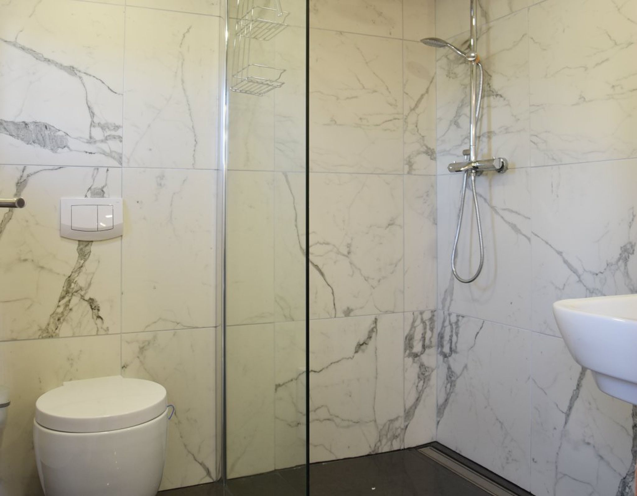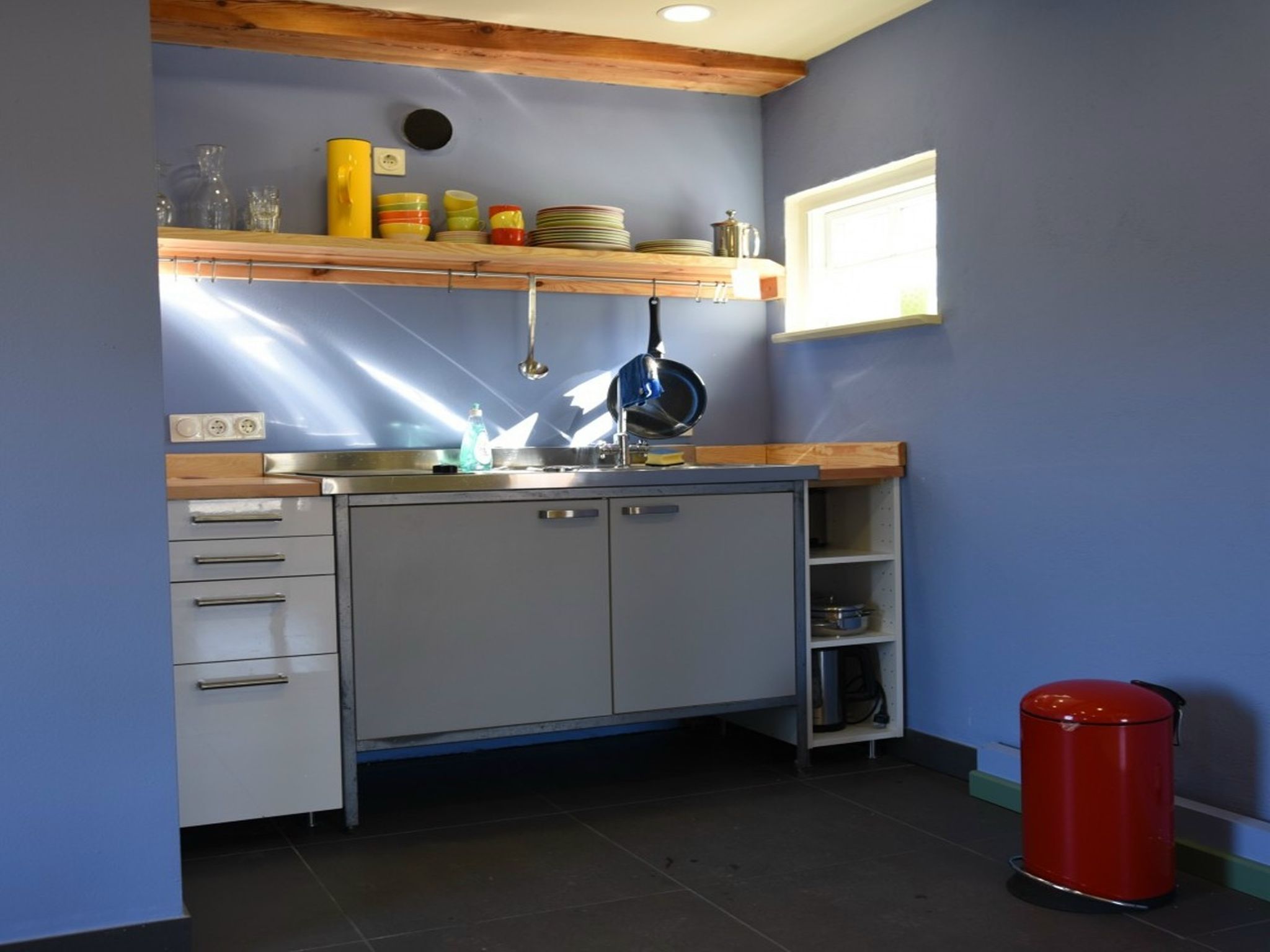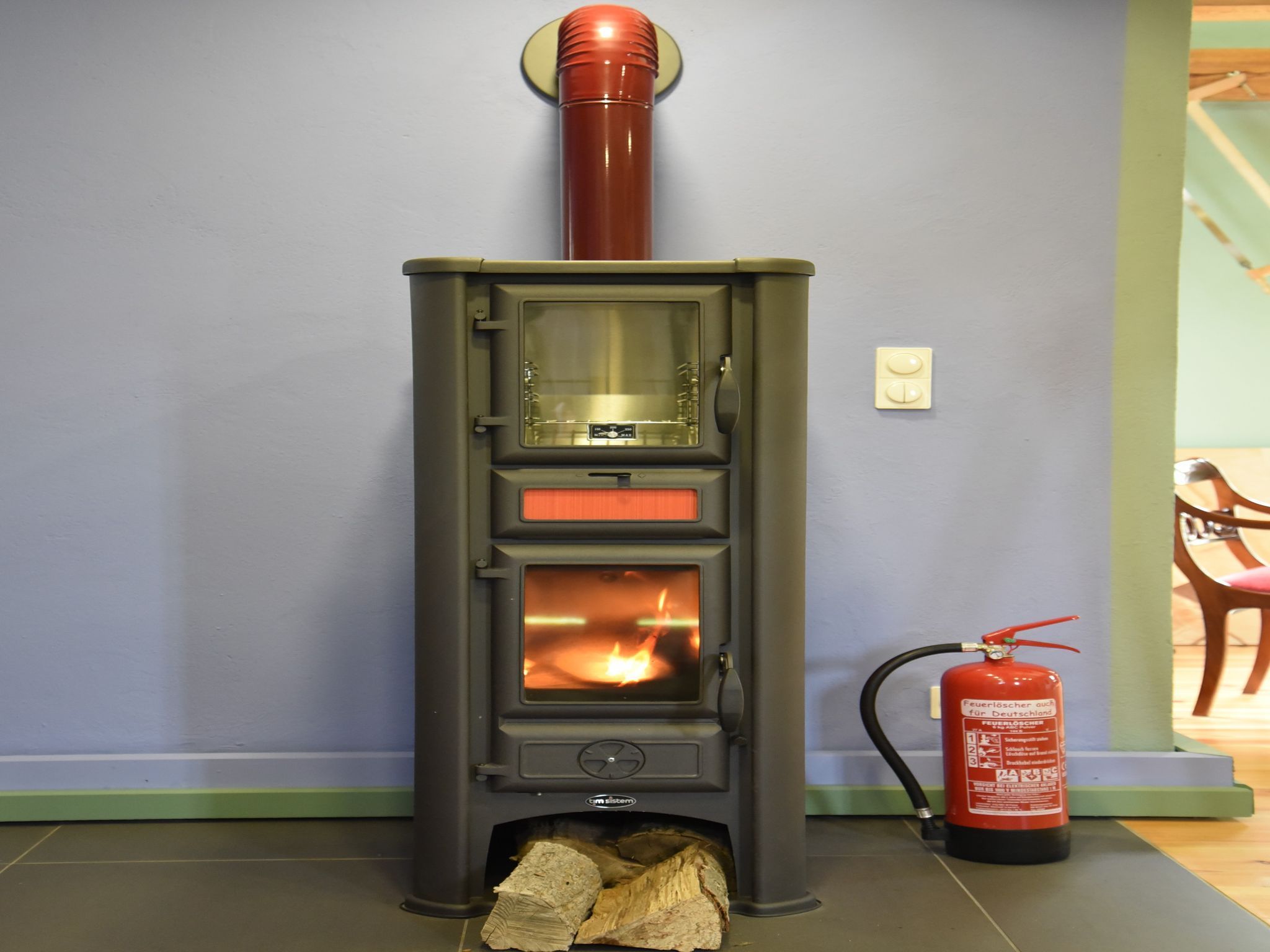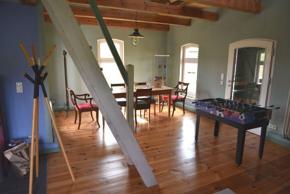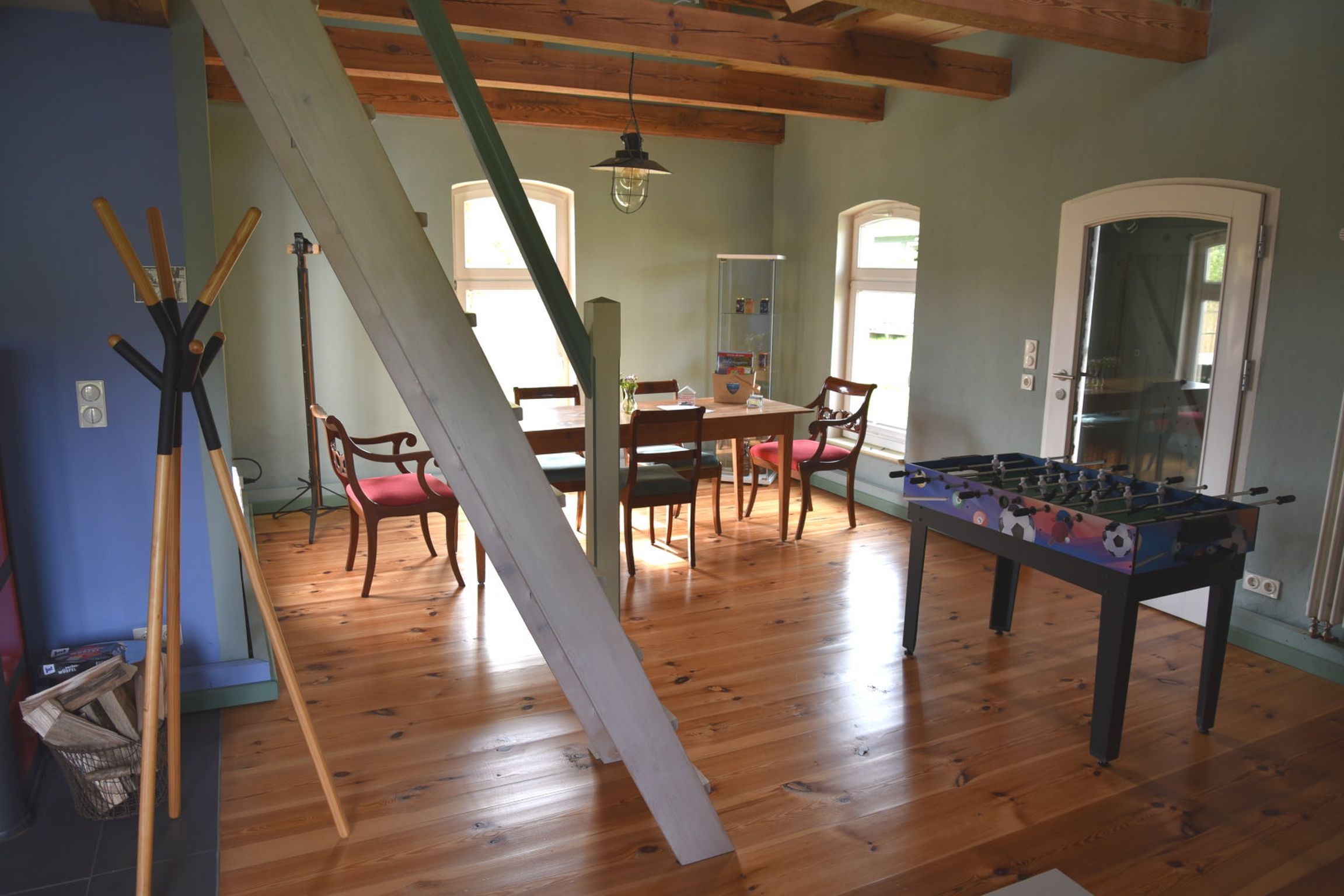 Im Erdgeschoss erwartet Sie ein offener Wohnbereich mit viel Platz zum Entspannen: ein großer Esstisch für gemeinsame Mahlzeiten, ein gemütliches Sofa, ein Ofen für wohlige Wärme und sogar ein Tischkicker für spielerische Abwechslung. Die kompakte Küchenzeile ist funktional ausgestattet, und das kleine Bad mit Dusche bietet alles, was man für einen angenehmen Aufenthalt braucht.