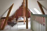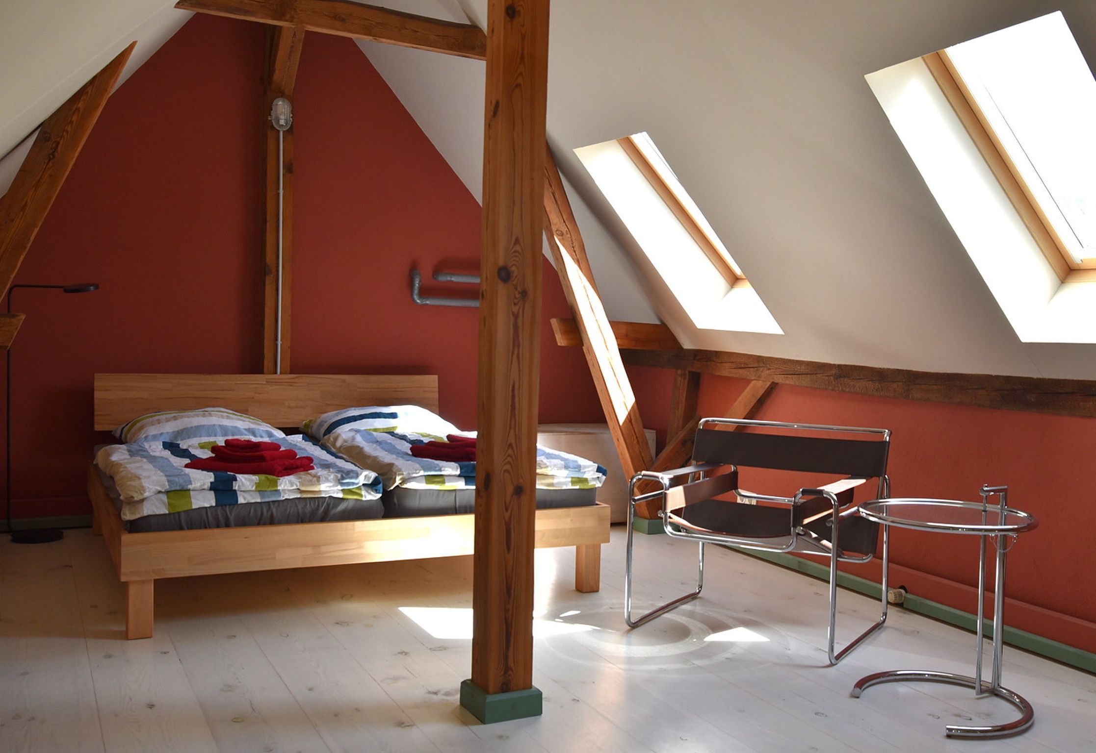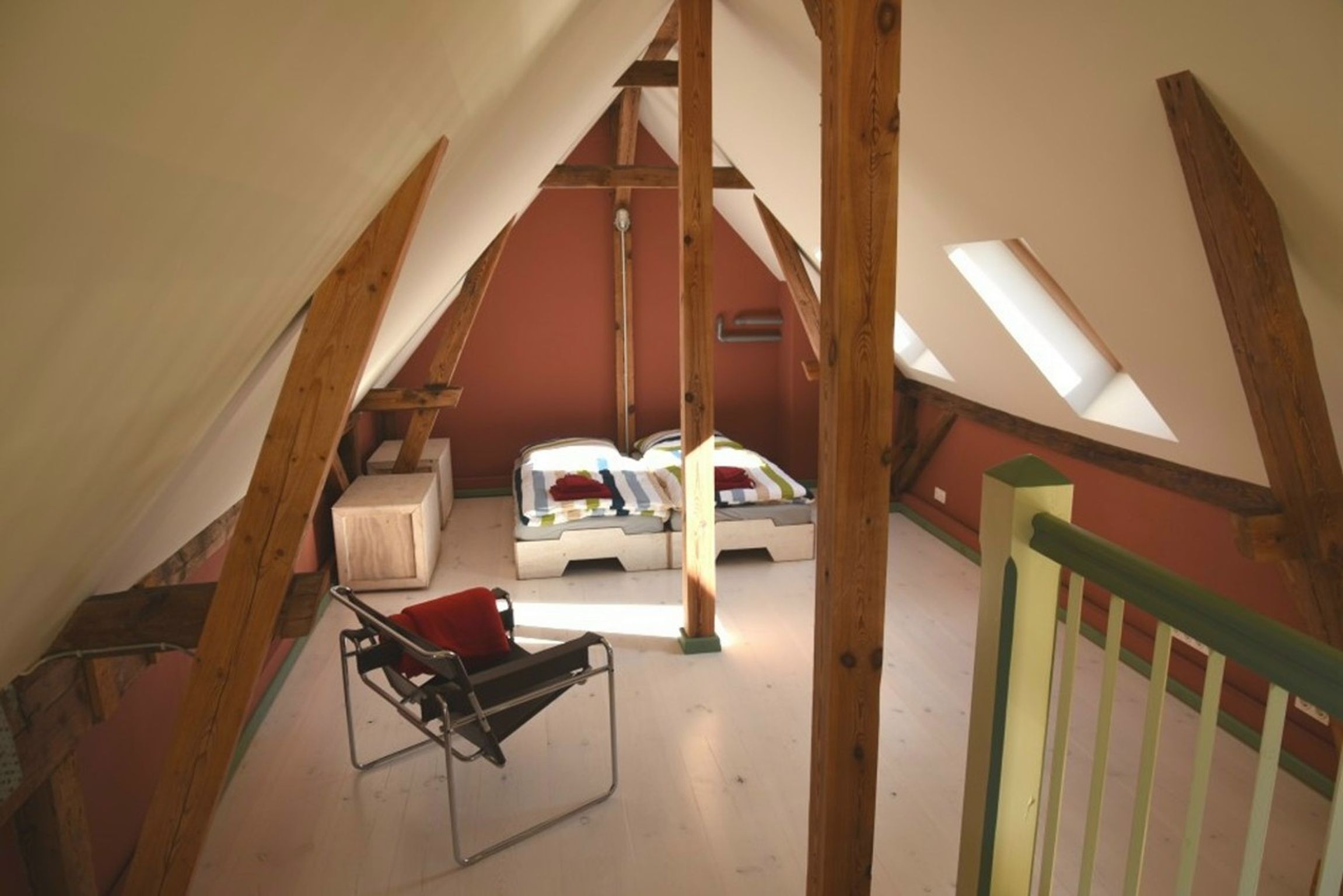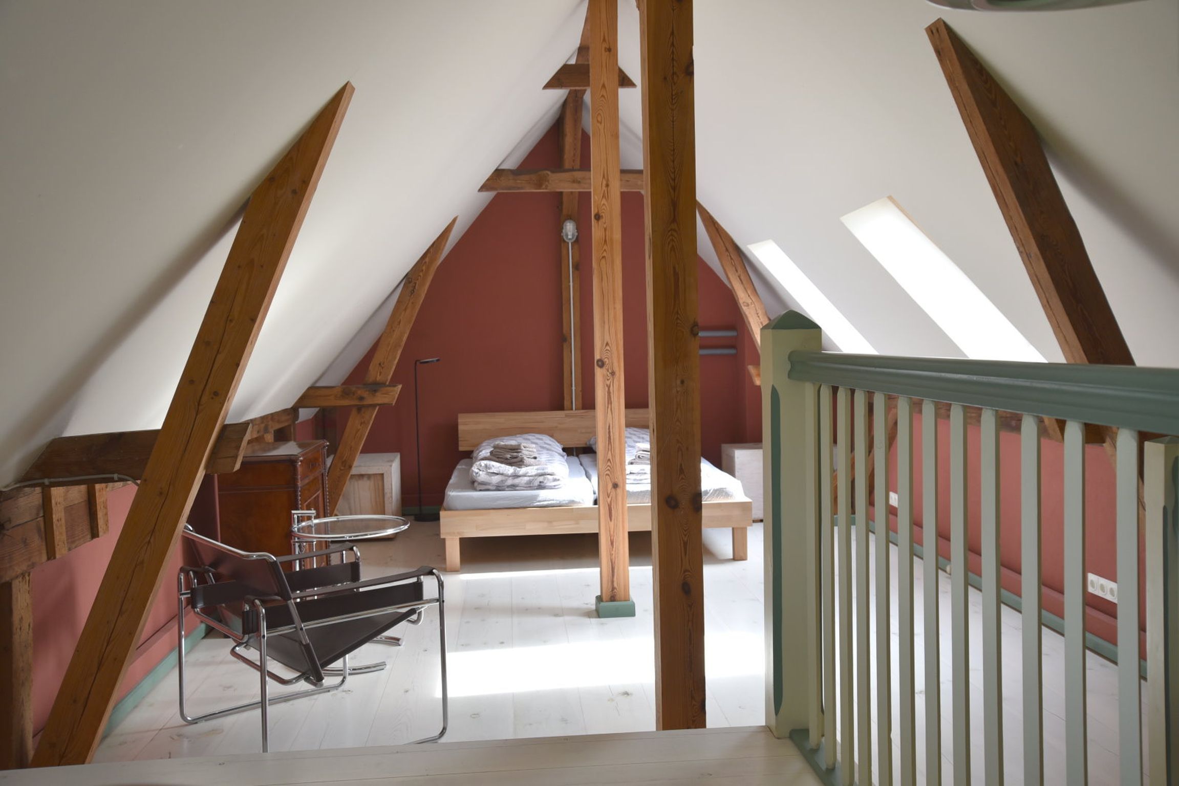 Über eine offene Treppe gelangen Sie auf die Galerie. Hier befindet sich das großzügige Doppelbett sowie eine stilvolle Sitzecke unter den Dachschrägen. Die natürliche Holzstruktur und das sanfte Licht durch die Dachfenster schaffen eine behagliche Wohlfühlatmosphäre. Auf einen Fernseher wurde bewusst verzichtet stattdessen laden Bücher, ein Teleskop unter dunklem Sternenhimmel und die Natur zum Entschleunigen ein. Für digitale Bedürfnisse steht jedoch schnelles Internet mit stabilem WLAN zur Verfügung.