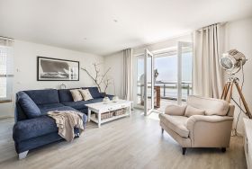 Die Ferienwohnung 3.1 ist eine mit viel Liebe eingerichtete und gemütliche 3-Raum-Wohnung mit einem 20 m² großen Balkon. Die Küchenzeile und der Essbereich sind direkt im Wohnbereich integriert. Die beiden Bäder verfügen über ebenerdige Duschen, Handtuchtrockner und Haar-Föhn. In einem der Bäder befindet sich eine Sauna. Vom Wohnbereich gelangen Sie direkt auf den Balkon.
