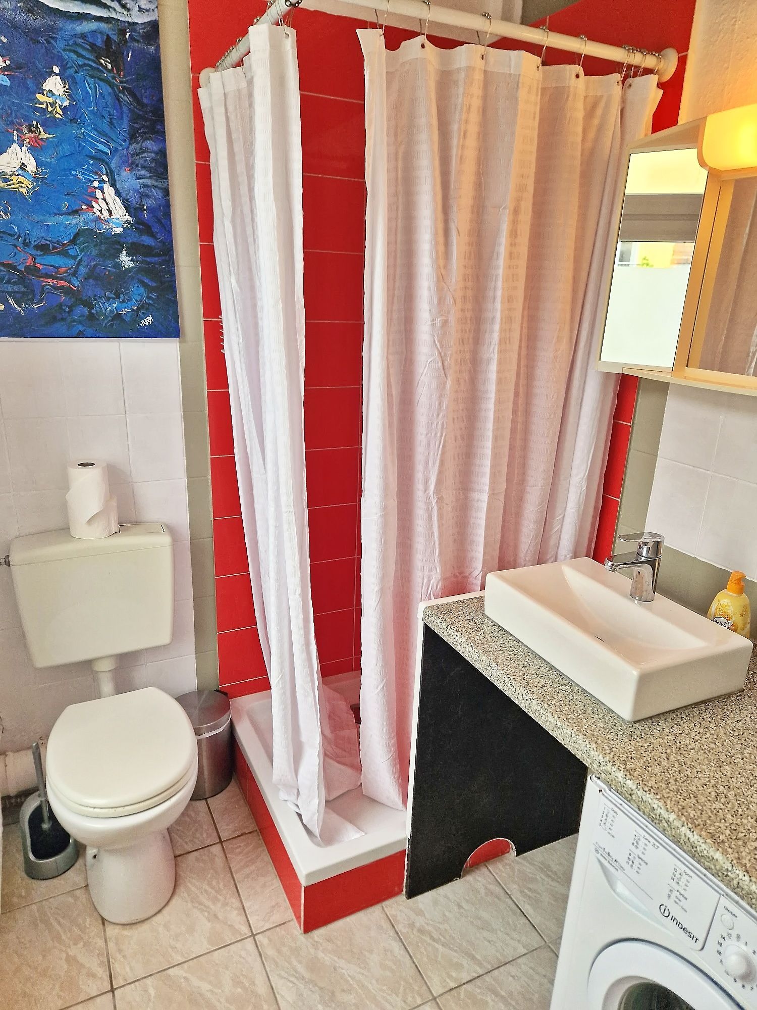 - Bad mit Dusche, WC, Waschbecken und Fenster