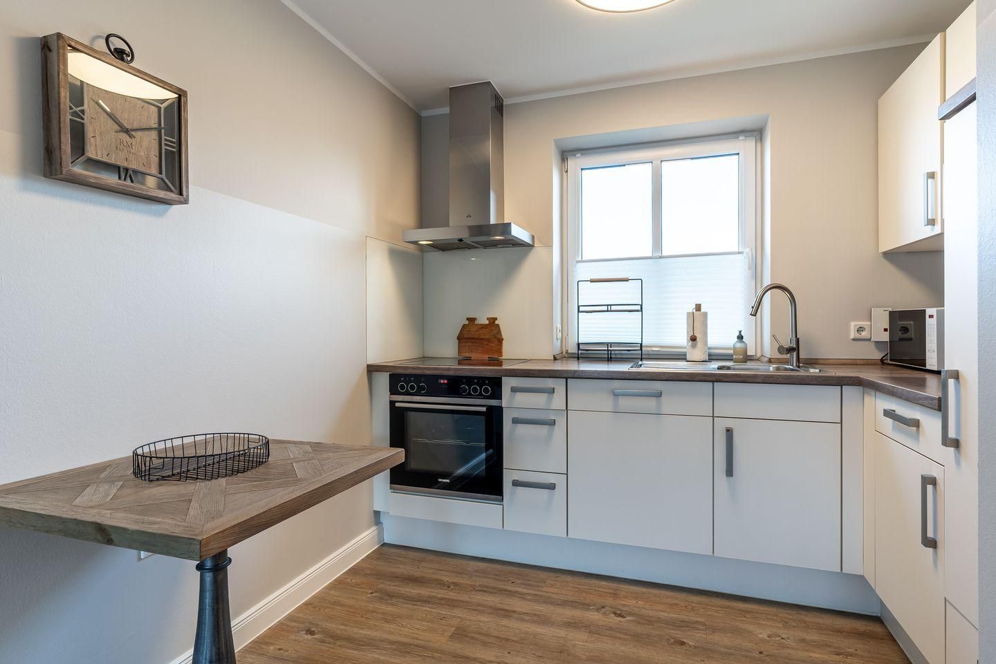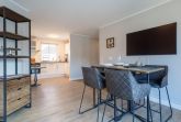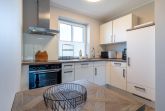 Diese moderne und stilvoll eingerichtete Wohnung bietet auf 60 m² genügend Platz für bis zu drei Personen. Der offene Wohnbereich verbindet Küche und Wohnzimmer harmonisch und ist der perfekte Ort, um sich nach einem erlebnisreichen Tag zu entspannen. Genießen Sie die Zeit bei einem gemütlichen Abendessen, das Sie in der voll ausgestatteten Küche zubereiten können. Hier stehen Ihnen moderne Geräte wie ein Cerankochfeld, Backofen, Kühlschrank mit Gefrierfach, Geschirrspüler, sowie kleine Küchengeräte wie Wasserkocher und Kaffeemaschine zur Verfügung.