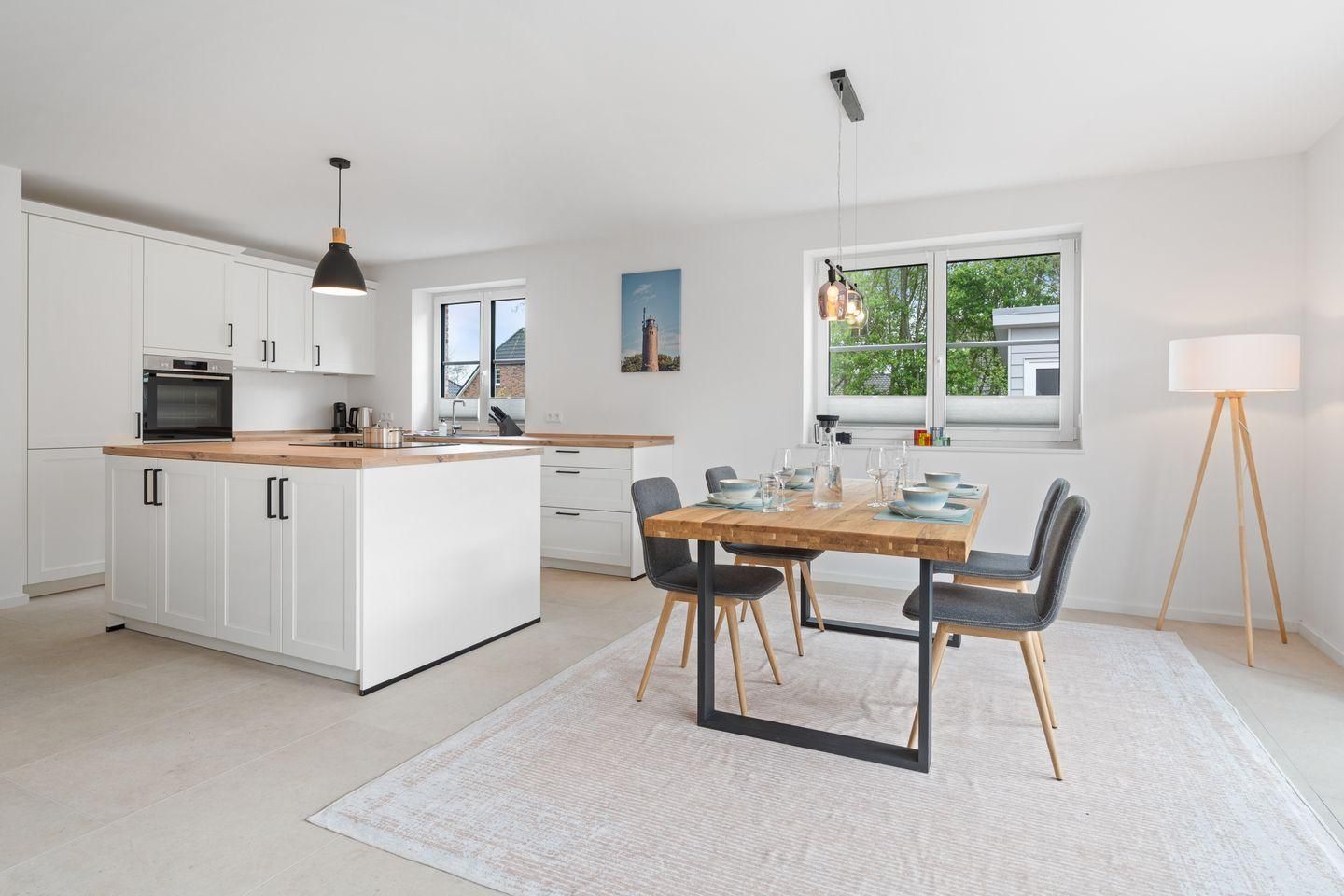 Das Herzstück der Unterkunft ist die offene Küche, die harmonisch mit dem Wohnzimmer verbunden ist und zum gemeinsamen Kochen und Entspannen einlädt. Die moderne Küche ist mit einem Induktionsherd, Backofen, Kühlschrank mit Gefrierfach und Geschirrspüler ausgestattet. Ein Wasserkocher und eine Kaffeemaschine sorgen für den perfekten Start in den Tag