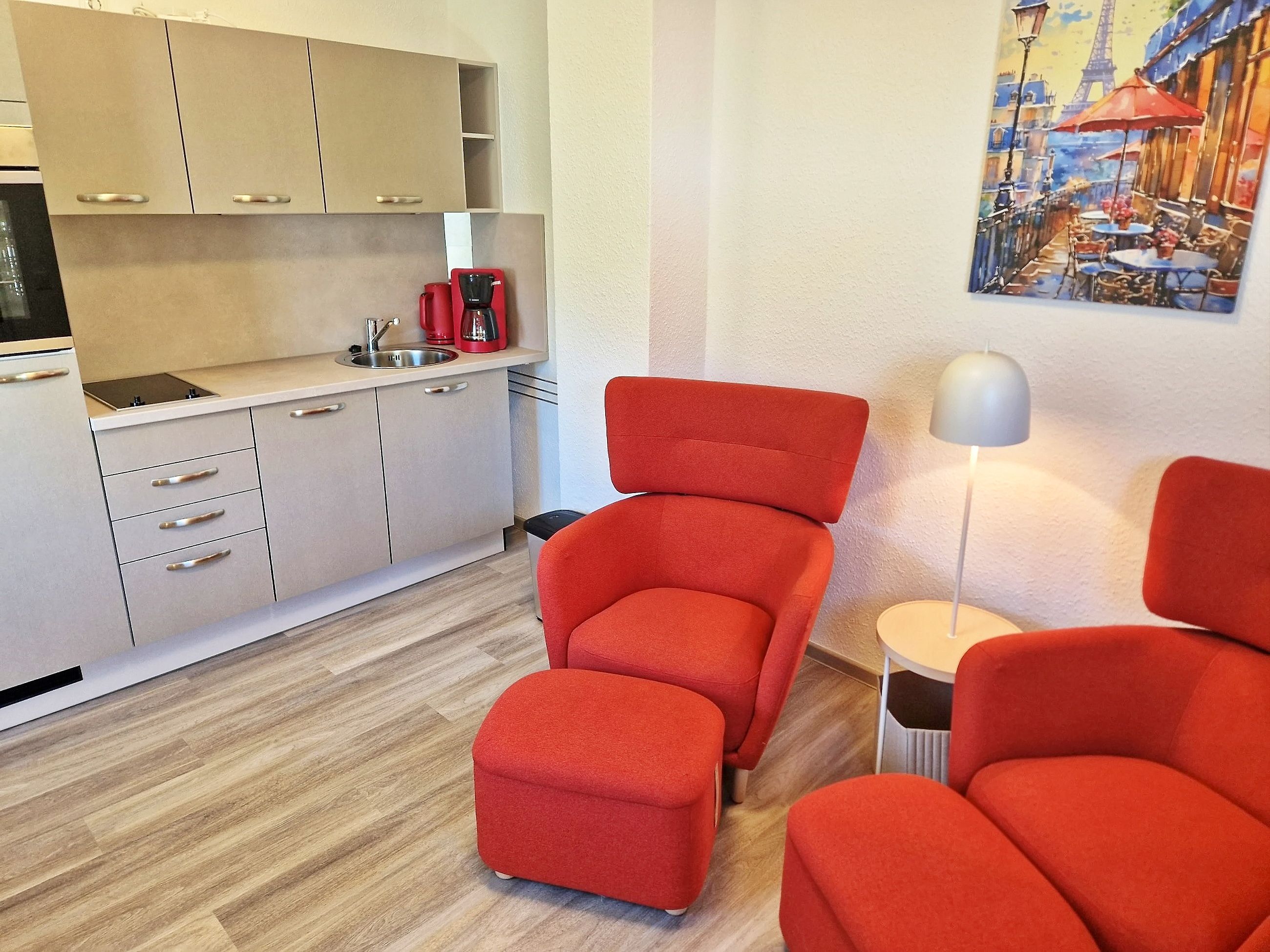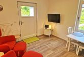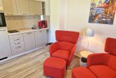 - Wohnzimmer mit offener Küche, 2 Sessel, Flat-TV, Essbereich für 2 Personen