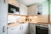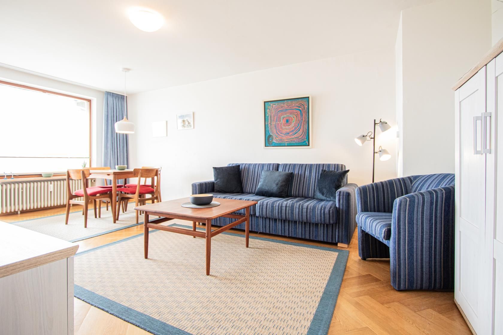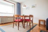 Das Wohnzimmer ist mit Parkett ausgelegt. Es ist eingerichtet mit einer Couchgarnitur ( Schlafcouch 1,70 m breit). Ferner gibt es den Essplatz für 4 Personen und harmonisch auf die Einrichtung abgestimmt, helle Wohnzimmermöbel. Vor dem Wohnzimmer ist der Ostbalkon. Die neue, separate Küche ist mit Mikrowelle, Backofen, Spülmaschine, Kaffeemaschine, Toaster und Wasserkochersowie allen wichtigen Utensilien ausgestattet. Kabel-TV, W-Lan und Internetradio sind vorhanden. Im Schlafzimmer, ebenfalls mit Ostbalkon, steht ein Doppelbett, das in einer Schrankwand integriert ist. Das geräumige Bad ist neu, mit hellen Fliesen und einer halbrunden Dusche ausgestattet. Insgesamt eine ansprechende, harmonische und gepflegte Ausstattung.