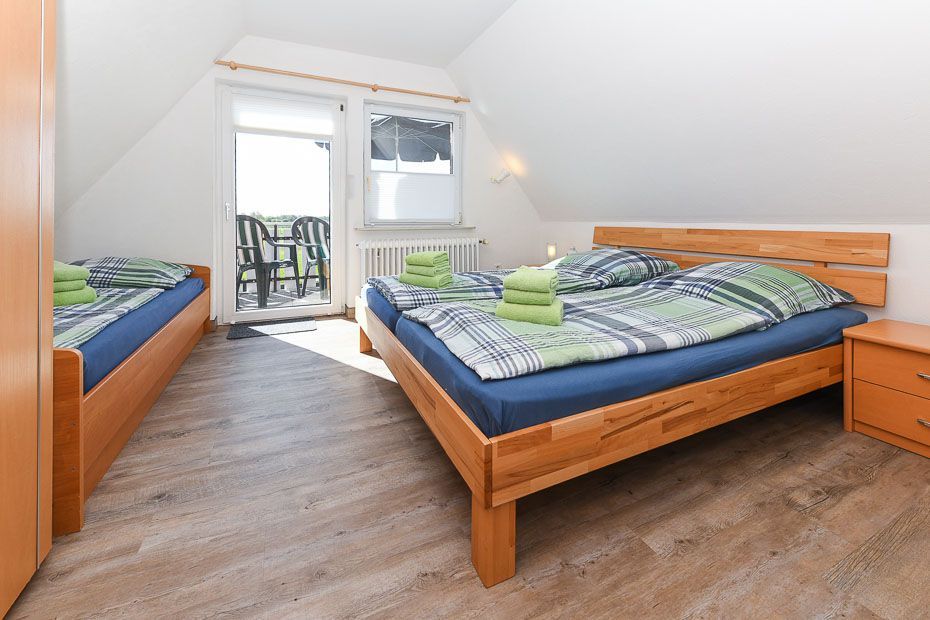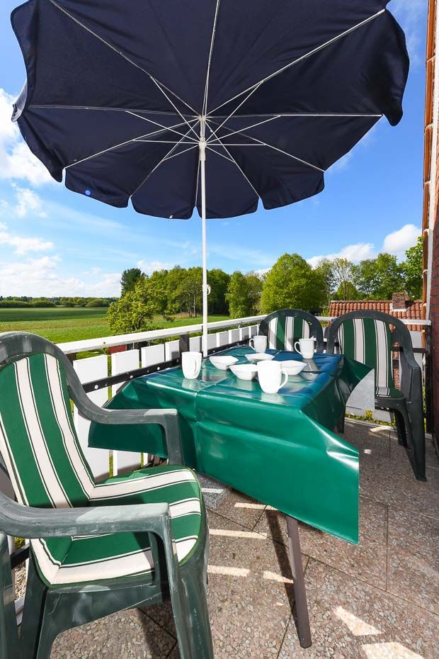 Auf dem großzügigen Balkon können Sie die herrliche Aussicht auf die Wiesen und Felder - eben die ostfriesische Weite - genießen.