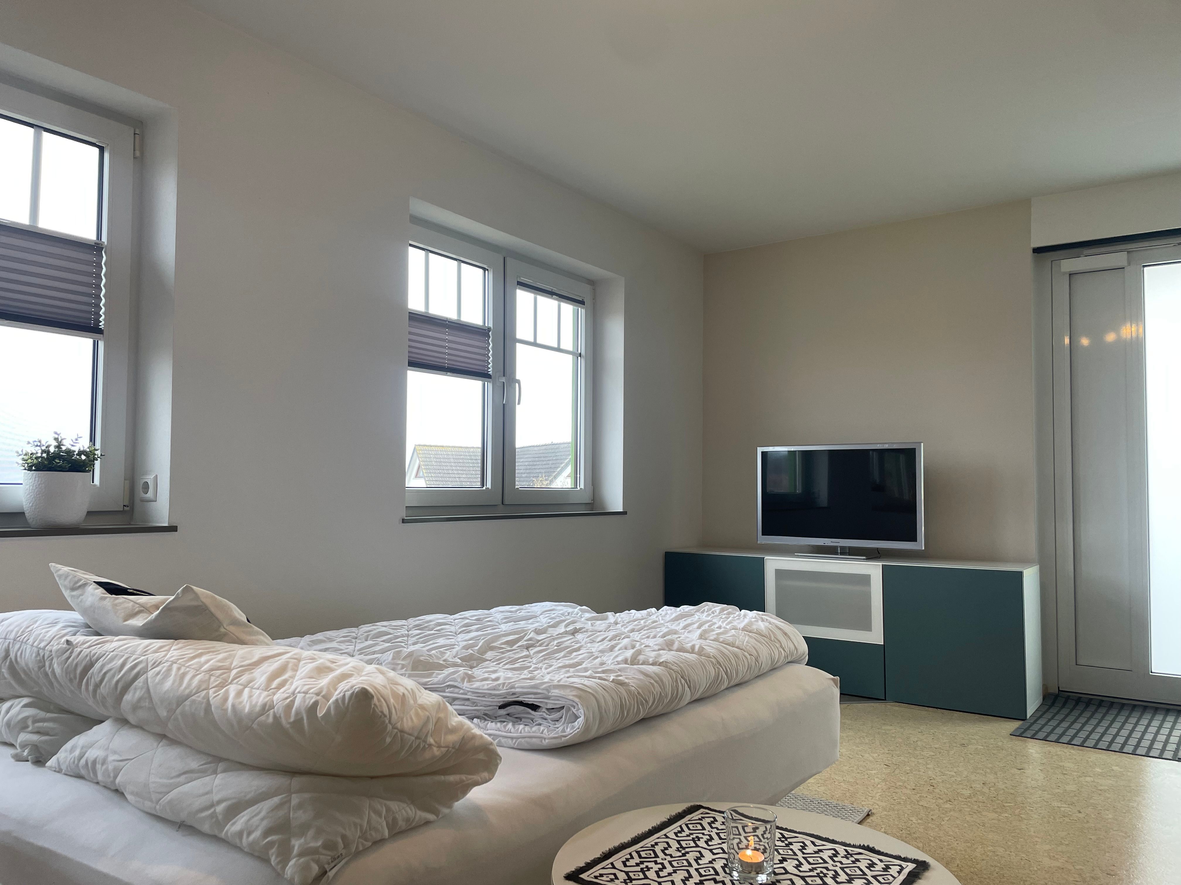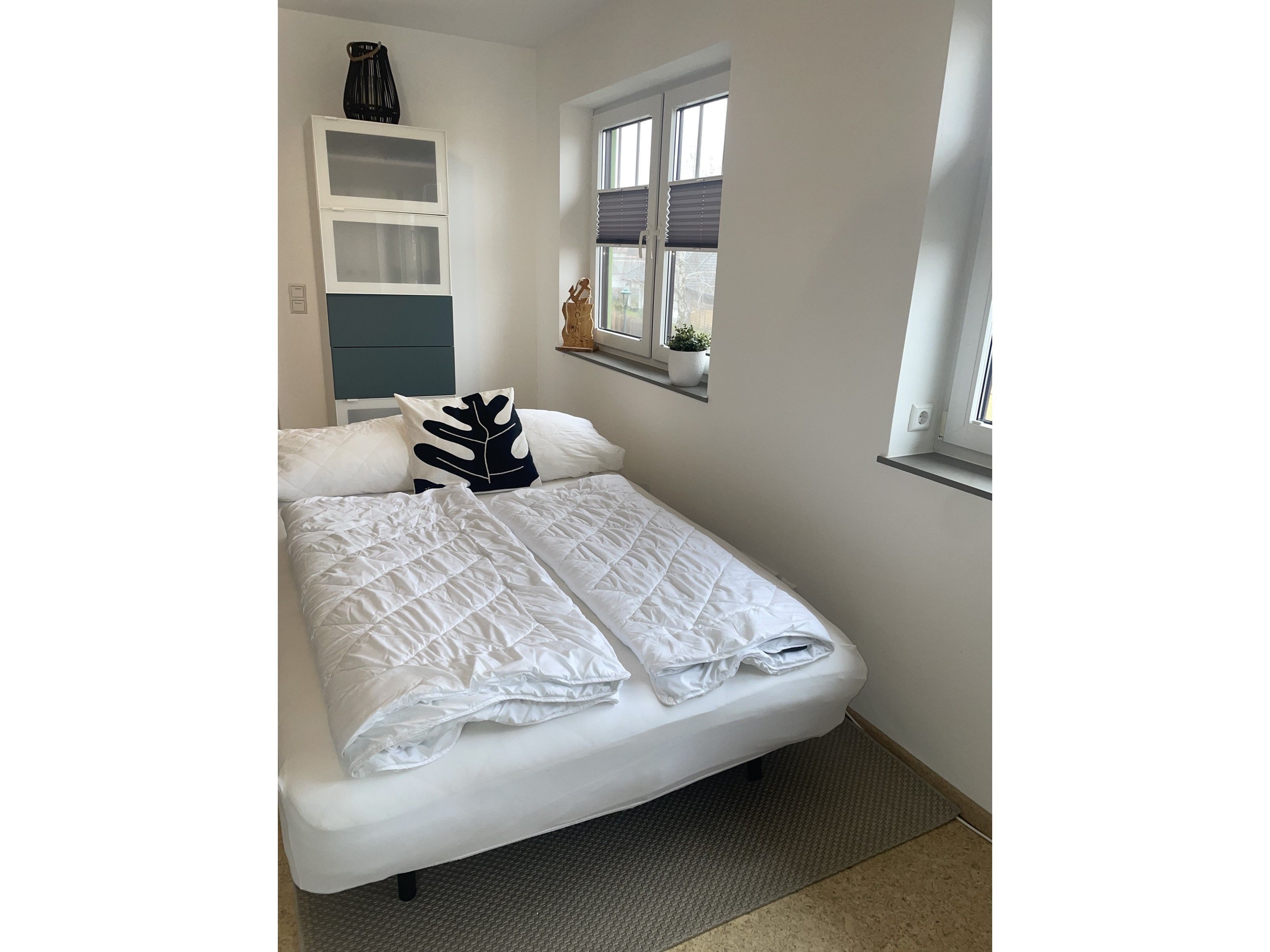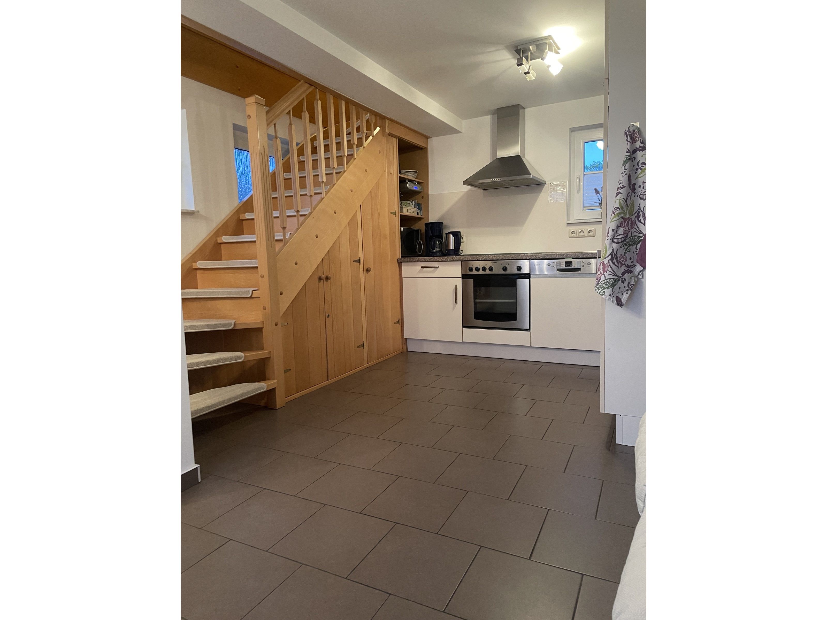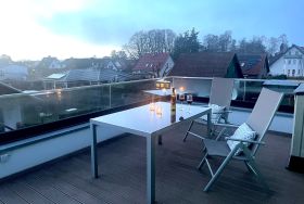 Die helle, mit Liebe zum Detail eingerichtete 1-Raum-Ferienwohnung erreichen Sie über einen separaten Zugang über die Treppe, direkt über die große Dachterrasse. Sie ist ausgestattet mit einer gemütlichen Schlafcouch (1,40x2,00m Liegefläche), Fernsher und einem Essplatz für 2 Personen. Die offene Einbauküche verfügt über einen Backofen, Herd, Kühlschrank mit Gefrierfach, Toaster, Wasserkocher, Kaffeemaschine und Spülmaschine. Das Badezimmer ist mit einer Badewanne mit Duschfunktion ausgestattet. Dort gibt es eine Fußbodenheizung.