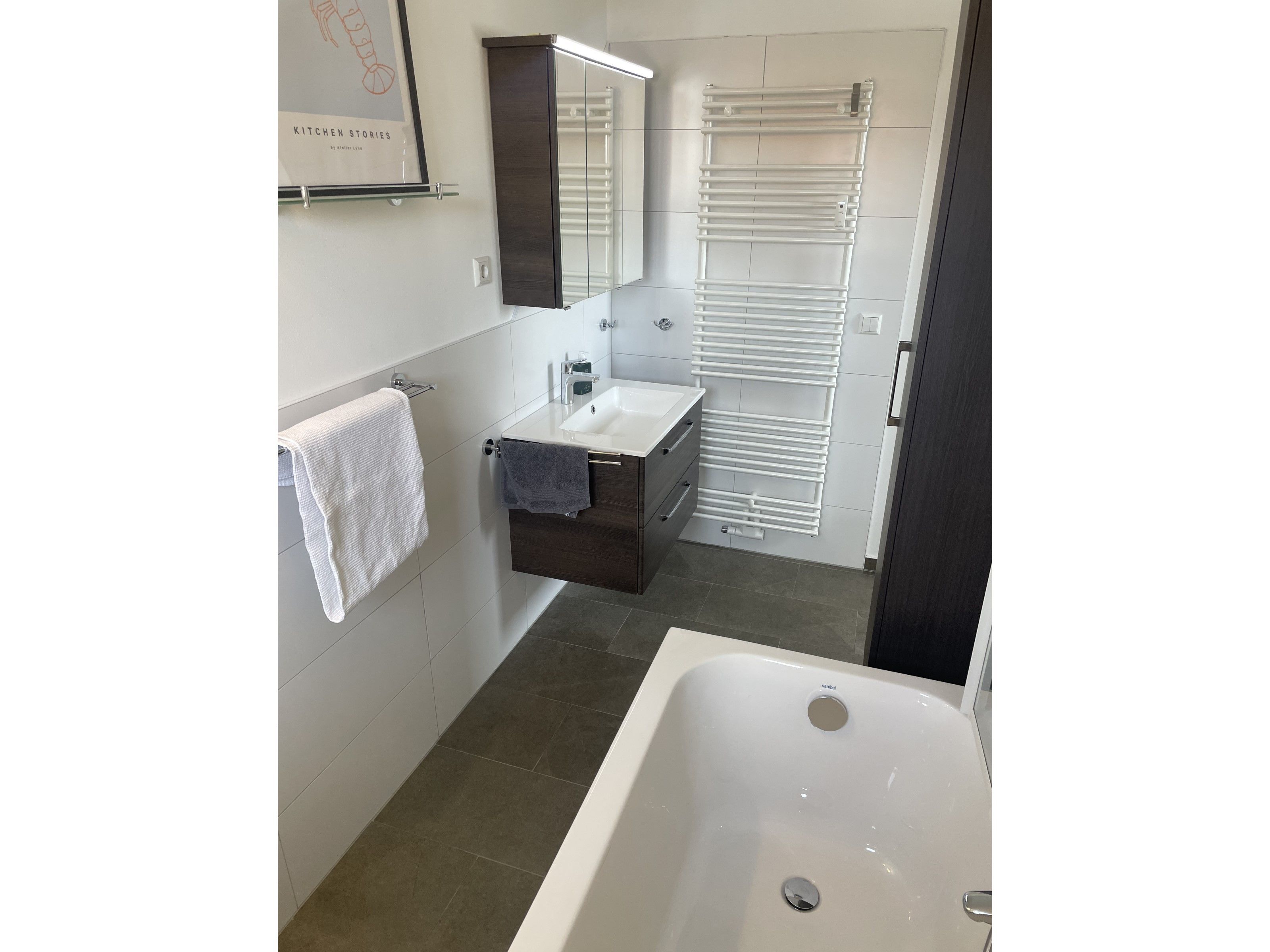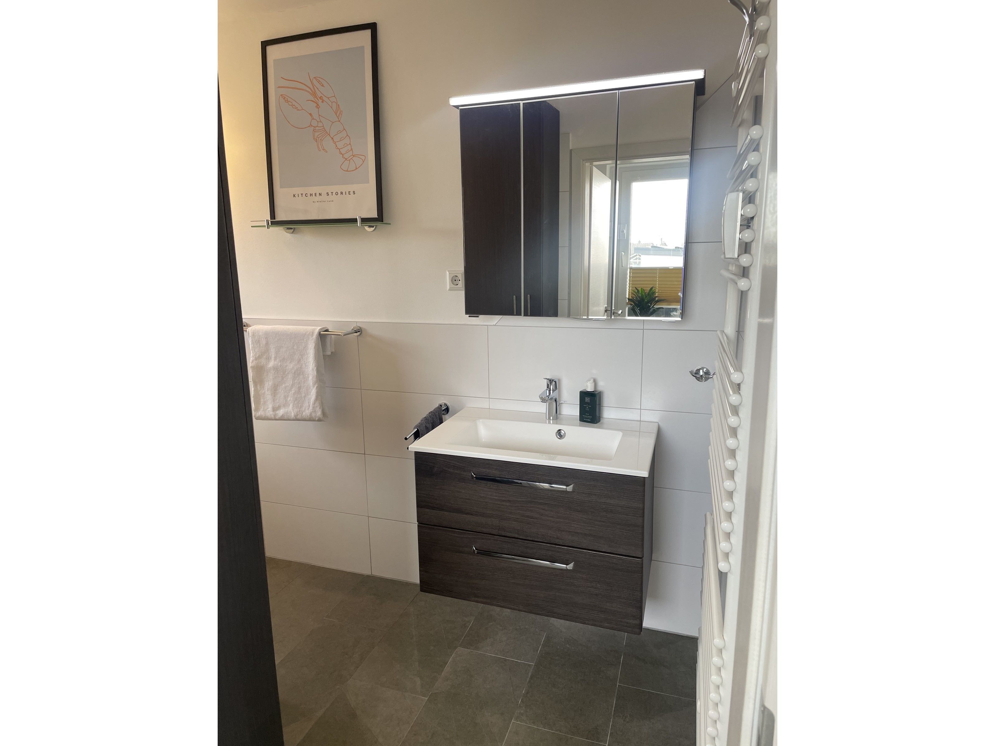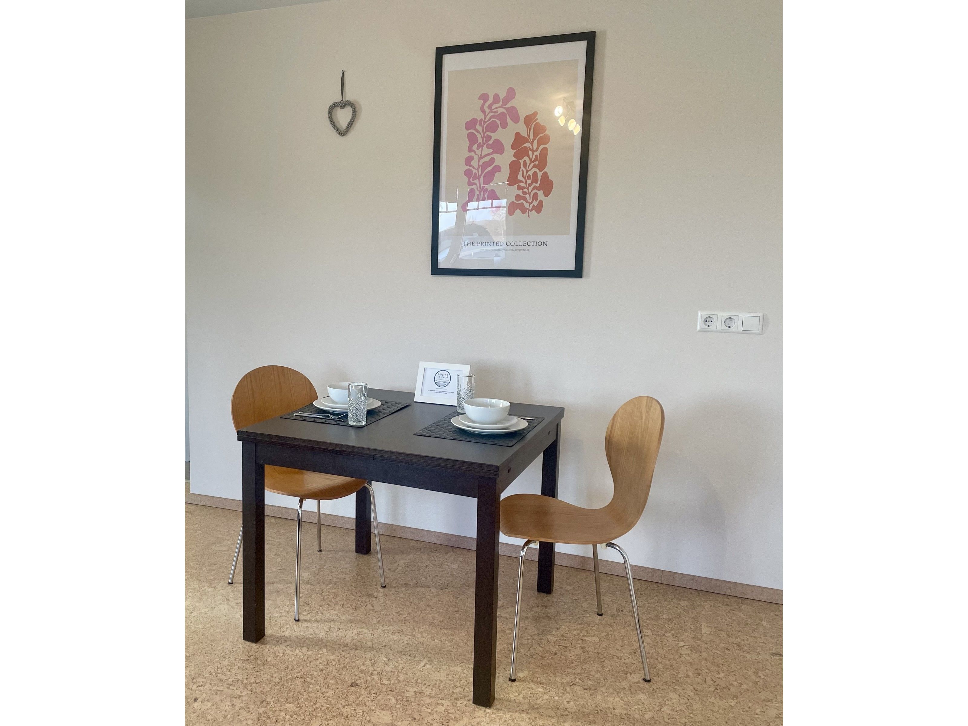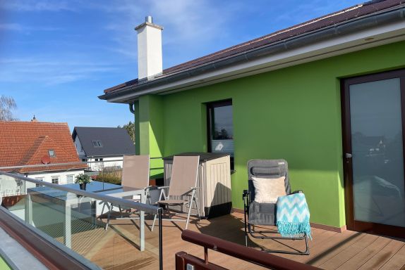 Die helle, mit Liebe zum Detail eingerichtete 1-Raum-Ferienwohnung erreichen Sie über einen separaten Zugang über die Treppe, direkt über die große Dachterrasse. Sie ist ausgestattet mit einer gemütlichen Schlafcouch (1,40x2,00m Liegefläche), Fernsher und einem Essplatz für 2 Personen. Die offene Einbauküche verfügt über einen Backofen, Herd, Kühlschrank mit Gefrierfach, Toaster, Wasserkocher, Kaffeemaschine und Spülmaschine. Das Badezimmer ist mit einer Badewanne mit Duschfunktion ausgestattet. Dort gibt es eine Fußbodenheizung.
