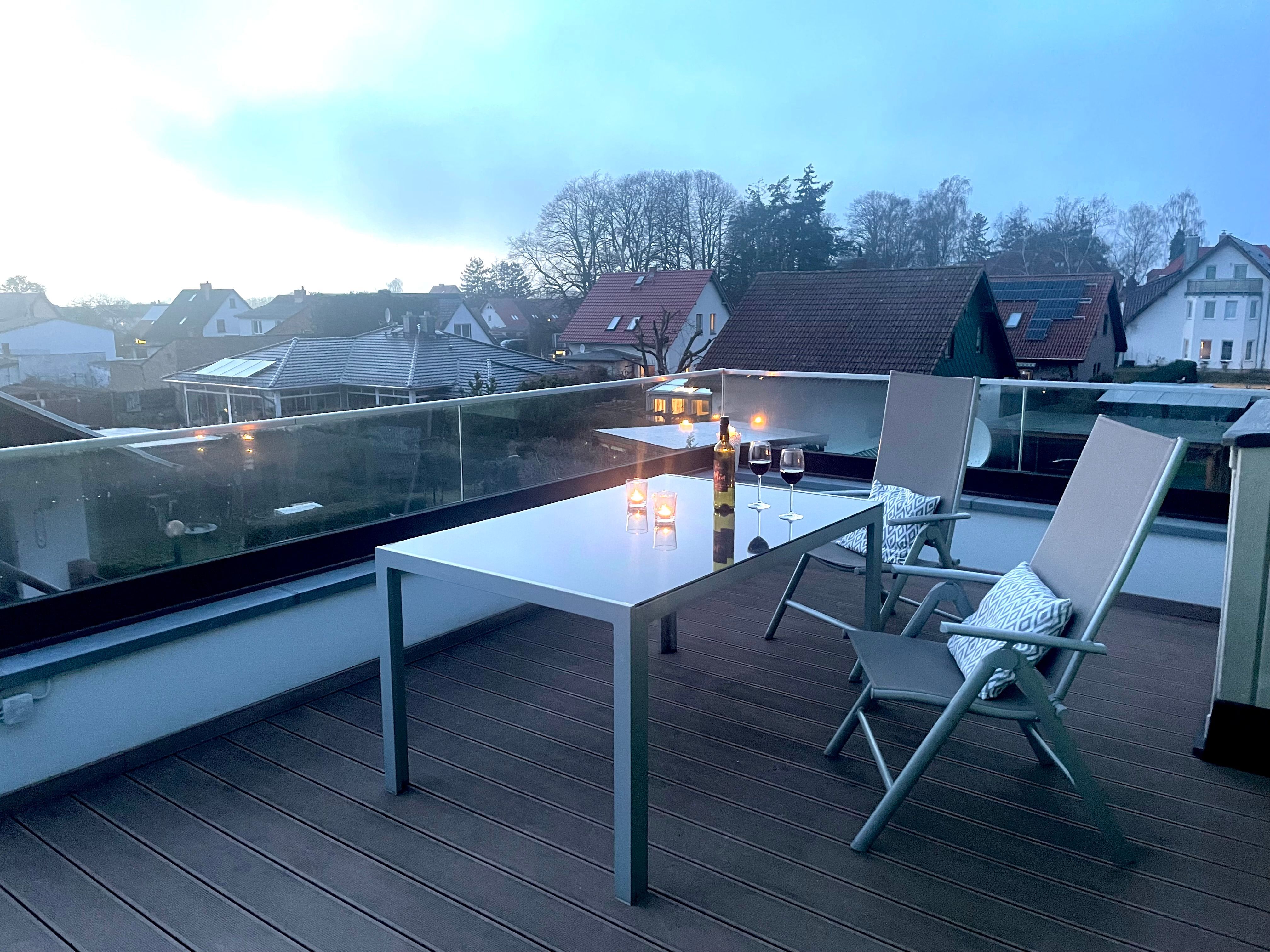 Die sonnige, 18 qm große Dachterrasse ist perfekt für ein Frühstück in der Sonne, entspannte Stunden oder einen romantischen Abend bei Sonnenuntergang.