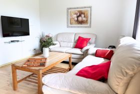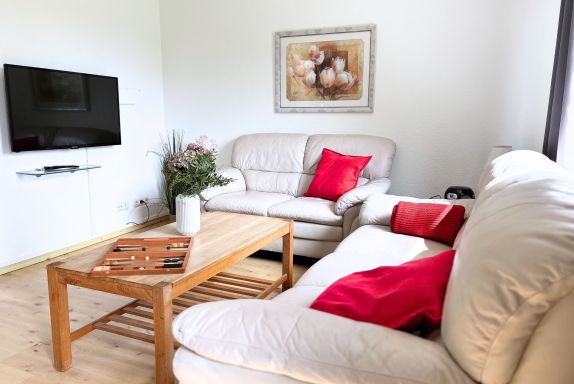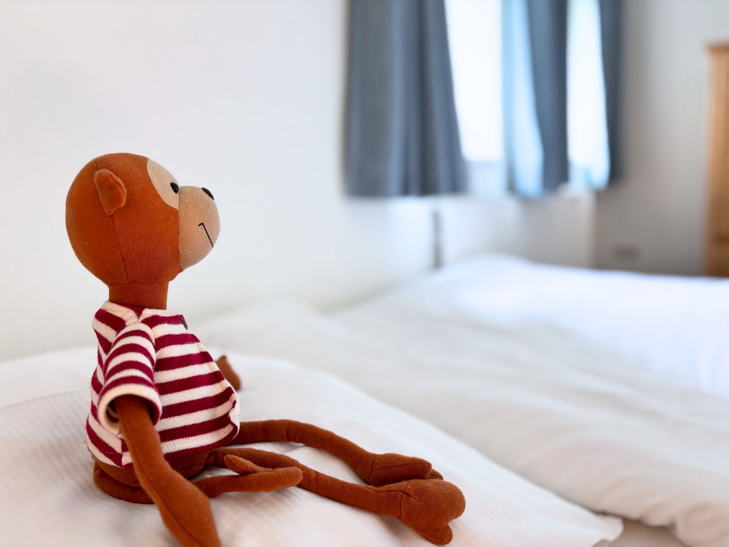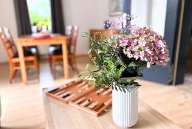 Max Bienenwachs befindet sich im rechten Teil des Backhauses und ist super gemütlich. Die Ferienwohnung für bis zu vier Personen hat eine kleine Küche, ein helles Wohnzimmer mit Südterrasse und zwei Schlafzimmer sowie ein Badezimmer mit Dusche im Obergeschoss. Es gibt ein Zimmer mit Doppelbett und ein Zimmer mit zwei Einzelbetten.