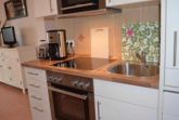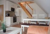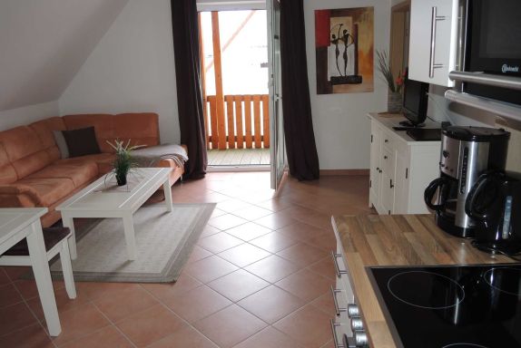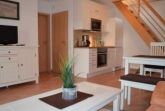 Unsere Suite Lisa mit Balkon ist modern und gemütlich eingerichtet. Die Suite ist mit *** Sternen klassifiziert. Die Küche ist in den Wohn- und Essbereich integriert. Von dort gelangt man direkt auf den Balkon.