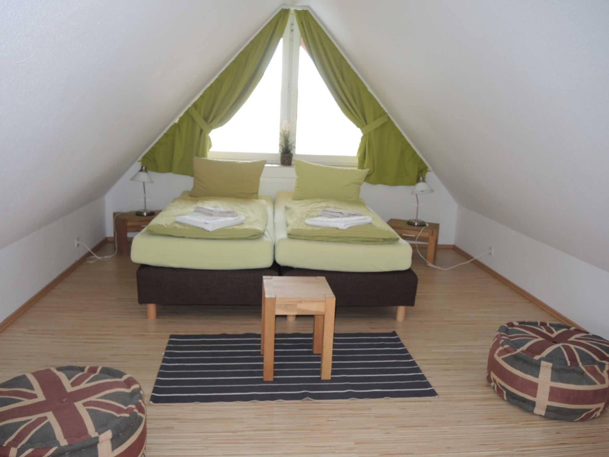 Über eine Treppe gelangt man ins Studio, das mit einem weiteren Doppelbett zwei zusätzliche Schlafplätze bietet.