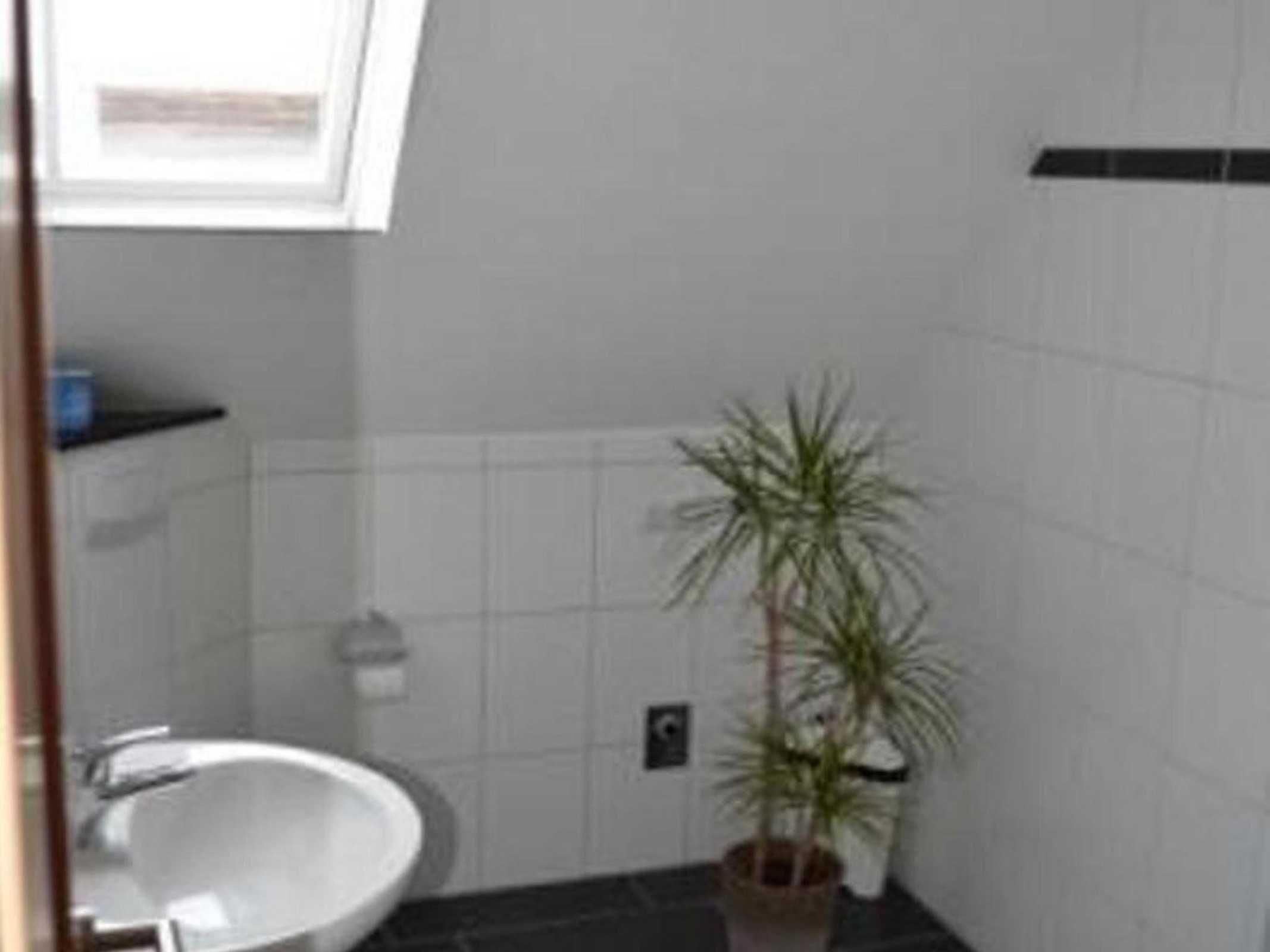 Das Badezimmer im Obergeschoss ist mit Waschbecken und Dusche ausgestattet.