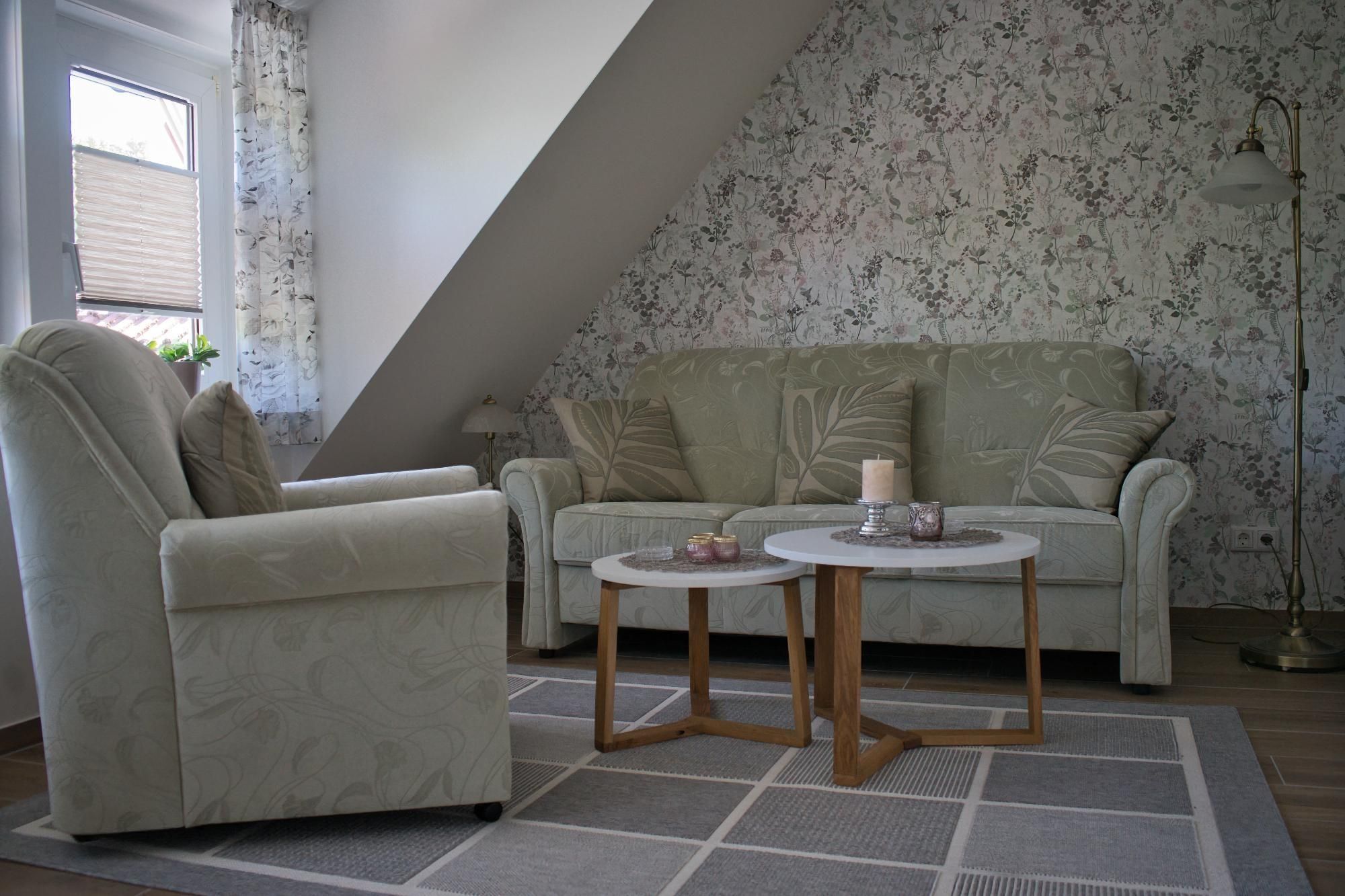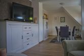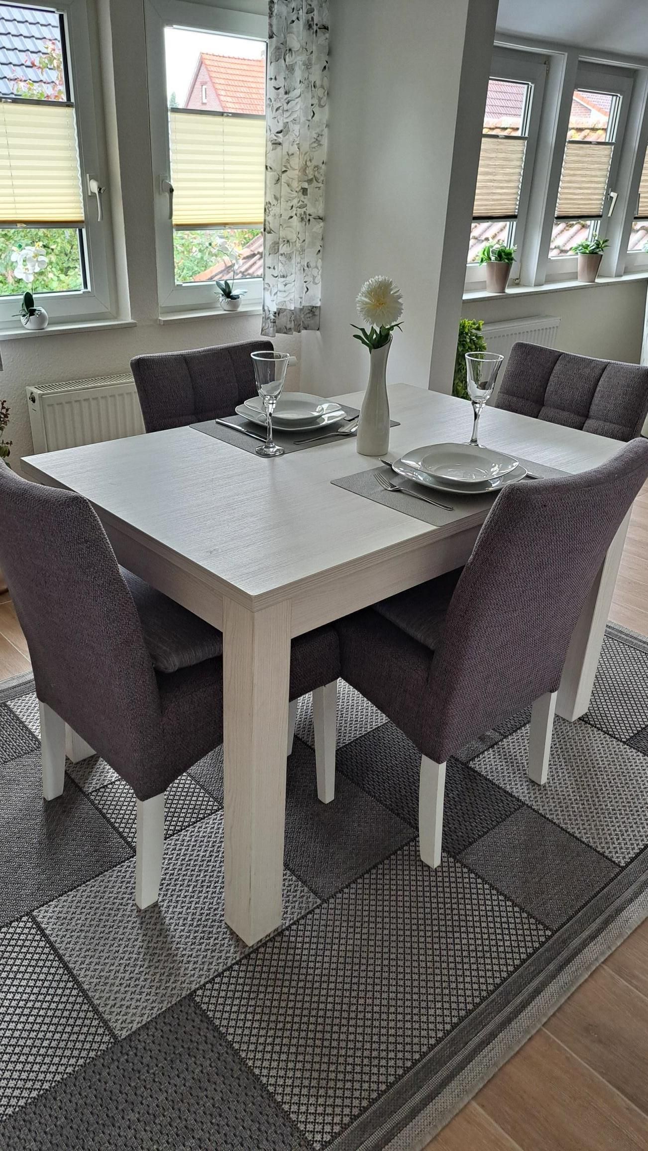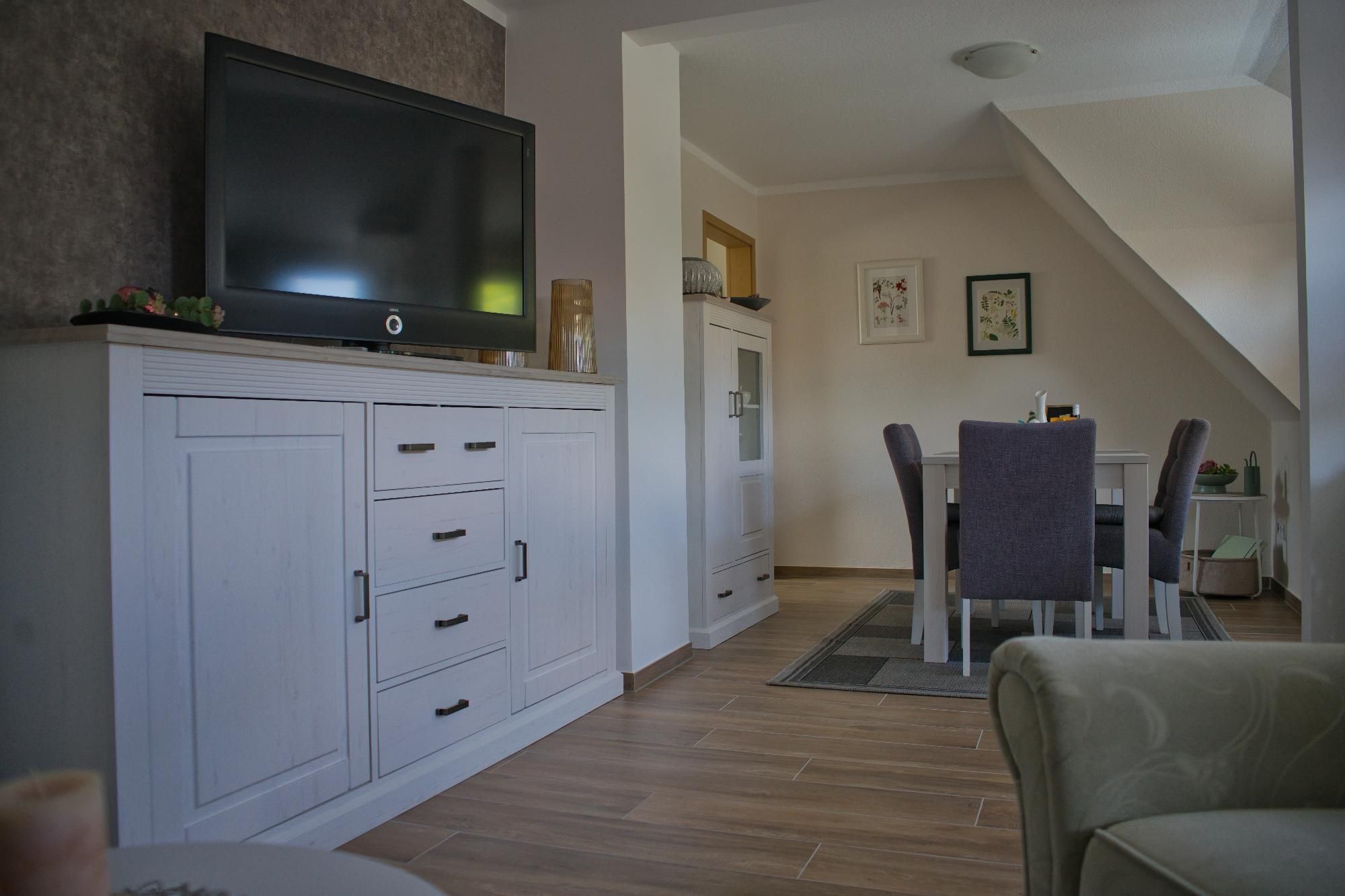 Der offene Wohnbereich verleiht der Wohnung eine gemütliche Atmosphäre. Dort erwartet Sie eine liebevoll eingerichtete Sitzgruppe mit TV und einem einladenden Essbereich. Angrenzend finden Sie eine voll ausgestattete Küche mit Zugang zum großräumigen Balkon, der eine Aussicht auf den schönen Garten bietet.