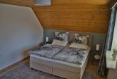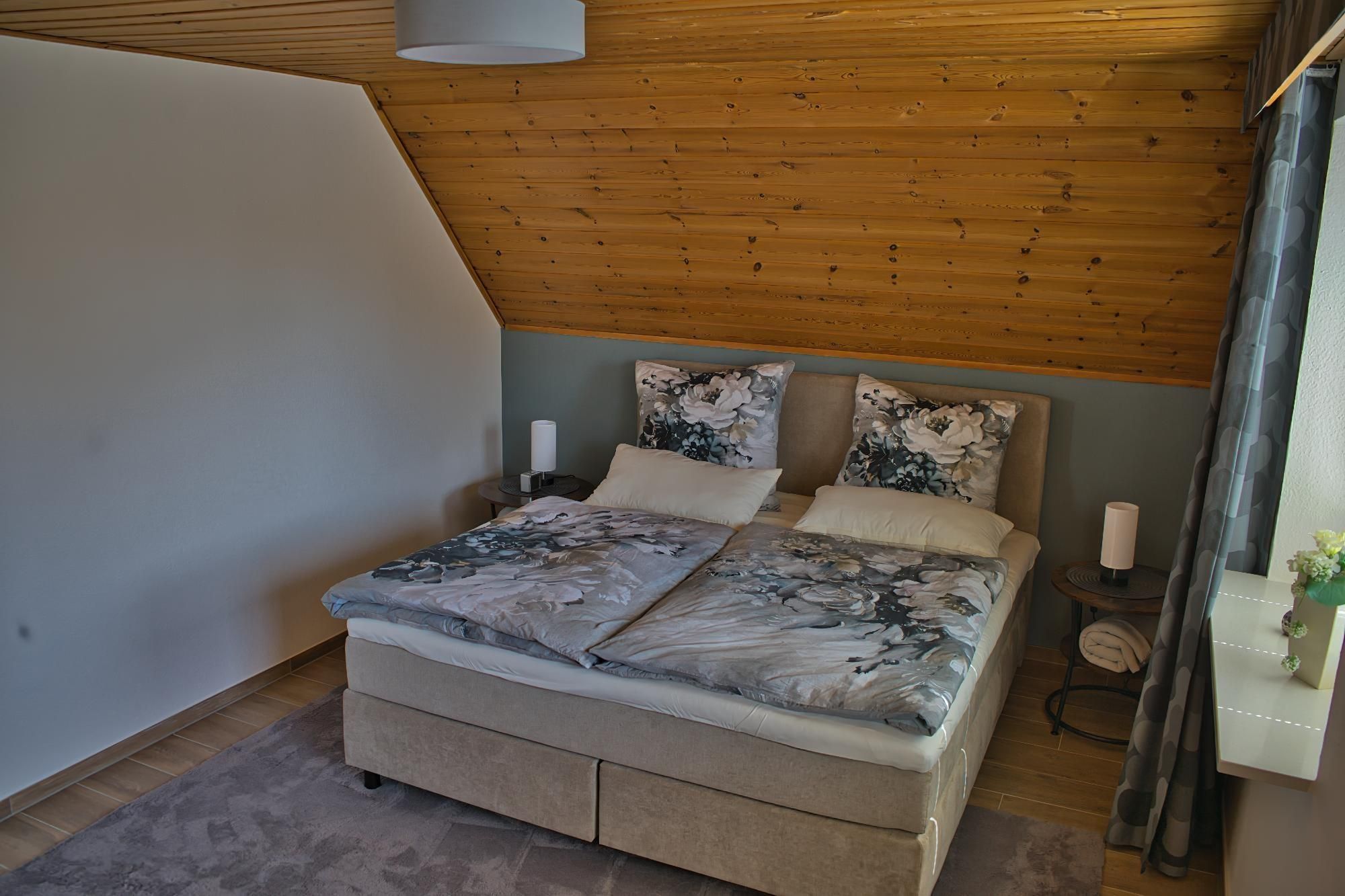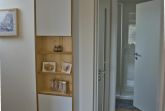 Das Schlafzimmer verfügt über ein großes und komfortables Doppelbett mit einem großzügigen Kleiderschrank. Gegenüber befindet sich das moderne Badezimmer, welches eine ebenerdige Dusche beinhaltet.