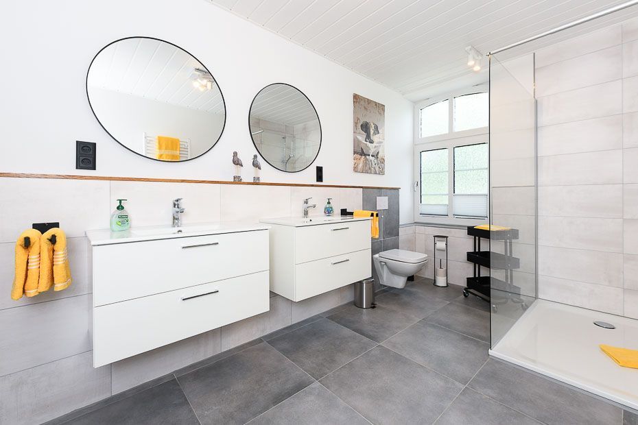 Badezimmer mit Doppel-Waschbecken, Dusche und WC