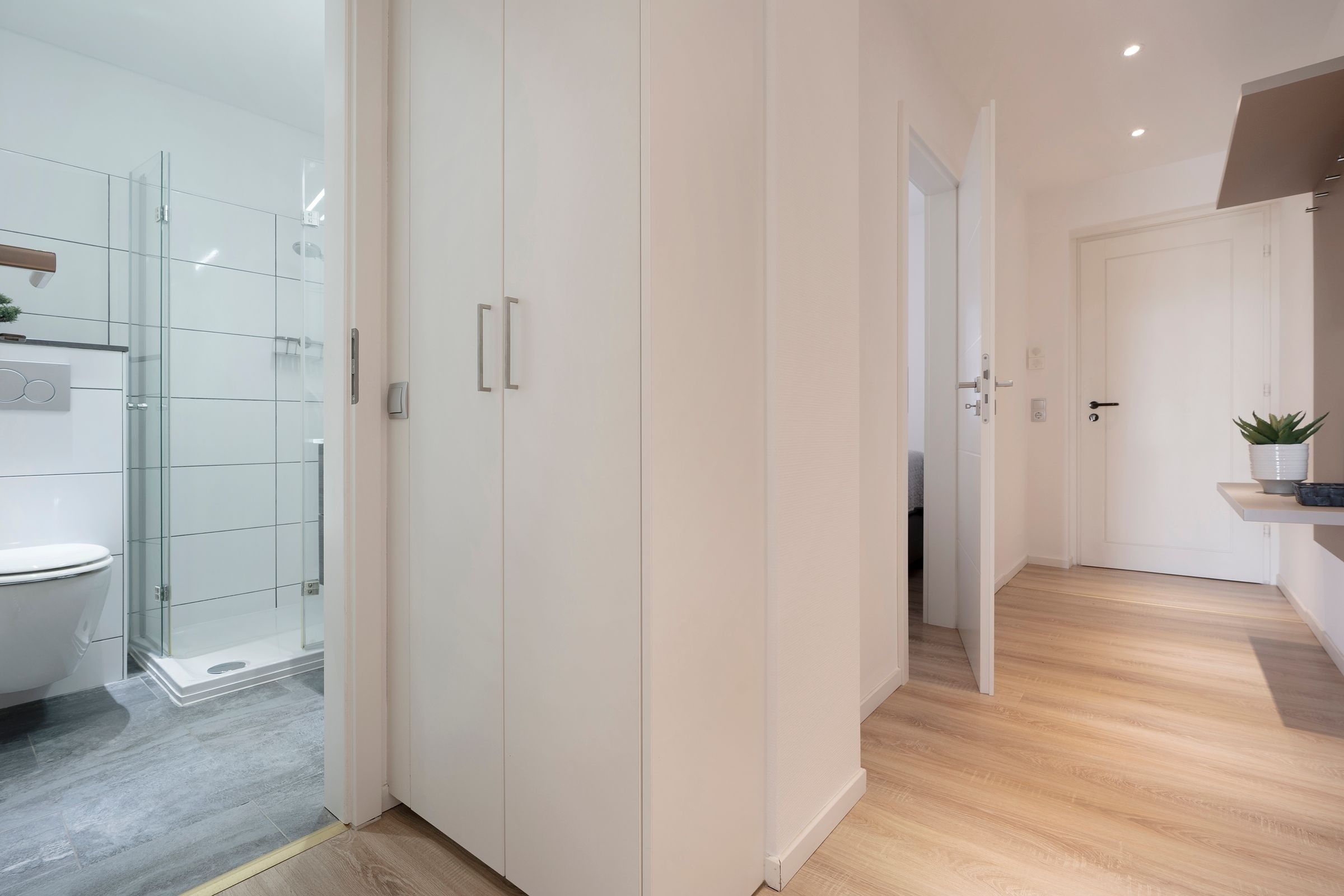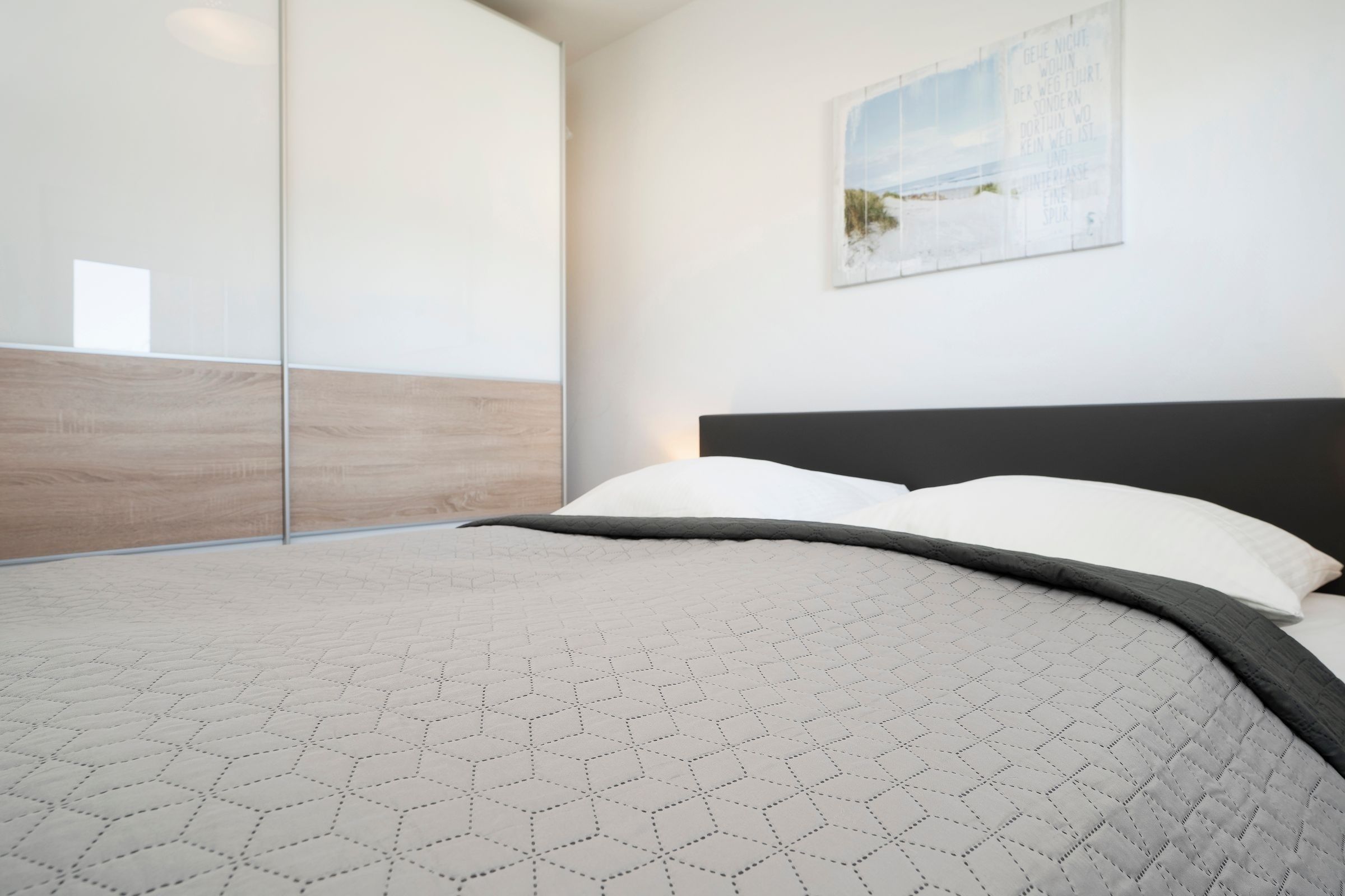 Entspannen Sie sorglos nach Ihrem Strandtag im separaten Schlafzimmer mit komfortablem Boxspring-Bett (160x200cm). Außenjalousien bieten Ihnen Verdunklungsmöglichkeit für tiefen Schlaf und der geräumige Kleiderschrank offeriert ausreichend Platz für Ihre Urlaubsgarderobe. Auch das Bad begeistert mit wertiger Moderne und Annehmlichkeiten wie einer großzügigen Eckdusche mit niedrigem Einstieg, einem Waschtisch, WC und Handtuchheizung.
