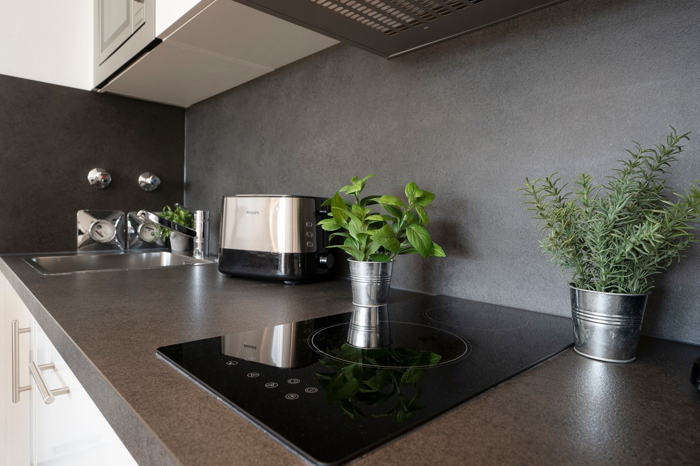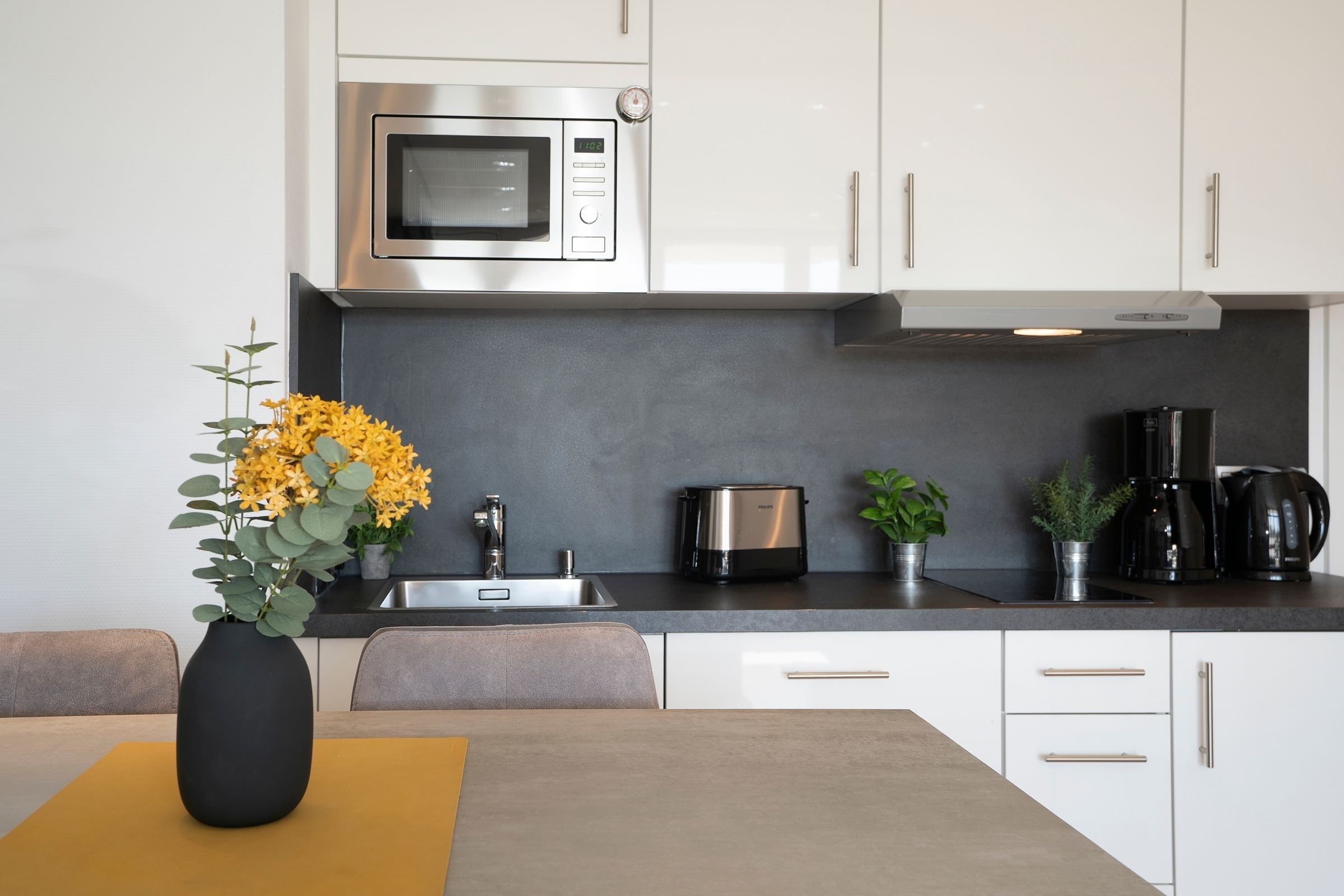 Die moderne, gut ausgestattete Küche ist offen gestaltet und perfekt in den Wohnraum integriert. Der angrenzende Essplatz ist für bis zu 4 Personen ausgerichtet. Bereiten Sie hier problemlos Ihre Mahlzeiten zu und genießen Sie gesellige Kochabende mit Freunden und Familie.