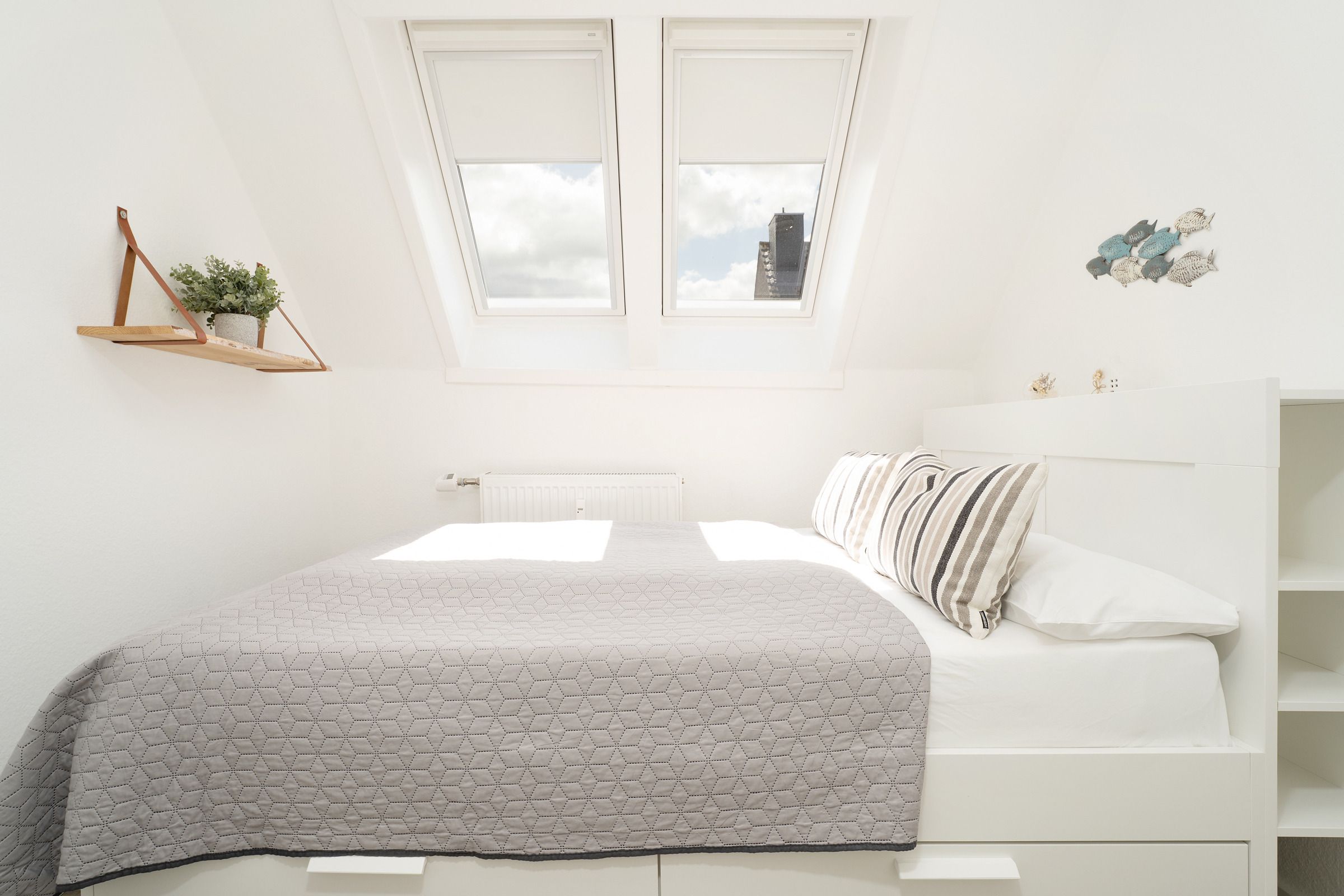 Schlafzimmer 2: Doppelbett (ca. 140x200cm), Kleiderschrank, Verdunkelung (Rollo), kein Platz für Kinderreisebett vorhanden