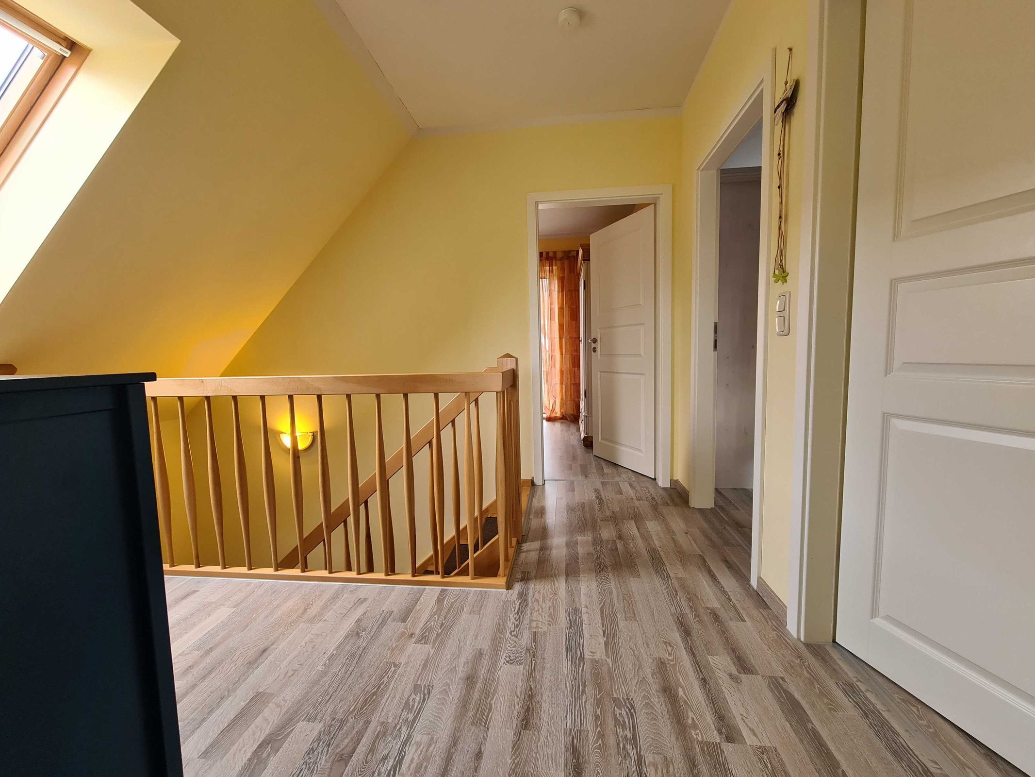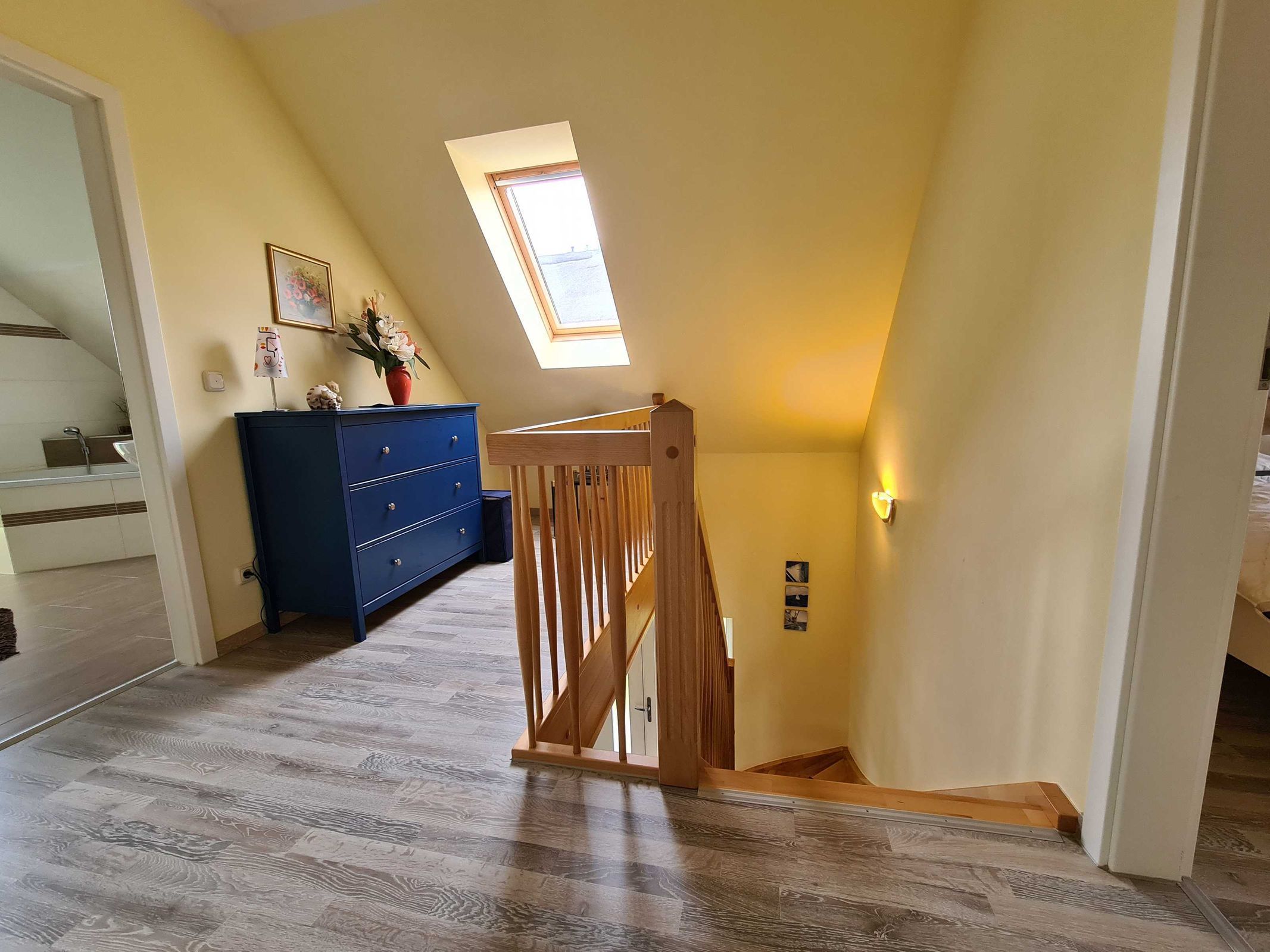 Im Obergeschoß gibt es insgesamt 3 Schlafzimmer (davon bieten zwei Schlafräume genügend Platz zum Aufstellen eines kostenlosen Baby-Reisebettchens- ohne Kinderbettwäsche. Das großzügiges Badezimmer auf dieser Etage verfügt über eine Dusche, Badewanne und WC. Der Wohn-/ Küchenbereich ist mit Fußbodenheizung ausgestattet.