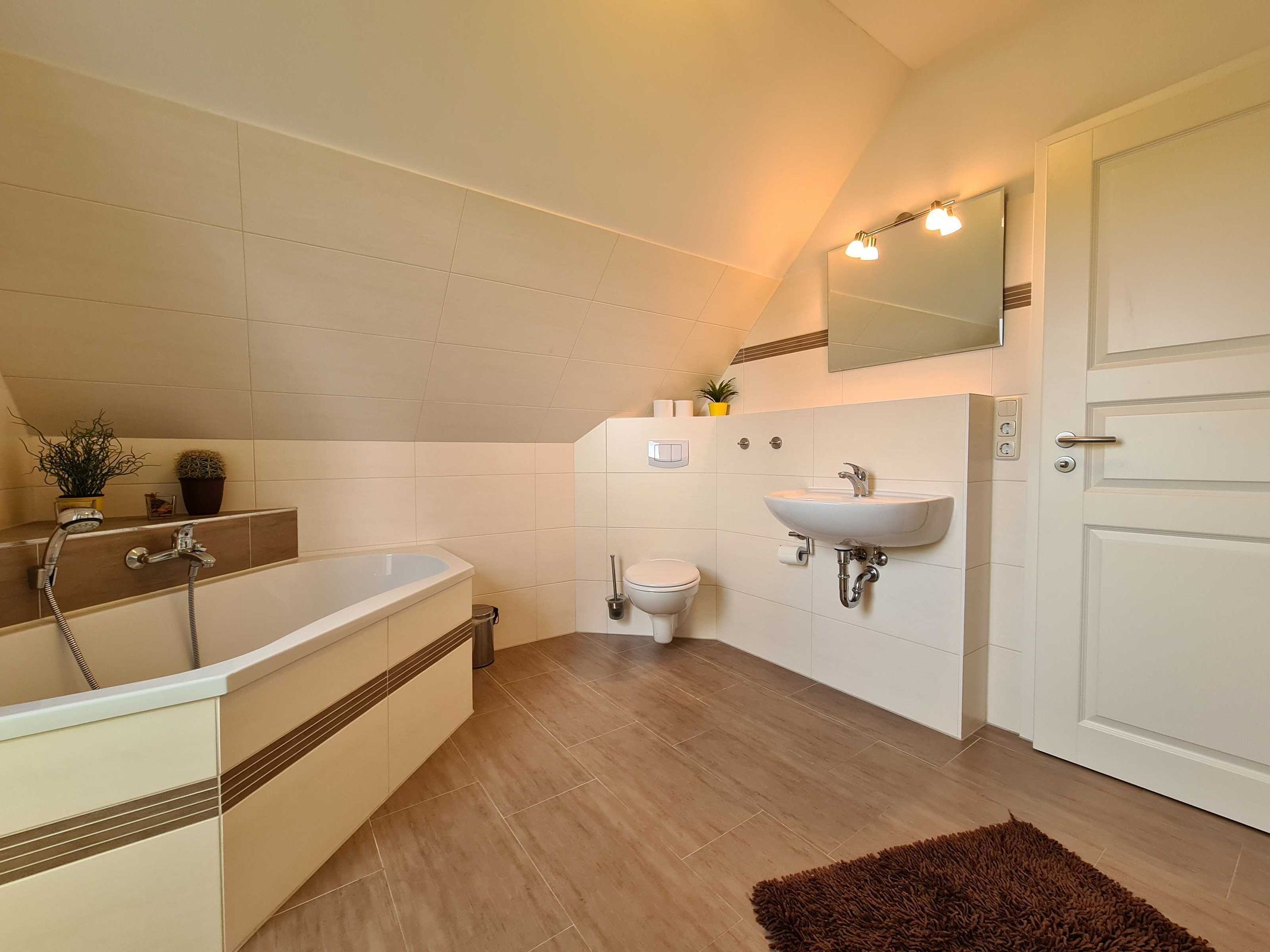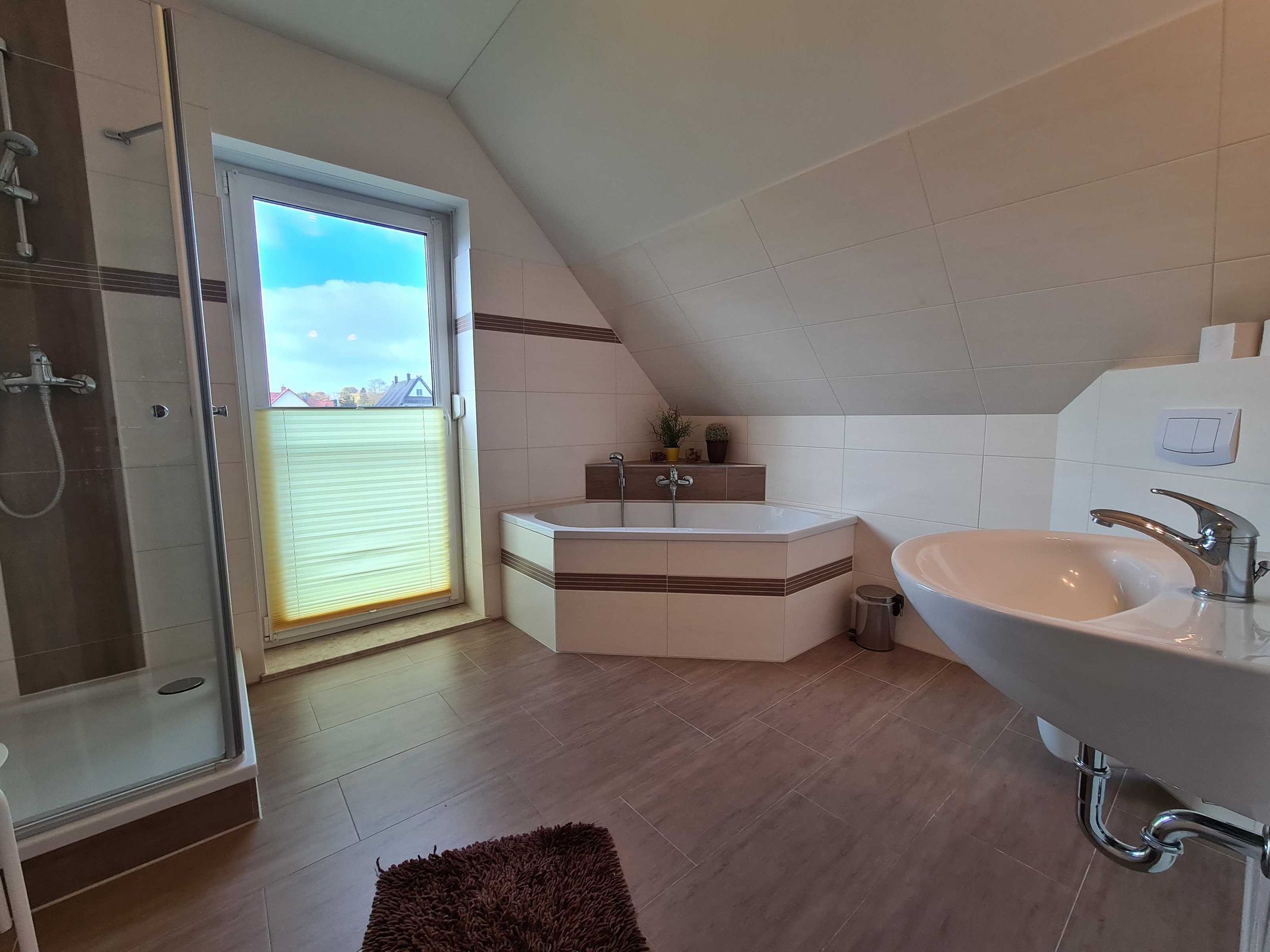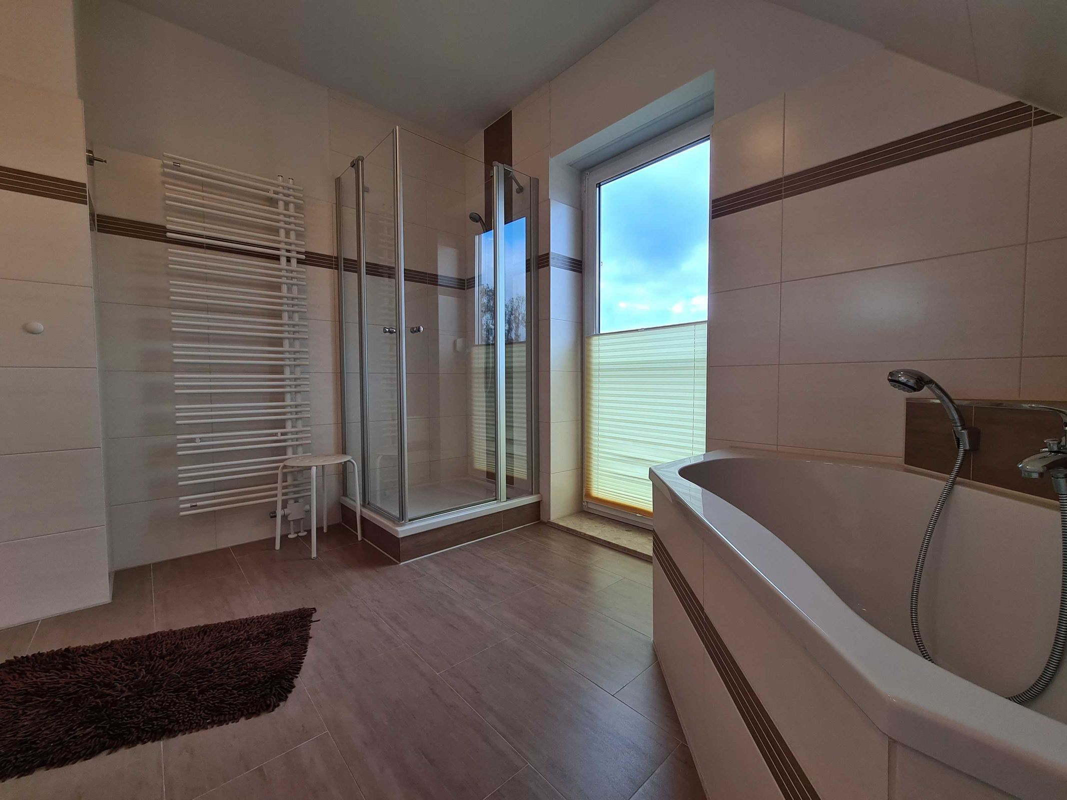 Großzügiges Badezimmer mit Dusche, Badewanne und WC.